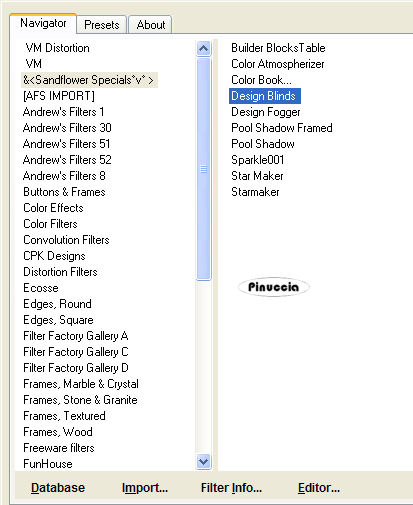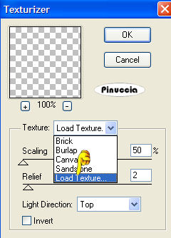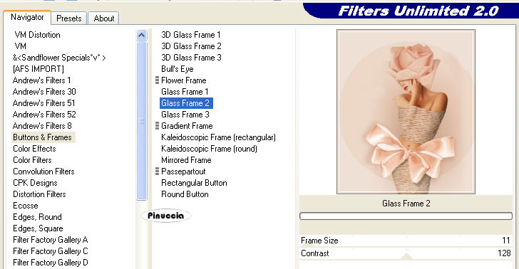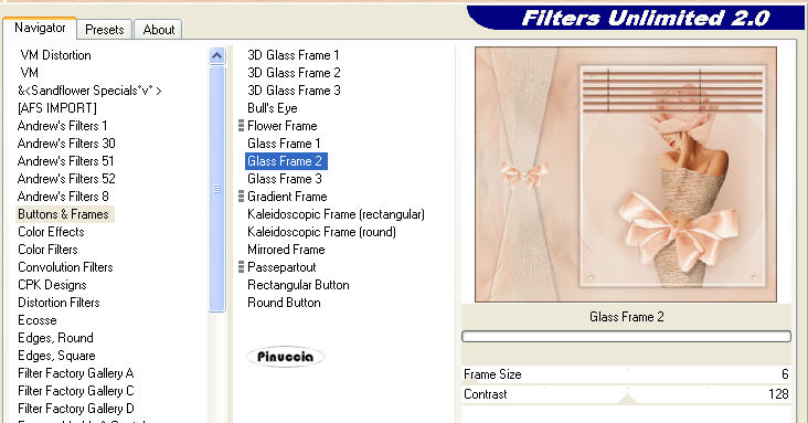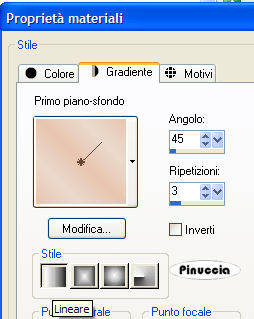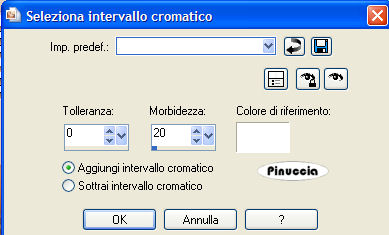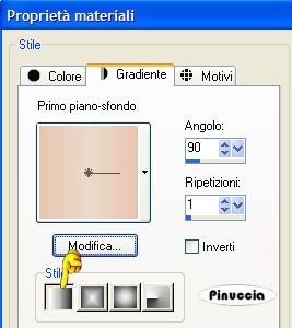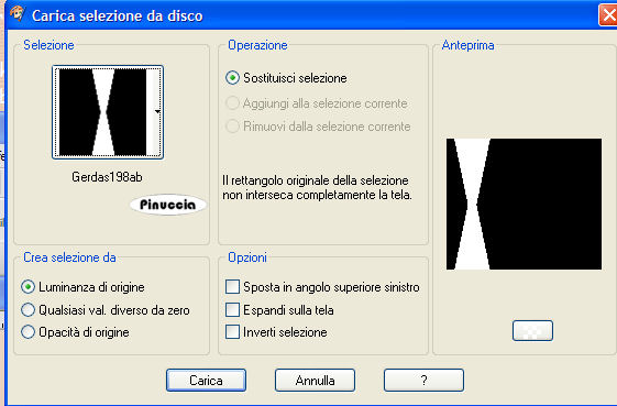 qui puoi trovare qualche risposta ai tuoi dubbi. Se l'argomento che ti interessa non è presente, ti prego di segnalarmelo. Questo tutorial è stato scritto con PSP 9, ma può essere eseguito anche con le altre versioni di PSP. Materiale qui L'immagine nello zip viene da Picture Store Metti la Selezione nella cartella selezioni. Filtri: Filters Unlimited qui Simple qui Texturizer qui Filter Sandflower qui il filtro Sandflower deve essere importato nel Filtro Unlimited. Come fare vedi qui 1. Apri una nuova immagine trasparente 650 x 550 pixels. Imposta il colore di primo piano con #e8c5af, e il colore di sfondo con #eadacb. Passa il colore di primo piano a Gradiente di primo piano/sfondo, lineare, con i seguenti settaggi: ![]() Riempi l'immagine con il gradiente.Livelli>Nuovo livello raster. Selezione>Carica/Salva selezione>Carica selezione da disco: cerca e carica la selezione Gerda198ab: ![]() Riempi la selezione con il colore chiaro.Il colore chiaro è impostato come colore di sfondo, quindi devi cliccare con il tasto destro del mouse. Selezione>Nessuna selezione. Apri il Motivo gerdapsdpattern43.jpg. File>Salva con nome... e salvalo in formato psd (perchè altrimenti non potresti usarlo con il filtro Texturizer): ![]() Effetti>Plugins>Texture - Texturizer: Apri il menu Texture, cliccando sulla freccia a fianco del box, selezione Load texture, cerca il motivo che hai appena salvato e selezionalo. Il filtro lo caricherà. Clicca ok. ![]() Effetti>Effetti 3D>Smusso a incasso: ![]() Effetti>Effetti 3D>Sfalsa ombra, con i seguenti settaggi, colore #663d26. ![]() ![]() 2. Apri il tube gerdastrikjannie e vai a Modifica>Copia. Torna al tuo lavoro e vai a Modifica>Incolla>Incolla come nuovo livello. Spostalo al centro della selezione.Apri il tube Parel9 e vai a Modifica>Copia. Torna al tuo lavoro e vai a Modifica>Incolla>Incolla come nuovo livello. Spostalo al centro del fiocco.Regola>Messa a fuoco>Metti a fuoco. Apri l'immagine della donna 004(02). Immagine>Ridimensiona, all'80%, ricampionamento bicubica, tutti i livelli selezionato. ![]() Effetti>Plugins>Filters Unlimited - Buttons en frames - Glass frame 2 (11/128). ![]() Apri nuovamente il tube della perla (Parel9) e vai a Modifica>Copia. Torna alla piccola immagine e vai a Modifica>Incolla>Incolla cme nuovo livello. Sposta la perla nell'angolo in alto a sinistra.Regola>Messa a fuoco>Metti a fuoco. Effetti>Plugins>Simple - Top left mirror, e clicca ok. Livelli>Unisci>Unisci tutto. Modifica>Copia. Torna alla tua immagine principale e vai a Modifica>Incolla>Incolla come nuovo livello. Posiziona l'immagine a desta.Effetti>Effetti 3D>Sfalsa ombra, con i seguenti settaggi, colore #663d26. ![]() Livelli>Unisci>Unisci visibile. 3. Apri il tube gerdaeffect 245 (i livelli sono chiusi). Apri i livelli, posizionati sul livello del tube e vai a Modifica>Copia. Torna al tuo lavoro e vai a Modifica>Incolla>Incolla come nuovo livello. Sposta il tube in basso e un po' all'esterno,dovresti avere qualcosa di simile: ![]() Livelli>Duplica. Immagine>Capovolgi. Sposta il duplicato in alto:Livelli>Unisci>Unisci visibile. 4. Imposta il colore di primo piano sul bianco. Livelli>Nuovo livello raster. Attiva lo strumento Selezione , rettangolo,e disegna un rettangolo come nell'esempio sotto: ![]() Riempi la selezione con il bianco.Effetti>Plugins>Filters Unlimited - SandFlower - Design Blinds: ![]() Lascia i settaggi come stanno e clicca ok. Selezione>Nessuna selezione. Attiva lo strumento Bacchetta magica ,e clicca in una sezione bianca. Selezione>Modifica>Seleziona intervallo cromatico: ![]() Avrai questo: ![]() Premi sulla tastiera il tasto CANC. ![]() Selezione>Nessuna selezione. Regola>Saturazione e tonalità>Viraggio: ![]() Attiva lo strumento Deformazione ![]() e "tira" un po' le stecche in modo che rimangano all'interno della cornice. ![]() Livelli>Unisci>Unisci visibile. Effetti>Plugins>Filters Unlimited - Buttons & frames - Glass Frame 2 (6.128). ![]() 6. Imposta il colore di primo piano con #e8c5af e il colore di sfondo con #eadacb. Passa il colore di primo piano a Gradiente di primo piano/sfondo, lineare, con i seguenti settaggi: ![]() Livelli>Nuovo livello raster. Attiva lo strumento Selezione , rettangolo,e traccia un rettangolo, come mostrato nell'esempio: ![]() Riempi la selezione con il gradiente.Selezione>Nessuna selezione. Attiva lo strumento Deformazione ![]() Tenendo premuto il tasto shift, comincia dall'angolo a destra in basso o da sinistra, e sposta il lato del rettangolo all'interno: ![]() Effetti>Effetti 3D>Sfalsa ombra, con i seguenti settaggi, colore #663d26. ![]() Apri il tube dei fiori e vai a Modifica>Copia. Torna al tuo lavoro e vai a Modifica>Incolla>Incolla come nuovo livello. Posiziona i fiori sopra la forma del vaso.Livelli>Unisci>Unisci visibile. 7. Aggiungi il tuo nome all'immagine. Io ho usato Sloop Script con il colore di sfondo #e3b494. Livelli>Nuovo livello raster. Apri ancora una volta il tube parel9. File>Esporta>come pennello personalizzato. Attiva lo strumento pennello ![]() Scala 50 e applica le perle sull'immagine a destra vedi l'esempio finale. Regola>Messa a fuoco>Metti a fuoco. Livelli>Unisci>Unisci tutto. ![]() Se hai problemi o dubbi, o trovi un link non funzionante, o anche soltanto per un saluto, scrivimi 6 Marzo 2007 |