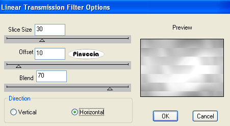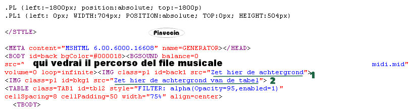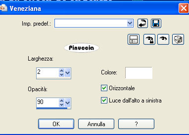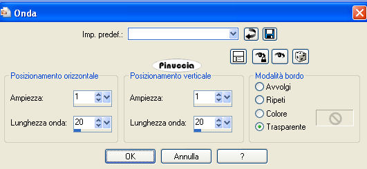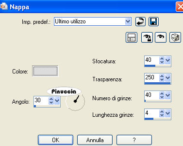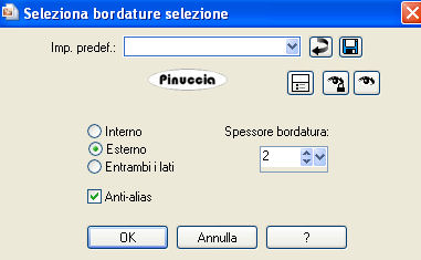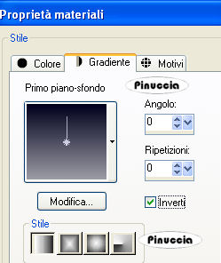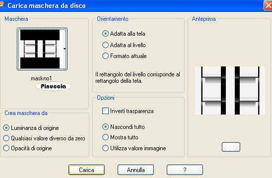 qui puoi trovare qualche risposta ai tuoi dubbi. Se l'argomento che ti interessa non è presente, ti prego di segnalarmelo. Questo tutorial è stato scritto in PSP 9, ma può essere eseguito con qualsiasi versione del programma. Occorrente: Materiale qui Il tube è di Yvonne e la maschera di No. Metti la maschera nella cartella Maschere. Apri il font Fleur Black e minimizzalo. Lo troverai nella lista dei font disponibili, quando ti servirà. Filtri: Greg's Factory Output II qui DSB Flux qui Imposta il colore di primo piano con #00001C, e il colore di sfondo con #9B9BA4. 1. Apri una nuova immagine trasparente 650 x 450 pixels, e riempila con il colore di primo piano.2. Livelli>Nuovo livello raster. Riempi il livello con il colore di sfondo.3. Livelli>Carica/Salva maschera>Carica maschera da disco. Cerca e carica la maschera Maskno1. ![]() 4. Livelli>Elimina e rispondi sì alla domanda Unire la maschera nel livello corrente. ![]() Livelli>Unisci>Unisci gruppo. 5. Livelli>Unisci>Unisci tutto. 6. Livelli>Nuovo livello raster. Imposta il colore di primo piano con #c0c0c0 e riempi il livello con questo colore.7. Effetti>Plugins>Greg's Factory Output II - Poolshadow, con i seguenti settaggi. ![]() 8. Effetti>Plugins>DSB Flux - Linear Transmission, con i seguenti settaggi: ![]() 9. Effetti>Effetti di trama>Veneziana: ![]() 10. Nella paletta dei livelli abbassa l'opacità di questo livello al 60%. Livelli>Unisci>Unisci tutto. 11. Immagine>Aggiungi bordatura, 1 pixel, simmetriche, con il colore di sfondo. Immagine>Aggiungi bordatura, 25 pixels, simmetriche, con il colore di primo piano. 12. Apri il tube della donna. Immagine>Ridimensiona, a 500 pixels di altezza. Modifica>Copia. Torna al tuo lavoro e vai a Modifica>Incolla come nuovo livello. Sposta il tube nell'angolo in basso a sinistra.13. Effetti>Effetti 3D>Sfalsa ombra: ![]() Ripeti l'Effetto Sfalsa ombra, cambiando verticale e orizzontale con -5. 14. Passa il colore di sfondo a Gradiente, con i seguenti settaggi: ![]() 15. Attiva lo strumento Testo , font Fleur Black, con i seguenti settaggi:![]() 16. Scrivi la B maiuscola e sposta la lettera sul viso della donna. ![]() 17. Effetti>Effetti di trama>Nappa. ![]() 18. Selezione>Innalza selezione a livello. 19. Abbassa l'opacità di questo livello al 40%. 20. Selezione>Modifica>Seleziona bordature selezione: ![]() 21. Livelli>Nuovo livello raster. Riempi con il colore di primo piano.22. Selezione>Deseleziona. Livelli>Unisci>Unisci tutto. 23. Attiva lo strumento Selezione , rettangolo,e traccia un rettangolo come nell'esempio: ![]() 24. Livelli>Nuovo livello raster. Riempi con il gradiente.25. Effetti>Effetti di trama>Nappa, con i settaggi precedenti. 26. Abbassa l'opacità di questo livello al 40%. Selezione>Deseleziona. 27. Attiva lo strumento Penna ![]() chiudi il colore di sfondo, e traccia una linea sui bordi sinistro e destro del blocco. 28. Livelli>Converti in livello raster. 29. Livelli>Unisci>Unisci giù. 30. Effetti>Effetti di distorsione>Onda: ![]() 31. Attiva nuovamente lo strumento Rettangolo , rettangolo,e seleziona le parti che oltrepassano la cornice: ![]() ho abbassato l'opacità del livello sottostante per vedere meglio la parte da selezionare. Premi sulla tastiera il tasto CANC ![]() Selezione>Deseleziona. 32. Attiva nuovamente lo strumento Testo , con i seguenti settaggi:![]() Scrivi la parola Masque come preferisci. Puoi impostare il testo in direzione verticale o scrivere una lettera alla volta. 33. Effetti>Effetti 3D>Sfalsa ombra: ![]() Quando hai finito: 36. Livelli>Unisci>Unisci tutto. 37. Immagine>Aggiungi bordatura, 1 pixel, simmetriche, con il colore di sfondo. L'immagine è finita. Se vorrai realizzare lo script ti occorrono anche due immagini di sfondo. Per eseguire lo script Apri lo script di Jeannette che trovi qui, e segui i preliminari descritti alla fine di questo tutorial, fino all'inserimento dello sfondo-suono. Dopo aver inserito lo sfondo-suono, dovrai indicare allo script dove trovare le immagini. Clicca su Origine e identifica i punti di inserimento dei vari elementi dello script. Se hai messo tutti i file in una cartella, il percorso del suono ti servirà da guida per l'inserimento degli altri files: ti basterà cambiare l'ultima parte: il nome e l'estensione. Nella schermata sotto è indicato il punto in cui dovrai inserire il percorso delle due immagini di sfondo. 1. Qui inserisci il percorso della prima immagine. 2. Qui inserisci il percorso della seconda immagine, che ti servirà per le tabelle fluttuanti. ![]() Nella schermata sotto è indicato il punto in cui inserire il percorso dell'immagine principale. ![]() Ricorda che, contemporaneamente, puoi controllare il risultato andando su Anteprima. fai molta attenzione alle estensioni dei files e alle maiuscole-minuscole, che devono essere corrette, altrimenti lo script non troverà le immagini da inserire Clicca adesso sulla linguetta Modifica, per aggiungere il testo. clicca due volte all'interno del riquadro. Apparirà la cornice che ti dà il via libera per sostituire il testo esistente e aggiungere il tuo. Quando hai finito, clicca all'esterno e la cornice sparirà. Il tuo messaggio con lo script è pronto per il tasto Invia. Se non vuoi spedirlo e vuoi soltanto tenerlo per te, vai a File>Salva con nome e mettilo in una cartella a tua scelta. Ricordati, però, che quando vorrai rivedere lo script, i files devono trovarsi nello stesso posto. Se nel frattempo li avrai spostati, vedrai soltanto delle crocette rosse. Avvertimento: non devi preoccuparti se in Modifica non vedrai il messaggio come dovrebbe essere (per fare questo devi andare in Anteprima). Ricorda ancora che per inviare il messaggio ti devi posizionare su Modifica. ![]() Se hai problemi o dubbi, o trovi un link non funzionante, o anche soltanto per dirmi che ti è piaciuto, scrivimi. 2 Agosto 2008 |