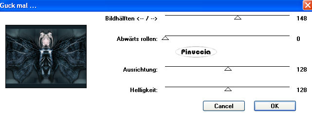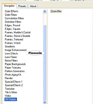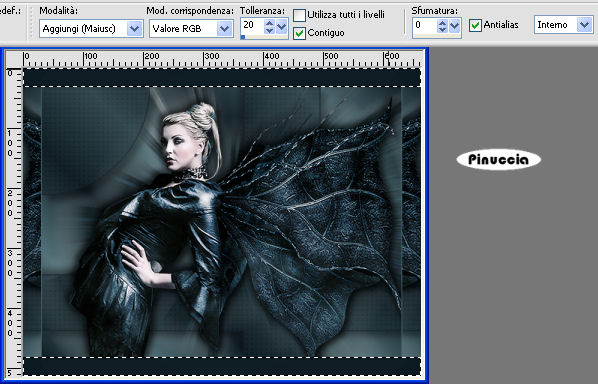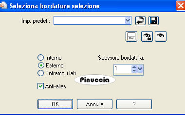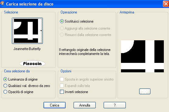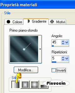 qui puoi trovare qualche risposta ai tuoi dubbi. Se l'argomento che ti interessa non è presente, ti prego di segnalarmelo. Occorrente: Materiale qui Il tube è di Yoka. Metti la selezione Jeannette-Butterfly nella cartella Selezioni. Filtri: Screenworks qui VM Toolbox qui Kiwi qui Greg's Factory Output II qui VM Toolbox funziona anche importato in Filters Unlimited. Se non trovi l'effetto nella lista di VM Toolbox, importalo in Filters Unlimited . Imposta il colore di primo piano con #132027, e il colore di sfondo con #54727A. Passa il colore di primo piano a Gradiente di primo piano/sfondo con i seguenti settaggi. ![]() 1. Apri una nuova immagine trasparente 600 x 450 pixels, e riempila con il gradiente.Riporta il colore di primo piano a colore. 2. Selezione>Carica/Salva selezione>Carica selezione da disco. Cerca e carica la selezione Jeannette-Butterfly: ![]() 3. Livelli>Nuovo livello raster. Riempi la selezione con il colore di primo piano.4. Effetti>Plugins>Screenworks - Point Array. 5. Effetti>Effetti 3D>Sfalsa ombra: ![]() Ripeti l'Effetto Sfalsa ombra, cambiando verticale e orizzontale con -10. 6. Abbassa l'opacità di questo livello al 60%. 7. Selezione>Modifica>Seleziona bordature selezione: ![]() 8. Livelli>Nuovo livello raster. Riempi con il colore di primo piano.9. Livelli>Unisci>Unisci giù. se unendo i livelli in questo modo dovessi non vedere più il piccolo bordo, annulla l'operazione. Chiudi il livello di sfondo e unisci i due livelli superiori con Livelli>Unisci>Unisci visibile. 10. Nella paletta dei livelli porta il livello inferiore in alto, in modo che la selezione non si veda. Selezione>Nessuna selezione. ![]() 11. Apri il tube con la donna. Immagine>Ridimensiona, a 575 pixels. 12. Modifica>Copia. Torna al tuo lavoro e vai a Modifica>Incolla>Incolla come nuovo livello. 13. Sposta il tube contro il bordo, a destra.14. Effetti>Effetti 3D>sfalsa ombra: ![]() Ripeti l'Effetto Sfalsa ombra, cambiando verticale e orizzontale con -5. 15. Livelli>Duplica. 16. Attiva il livello originale del tube: ![]() 17. Effetti>Plugins>VM Toolbox - Zoom Blur, con i settaggi standard. se il tuo programma non vede questo effetto nella lista del filtro, importa l'effetto in Filters Unlimited (come importare in Unlimited qui). Lo troverai sotto VM Stylize: ![]() Abbassa l'opacità di questo livello al 39%. 19. Nella paletta dei livelli trascina il livello inferiore (il livello della selezione) tra i due livelli del tube. ![]() 20. Abbassa l'opacità di questo livello all'82%. Livelli>Unisci>Unisci visibile. 21. Immagine>Aggiungi bordatura, 1 pixel, simmetriche, con il colore di sfondo. Immagine>Aggiungi bordatura, 30 pixels, simmetriche, con il colore di primo piano. 22. Seleziona questo bordo con la bacchetta magica ![]() ![]() 23. Effetti>Plugins>Kiwi's Oelfilter - Guck Mal: ![]() 24. Selezione>Nessuna selezione. 25. Seleziona il bordo superiore e quello inferiore con la bacchetta magica , tolleranza 20:![]() 26. Effetti>Plugins>Greg's Factory - Poolshadow: ![]() 27. Selezione>Nessuna selezione. 28. Immagine>Aggiungi bordatura, 1 pixel, simmetriche, con il colore di sfondo. 29. Apri il tube spiraal, e vai a Modifica>copia. Torna al tuo lavoro e vai a Modifica>Incolla come nuovo livello. Spostalo in alto a sinistra nel cerchio scuro.![]() 30. Effetti>Effetti 3D>sfalsa ombra: ![]() 31. Livelli>Unisci>Unisci tutto. L'immagine è finita. Se vuoi realizzare lo script ti occorre anche un'immagine di sfondo e un motivo argento. Per eseguire lo script Apri lo script di Jeannette che trovi qui, e segui i preliminari descritti alla fine di questo tutorial, fino all'inserimento dello sfondo-suono. Dopo aver inserito lo sfondo-suono, dovrai indicare allo script dove trovare le immagini. Clicca su Origine e identifica i punti di inserimento dei vari elementi dello script. Se hai messo tutti i file in una cartella, il percorso del suono ti servirà da guida per l'inserimento degli altri files: ti basterà cambiare l'ultima parte: il nome e l'estensione. Nella schermata sotto è indicato il punto in cui dovrai inserire il percorso delle due immagini di sfondo. 1. Qui inserisci il percorso della prima immagine di sfondo. 2. Qui inserisci il percorso del motivo argento: 3. Qui inserisci il percorso dell'immagine principale. ![]() Ricorda che, contemporaneamente, puoi controllare il risultato andando su Anteprima. fai molta attenzione alle estensioni dei files e alle maiuscole-minuscole, che devono essere corrette, altrimenti lo script non troverà le immagini da inserire Clicca adesso sulla linguetta Modifica, per aggiungere il testo. clicca due volte all'interno del riquadro. Apparirà la cornice che ti dà il via libera per sostituire il testo esistente e aggiungere il tuo. Quando hai finito, clicca all'esterno e la cornice sparirà. Il tuo messaggio con lo script è pronto per il tasto Invia. Se non vuoi spedirlo e vuoi soltanto tenerlo per te, vai a File>Salva con nome e mettilo in una cartella a tua scelta. Ricordati, però, che quando vorrai rivedere lo script, i files devono trovarsi nello stesso posto. Se nel frattempo li avrai spostati, vedrai soltanto delle crocette rosse. Avvertimento: non devi preoccuparti se in Modifica non vedrai il messaggio come dovrebbe essere (per fare questo devi andare in Anteprima). Ricorda ancora che per inviare il messaggio ti devi posizionare su Modifica. ![]() Se hai problemi o dubbi, o trovi un link non funzionante, o anche soltanto per dirmi che ti è piaciuto, scrivimi. 9 Giugno 2008 |