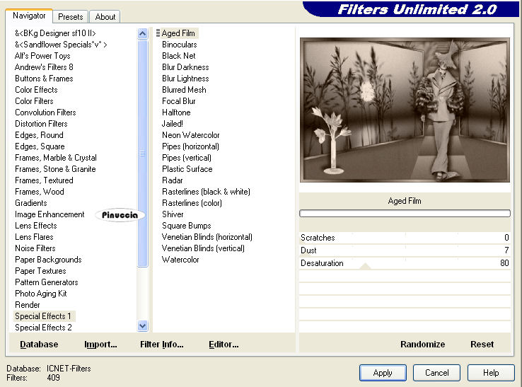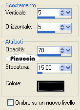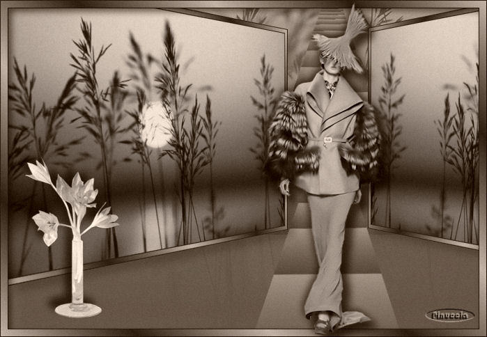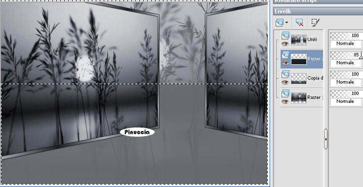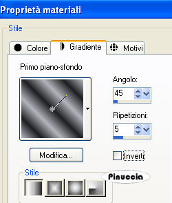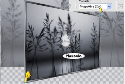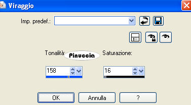 qui puoi trovare qualche risposta ai tuoi dubbi. Se l'argomento che ti interessa non è presente, ti prego di segnalarmelo. Occorrente: Materiale qui I tubes sono di Marif, Ann e di Jeannette. Non aprire Lila-bellen in PSP. Ti servirà se vorrai realizzare lo script. Imposta il colore di primo piano con #B2B4BB, e il colore di sfondo con #1D1F21. 1. Apri l'immagine ondergaande zon. 2. Regola>Saturazione e tonalità>Viraggio: ![]() 3. Livelli>Duplica e metti da parte una copia. 4. Immagine>Rifletti. Sposta l'immagine in alto, in modo che rimangano visibili soltanto 6 quadretti dello sfondo trasparente.![]() nella schermata di esempio non puoi vedere i quadretti originali rimasti visibili, per effetto della riduzione dell'immagine. 5. Livelli>Nuovo livello raster, e riempilo con il colore di primo piano.Abbassa l'opacità di questo livello al 50%. 6. Livelli>Unisci>Unisci visibile. 7. Attiva la copia dell'immagine che hai messo da parte prima. Immagine>Ridimensiona, a 400 pixels di larghezza. 8. Immagine>Aggiungi bordatura, 1 pixel, simmetriche, con il colore di sfondo. Immagine>Aggiungi bordatura, 5 pixels, simmetriche, con il colore di primo piano. Immagine>Aggiungi bordatura, 1 pixel, simmetriche, con il colore di sfondo. 9. Passa il colore di primo piano a Gradiente: ![]() 10. Seleziona il bordo chiaro con la bacchetta magica ![]() e riempilo con il gradiente.Selezione>Nessuna selezione. 11. Modifica>Copia. Torna al tuo lavoro e vai a Modifica>Incolla come nuovo livello. 12. Attiva lo strumento Puntatore ,cliccando sulla tastiera il tasto D avrai lo strumento automaticamente impostato in modalità Prospettiva. ![]() Tieni premuto il tasto Ctrl e porta verso l'esterno l'angolo (superiore o inferiore non ha importanza, perchè si sposteranno contemporaneamente) a sinistra: 13. Sposta l'immagine a sinistra e un po' più in alto.14. Livelli>Duplica. 15. Immagine>Rifletti. Sposta il duplicato a destra:![]() 16. Chiudi il livello di sfondo. 17. Livelli>Unisci>Unisci visibile. Adesso puoi riaprire il livello di sfondo. 18. Livelli>Duplica. Immagine>Capovolgi. 19. Sposta l'immagine in basso, come nell'esempio:![]() 20. Attiva lo strumento Selezione , rettangolo,e traccia un rettangolo partendo dalla parte inferiore fino a metà dell'immagine, come nell'esempio. ![]() 21. Livelli>Nuovo livello raster. Riempi con il colore di sfondo.Abbassa l'opacità di questo livello all'85%. Selezione>Nessuna selezione. 22. Nella paletta dei livelli assicurati che il livello uniti si trovi in alto. 23. Effetti>Effetti 3D>Sfalsa ombra: ![]() 24. Apri il tube della scala "trap", e vai a Modifica>copia. Torna al tuo lavoro e vai a Modifica>Incolla come nuovo livello. Sposta il tube in basso, come nell'esempio:![]() 25. Modifica>Incolla come nuovo livello (la scala è ancora in memoria). Sposta il duplicato in alto.Abbassa l'opacità di questo livello all'85%. 26. Assicurati che il livello Uniti sia il livello superiore. 27. Livelli>Unisci>Unisci visibile. 28. Apri il tube con il vaso (non ho trovato il vaso nello zip del materiale. Se vuoi usare il mio clicca qui. 29. Regola>Tonalità e saturazione>Viraggio: ![]() 30. Modifica>Copia. Torna al tuo lavoro e vai a Modifica>Incolla come nuovo livello. Sposta il tube in basso a sinistra.31. Effetti>Effetti 3D>Sfalsa ombra: ![]() 32. Livelli>Unisci>Unisci visibile. 33. Immagine>Aggiungi bordatura, 1 pixel, simmetriche, con il colore di sfondo. Immagine>Aggiungi bordatura, 10 pixels, simmetriche, con il colore di primo piano. Immagine>Aggiungi bordatura, 1 pixel, simmetriche, con il colore di sfondo. 34. Seleziona il bordo chiaro con la bacchetta magica ![]() e riempilo con il gradiente.35. Effetti>Effetti 3D>Sfalsa ombra: ![]() Selezione>Nessuna selezione. 36. Apri il tube della donna. Regola>Saturazione e tonalità>Viraggio, come al punto 29. 37. Modifica>Copia. Torna al tuo lavoro e vai a Modifica>Incolla come nuovo livello. Sposta il tube a destra.38. Effetti>Effetti 3D>sfalsa ombra, con i seguenti settaggi: ![]() Effetti>Effetti 3D>Sfalsa ombra, cambiando verticale e orizzontale con -3. ![]() 39. Livelli>Unisci>Unisci visibile. 40. Effetti>Effetti di foto>Film e filtri: questa è la schermata dell'effetto di Jeannette: ![]() Non ho Corel X2. Per i miei lavori uso principalmente Corel X. Come alternativa a questo passaggio, che sei libero di seguire o di sperimentare in altro modo, ho usato questa: Effetti>Plugins>Filters Unlimited - Special Effect 2 - Aged Film : ![]() L'immagine è finita. Se vuoi realizzare lo script ti servirà anche un'immagine di sfondo e la gif lila-bellen (nello zip). Per eseguire lo script Apri lo script di Jeannette che trovi qui, e segui i preliminari descritti alla fine di questo tutorial, fino all'inserimento dello sfondo-suono. Dopo aver inserito lo sfondo-suono, dovrai indicare allo script dove trovare le immagini. Clicca su Origine e identifica i punti di inserimento dei vari elementi dello script. Se hai messo tutti i file in una cartella, il percorso del suono ti servirà da guida per l'inserimento degli altri files: ti basterà cambiare l'ultima parte: il nome e l'estensione. Nella schermata sotto è indicato il punto in cui dovrai inserire il percorso dell'immagine di sfondo. ![]() Nella schermata sotto sono indicati i due punti in cui dovrai inserire il percorso dell'immagine principale. ![]() Dovrai scorrere ancora il testo per trovare il punto in cui inserire il percorso della gif lila-bellen: ![]() Ricorda che, contemporaneamente, puoi controllare il risultato andando su Anteprima. fai molta attenzione alle estensioni dei files e alle maiuscole-minuscole, che devono essere corrette, altrimenti lo script non troverà le immagini da inserire Clicca adesso sulla linguetta Modifica, per aggiungere il testo. clicca due volte all'interno del riquadro. Apparirà la cornice che ti dà il via libera per sostituire il testo esistente e aggiungere il tuo. Quando hai finito, clicca all'esterno e la cornice sparirà. Il tuo messaggio con