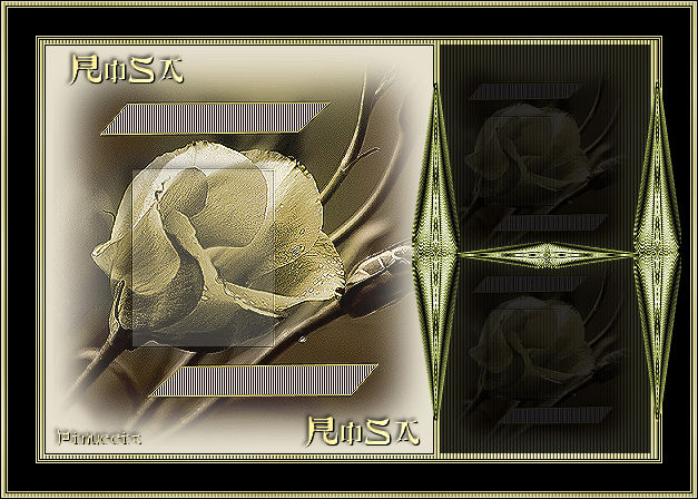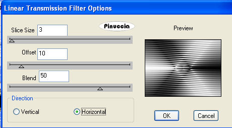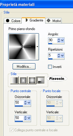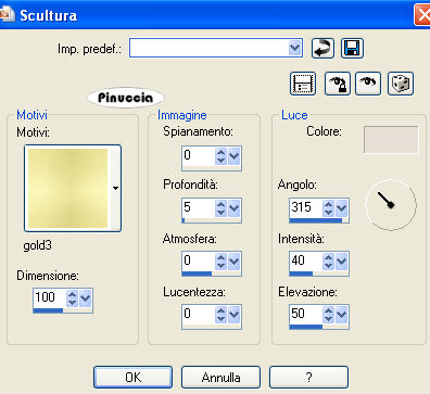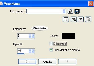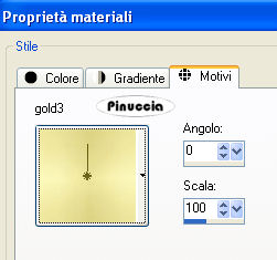 qui puoi trovare qualche risposta ai tuoi dubbi. Se l'argomento che ti interessa non è presente, ti prego di segnalarmelo. Occorrente: Materiale qui Metti il motivo oro nella cartella Motivi. Apri il font e minimizzalo nella tua area di lavoro. Lo troverai nella lista dei font disponibili, quando ti serviranno. Non aprire il tube della farfalla. Ti servirà per l'animazione dello script. Filtro DSB Flux qui Imposta il colore di primo piano con #E6E0CE, e il colore di sfondo con il motivo oro. ![]() 1. Apri il tube della rosa. Elimina il livello del watermark. Regola>Messa a fuoco>Metti a fuoco, 4 volte. Duplica il tube usando la combinazione di tasti Shift(maiuscola)+D e metti da parte la copia. 2. Livelli>Nuovo livello raster. Riempi con il colore di primo piano.Livelli>Disponi>Porta sotto. Livelli>Unisci>Unisci tutto. 3. Immagine>Aggiungi bordatura, 1 pixel, simmetriche, con il colore nero. Immagine>Aggiungi bordatura, 1 pixel, simmetriche, con il colore di primo piano. Seleziona il bordo con la bacchetta magica ![]() e riempilo con il motivo oro.Selezione>Deseleziona. 4. Immagine>Aggiungi bordatura, con il colore nero, simmetriche non selezionato. ![]() Seleziona il bordo con la bacchetta magica ![]() e riempilo con il motivo oro. Effetti>Effetti di trama>Veneziana: ![]() 5. Regola>Messa a fuoco>Metti a fuoco, 2 volte. Selezione>Deseleziona. 6. Immagine>Aggiungi bordatura, 1 pixel, simmetriche, con il colore nero. Immagine>Aggiungi bordatura, 1 pixel, simmetriche, con il colore di primo piano. Seleziona il bordo con la bacchetta magica ![]() e riempilo con il motivo oro.Selezione>Deseleziona. 7. Immagine>Aggiungi bordatura, 1 pixel, simmetriche, con il colore nero. Immagine>Aggiungi bordatura, 1 pixel, simmetriche, con il colore di primo piano. Seleziona il bordo con la bacchetta magica ![]() e riempilo con il motivo oro.Selezione>Deseleziona. 8. Immagine>Aggiungi bordatura, 25 pixels, simmetriche, con il colore nero. Immagine>Aggiungi bordatura, 1 pixel, simmetriche, con il colore di primo piano. Seleziona il bordo con la bacchetta magica ![]() e riempilo con il motivo oro.Selezione>Deseleziona. Immagine>Aggiungi bordatura, 1 pixel, simmetriche, con il colore nero. 9. Immagine>Aggiungi bordatura, 3 pixels, simmetriche, con il colore di primo piano. Seleziona il bordo con la bacchetta magica ![]() e riempilo con il motivo oro.Effetti>Effetti di trama>Veneziana, con i settaggi usati al punto 4. Selezione>Deseleziona. 10. Immagine>Aggiungi bordatura, 1 pixel, simmetriche, con il colore di primo piano. Seleziona il bordo con la bacchetta magica ![]() e riempilo con il motivo oro.Selezione>Deseleziona. Immagine>Aggiungi bordatura, 1 pixel, simmetriche, con il colore nero. 11. Attiva la copia del tube della rosa che hai messo da parte prima. Immagine>Ridimensiona, a 150 pixels di larghezza. Modifica>Copia. Torna al tuo lavoro e vai a Modifica>Incolla come nuovo livello. Ripeti Modifica>Incolla come nuovo livello e posiziona le due rose a destra, una sopra l'altra, come nel mio esempio. Livelli>Unisci>Unisci tutto. 12. Attiva lo strumento Selezione , rettangolo,e traccia una selezione come nell'esempio. ![]() 13. Livelli>Nuovo livello raster. Riempi il livello con il colore nero.Abbassa l'opacità di questo livello all'80%. Livelli>Unisci>Unisci tutto. 14. Attiva lo strumento Testo , font Chinese Style, regola la dimensione a seconda del testo e della versione di PSP che stai usando,chiudi il colore di primo piano, e scrivi il tuo testo. Livelli>Converti in livello raster. 15. Effetti>Effetti di trama>Scultura - seleziona il motivo oro con i seguenti settaggi: ![]() 16. Effetti>Effetti 3D>Sfalsa ombra, con i seguenti settaggi: ![]() Livelli>Duplica e sposta il secondo testo in basso,vedi il mio esempio. Livelli>Unisci>Unisci tutto. 18. Adesso andremo a creare una decorazione. 19. Imposta il colore di primo piano con il nero, e il colore di sfondo con il bianco. Passa il colore di primo piano a Gradiente, con i seguenti settaggi: ![]() 20. Apri una nuova immagine trasparente 600 x 450 pixels, e riempila con il gradiente.21. Effetti>Plugins>DSB Flux - Linear Transmission, con i seguenti settaggi: ![]() 22. Effetti>Effetti geometrici>Cerchio, avvolgi selezionato: ![]() 23. Attiva lo strumento Selezione a mano libera , da punto a punto,e seleziona un triangolo, come mostrato nell'esempio: a destra vedi il risultato: Modifica>Copia. 24. Apri una nuova immagine trasparente 500 x 500 pixels e vai a Modifica>Incolla come nuovo livello. Livelli>Duplica. Immagine>Capovolgi e sistema le immagini come nell'esempio.![]() Livelli>Unisci>Unisci visibile. 25. Regola>Tonalità e saturazione>Viraggio. ![]() Modifica>Copia. Torna al lavoro principale, l'immagine con le rose, e vai a Modifica>Incolla come nuovo livello. Ripeti Modifica>Incolla come nuovo livello. Posiziona le decorazioni sui bordi della striscia, vedi il mio esempio.26. Di nuovo Modifica>Incolla come nuovo livello (la decorazione è ancora in memoria). Immagine>Ridimensiona, al 55%, tutti i livelli non selezionato. Posiziona la decorazione al centro, vedi il mio esempio.Regola>Messa a fuoco>Metti a fuoco. 27. Livelli>Unisci>Unisci tutto. L'immagine è finita. Se vuoi realizzare lo script ti serviranno anche tre immagini di sfondo e la gif della farfalla che hai trovato nello zip. Per eseguire lo script Apri lo script di Jeannette che trovi qui, e segui i preliminari descritti alla fine di questo tutorial, fino all'inserimento dello sfondo-suono. Dopo aver inserito lo sfondo-suono, dovrai indicare allo script dove trovare le immagini. Clicca su Origine e identifica i punti di inserimento dei vari elementi dello script. Se hai messo tutti i file in una cartella, il percorso del suono ti servirà da guida per l'inserimento degli altri files: ti basterà cambiare l'ultima parte: il nome e l'estensione. Nella schermata sotto è indicato il punto in cui dovrai inserire il percorso delle immagini di sfondo. 1. Qui inserisci il percorso della prima i