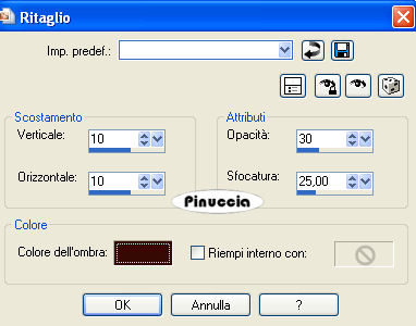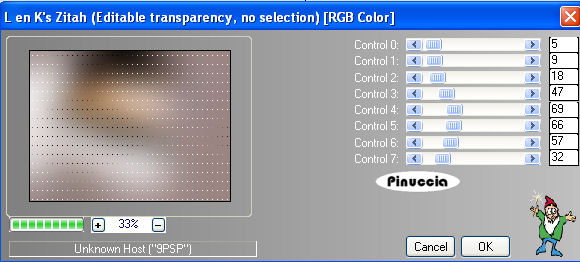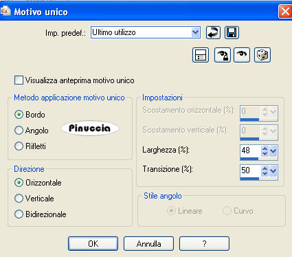 qui puoi trovare qualche risposta ai tuoi dubbi. Se l'argomento che ti interessa non è presente, ti prego di segnalarmelo. Occorrente: Materiale qui Filtri: L&K Zitah qui Simple qui Imposta il colore di primo piano con #9F8A87, e il colore di sfondo con #FAE9EA. 1. Apri una nuova immagine trasparente 600 x 450 pixels, e riempila con il colore di primo piano.2. Selezione>Seleziona tutto. 3. Apri il tube con la donna e vai a Modifica>Copia. non chiuderlo, perchè ti servirà ancora. Torna al tuo lavoro e vai a Modifica>Incolla>Incolla nella selezione. 4. Selezione>Nessuna selezione. 5. Regola>Sfocatura>Sfocatura gaussiana, raggio 50. ![]() 6. Effetti>Plugins>L&K - Zitah, con i seguenti settaggi. ![]() 7. Apri l'immagine china-tuin. Livelli>Carica/Salva maschera>Carica maschera da disco. Cerca e carica la maschera 20-20: ![]() se non hai la maschera clicca qui Livelli>Elimina e rispondi sì alla domanda Unire la maschera nel livello corrente. ![]() Livelli>Unisci>Unisci gruppo. 8. Modifica>Copia. (non chiudere l'immagine perchè ti servirà più tardi, se vorrai realizzare lo script). Torna al tuo lavoro e vai a Modifica>Incolla>Incolla come nuovo livello. Sposta l'immagine in alto a destra.![]() 9. Livelli>Unisci>Unisci tutto. 10. Immagine>Aggiungi bordatura, 1 pixel, simmetriche, con il colore bianco. 11. Immagine>Aggiungi bordatura, 50 pixels, simmetriche, con il colore di primo piano. Seleziona questo bordo con la bacchetta magica ![]() ![]() 12. Effetti>Effetti 3D>Ritaglio: ![]() 13. Attiva nuovamente il tube con la donna e vai a Modifica>Copia. Torna al tuo lavoro e vai a Modifica>Incolla>Incolla come nuovo livello. Non muovere il tube per il momento, lascialo come sta. 14. Effetti>Effetti 3D>Sfalsa ombra: ![]() 15. Sposta il tube completamente a sinistra.Regola>Messa a fuoco>Metti a fuoco. 16. Immagine>Aggiungi bordatura, 1 pixel, simmetriche, con il colore di sfondo. 17. Apri il tube con le perle "sierrand", e vai a Modifica>Copia. Torna al tuo lavoro e vai a Modifica>Incolla>Incolla come nuovo livello. Sposta il tube in basso a destra.18. Effetti>Effetti 3D>Sfalsa ombra: ![]() Regola>Messa a fuoco>Metti a fuoco. 19. Attiva lo strumento Selezione , rettangolo,e seleziona una piccola perla del tube ![]() Modifica>Copia. Torna al tuo lavoro e vai a Modifica>Incolla>Incolla come nuovo livello. Spostalo in un angolo.Regola>Messa a fuoco>Metti a fuoco. 20. Metti una perla in tutti gli angoli (vedi il mio esempio). Livelli>Unisci>Unisci tutto. ********** L'immagine è finita. Se vuoi realizzare lo script ti occorrono alcune immagini che puoi ricavare dal tuo lavoro, procedendo così: 21. Attiva l'immagine che hai lasciato al punto 7. 22. L'hai minimizzata dopo Livelli>Unisci>Unisci gruppo. Continua così: 23. Livelli>Nuovo livello raster. Riempi con il colore di primo piano.24. Effetti>Plugins>L&K Zitah, con i settaggi usati al punto 6. 25. Livelli>Disponi>Porta sotto. 26. Livelli>Unisci>Unisci tutto. 27. Immagine>Ridimensiona, 400 x 300 pixels, tutti i livelli selezionato. 28. Effetti>Effetti di immagine>Motivo unico: ![]() Questa immagine è finita. Salva in formato jpg, con il nome "giardino". ******* Adesso dovrai preparare delle piccole immagini per i blocchi. 29. Attiva l'immagine che hai terminato al punto 20. 30. Attiva lo strumento Selezione , rettangolo,e seleziona la testa della donna: ![]() 31. Modifica>Copia. Modifica>Incolla>Incolla come nuova IMMAGINE. 32. Effetti>Plugins>Simple - Quick Tile. 33. Immagine>Ridimensiona, a 100 pixels di larghezza. Duplica l'immagine usando sulla tastiera la combinazione di tasti shift(maiuscola)+D. Salva la prima immagine con il nome "blocco 1". 34. Attiva la seconda immagine. Immagine>Rifletti. Salva l'immagine con il nome "blocco 2". **** Hai finito. Adesso, per realizzare lo script, ti occorre ancora un'altra piccola immagine di sfondo. Per eseguire lo script Apri lo script di Jeannette che trovi qui, e segui i preliminari descritti alla fine di questo tutorial, fino all'inserimento dello sfondo-suono. Dopo aver inserito lo sfondo-suono, dovrai indicare allo script dove trovare le immagini. Clicca su Origine e identifica i punti di inserimento dei vari elementi dello script. Se hai messo tutti i file in una cartella, il percorso del suono ti servirà da guida per l'inserimento degli altri files: ti basterà cambiare l'ultima parte: il nome e l'estensione. Nella schermata sotto è indicato il punto in cui dovrai inserire il percorso delle due immagini di sfondo. 1. Qui inserisci il percorso della prima immagine di sfondo. 2. Qui inserisci il percorso dell'immagine salvata con il nome "giardino". 3. Qui il percorso dell'immagine salvata con il nome "blocco 1". 4. Qui il percorso dell'immagine salvata con il nome "blocco 2". ![]() Nella schermata sotto è indicato il punto in cui dovrai inserire il percorso dell'immagine principale. ![]() Ricorda che, contemporaneamente, puoi controllare il risultato andando su Anteprima. fai molta attenzione alle estensioni dei files e alle maiuscole-minuscole, che devono essere corrette, altrimenti lo script non troverà le immagini da inserire Clicca adesso sulla linguetta Modifica, per aggiungere il testo. clicca due volte all'interno del riquadro. Apparirà la cornice che ti dà il via libera per sostituire il testo esistente e aggiungere il tuo. Quando hai finito, clicca all'esterno e la cornice sparirà. Il tuo messaggio con lo script è pronto per il tasto Invia. Se non vuoi spedirlo e vuoi soltanto tenerlo per te, vai a File>Salva con nome e mettilo in una cartella a tua scelta. Ricordati, però, che quando vorrai rivedere lo script, i files devono trovarsi nello stesso posto. Se nel frattempo li avrai spostati, vedrai soltanto delle crocette rosse. Avvertimento: non devi preoccuparti se in Modifica non vedrai il messaggio come dovrebbe essere (per fare questo devi andare in Anteprima). Ricorda ancora che per inviare il messaggio ti devi posizionare su Modifica. ![]() Le vostre versioni. Grazie ![](