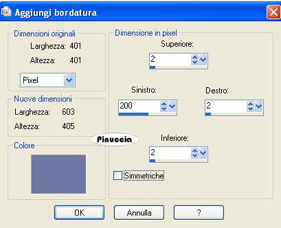 qui puoi trovare qualche risposta ai tuoi dubbi. Se l'argomento che ti interessa non è presente, ti prego di segnalarmelo. Occorrente: Materiale qui I tubes sono di Yoka e LisaG . Filtri: DSB Flux qui Simple qui Imposta il colore di primo piano con #6D79A0, e il colore di sfondo con #F5F7F3. 1. Apri il tube della donna. Elimina il livello "merge". Questa sarà la base del tuo lavoro. 2. Livelli>Nuovo livello raster. Riempi con il colore di primo piano.3. Livelli>Disponi>Porta sotto. 4. Attiva il livello superiore (il tube). Livelli>Duplica, chiudi il livello della copia e posizionati su uno degli altri due livelli. 5. Livelli>Unisci>Unisci visibile. 6. Effetti>Plugins>DSB Flux - Linear Transmission, con i seguenti settaggi: ![]() 7. Effetti>Plugins>Simple - Diamonds. 8. Livelli>Nuovo livello raster. Riempi con il colore di primo piano.Abbassa l'opacità di questo livello al 70%. 9. Rendi nuovamente visibile il livello del tube. Livelli>Unisci>Unisci visibile. 10. Immagine>Aggiungi bordatura, simmetriche non selezionato, con il colore di primo piano, e i seguenti settaggi: ![]() 11. Attiva lo strumento Forme predefinite ![]() e seleziona button001: ![]() dovrebbe essere standard in PSP 8 e 9. Se non lo trovi clicca qui 12. Traccia la forma nella sezione a sinistra, iniziando dall'angolo in alto a sinistra. ![]() 13. Regola>Tonalità e saturazione>Viraggio, con i seguenti settaggi. ![]() 14. Apri il tube Paasei-fantasie. Immagine>Ridimensiona, 200 x 275 pixels, mantieni proporzioni selezionato. ![]() Regola>Tonalità e Saturazione>Viraggio, con i settaggi usati al punto 13. 15. Modifica>Copia. Torna al tuo lavoro e vai a Modifica>Incolla>Incolla come nuovo livello. Posiziona il tube sulla forma.![]() 16. Livelli>Unisci>Unisci visibile. 17. Immagine>Aggiungi bordatura, 1 pixel, simmetriche, con il colore di sfondo. Immagine>Aggiungi bordatura, 3 pixels, simmetriche, con il colore di primo piano. Immagine>Aggiungi bordatura, 1 pixel, simmetriche, con il colore di sfondo. 18. La tua immagine adesso dovrebbe avere le dimensioni 613 x 415 pixels. Se non è così, ridimensionala con queste misure (Immagine>Ridimensiona...). L'immagine è finita. Se vuoi realizzare lo script ti occorre anche un'immagine di sfondo, e l'immagine principale andrà inserita nello script due volte. Per eseguire lo script Apri lo script di Jeannette che trovi qui, e segui i preliminari descritti alla fine di questo tutorial, fino all'inserimento dello sfondo-suono. Dopo aver inserito lo sfondo-suono, dovrai indicare allo script dove trovare le immagini. Clicca su Origine e identifica i punti di inserimento dei vari elementi dello script. Se hai messo tutti i file in una cartella, il percorso del suono ti servirà da guida per l'inserimento degli altri files: ti basterà cambiare l'ultima parte: il nome e l'estensione. Nella schermata sotto è indicato il punto in cui dovrai inserire il percorso dell'immagine di sfondo. ![]() Nella schermata sotto sono indicati i due punti in cui dovrai inserire il percorso dell'immagine principale. ![]() Ricorda che, contemporaneamente, puoi controllare il risultato andando su Anteprima. fai molta attenzione alle estensioni dei files e alle maiuscole-minuscole, che devono essere corrette, altrimenti lo script non troverà le immagini da inserire Clicca adesso sulla linguetta Modifica, per aggiungere il testo. clicca due volte all'interno del riquadro. Apparirà la cornice che ti dà il via libera per sostituire il testo esistente e aggiungere il tuo. Quando hai finito, clicca all'esterno e la cornice sparirà. Il tuo messaggio con lo script è pronto per il tasto Invia. Se non vuoi spedirlo e vuoi soltanto tenerlo per te, vai a File>Salva con nome e mettilo in una cartella a tua scelta. Ricordati, però, che quando vorrai rivedere lo script, i files devono trovarsi nello stesso posto. Se nel frattempo li avrai spostati, vedrai soltanto delle crocette rosse. Avvertimento: non devi preoccuparti se in Modifica non vedrai il messaggio come dovrebbe essere (per fare questo devi andare in Anteprima). Ricorda ancora che per inviare il messaggio ti devi posizionare su Modifica. ![]() Se hai problemi o dubbi, o trovi un link non funzionante, o anche soltanto per dirmi che ti è piaciuto, scrivimi. 13 Giugno 2008 |