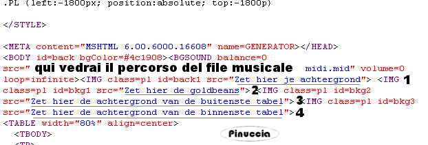 qui puoi trovare qualche risposta ai tuoi dubbi. Se l'argomento che ti interessa non è presente, ti prego di segnalarmelo. Occorrente: Materiale qui I tubes sono di Crystal. Metti il pennello Bubbels nella cartella Pennelli. Metti il motivo Goldbeads nella cartella Motivi. Filtro: Greg's Factory Output II qui Imposta il colore di primo piano con #A26446, e il colore di sfondo con #F2D9D. 1. Apri una nuova immagine trasparente 600 x 450 pixels, e riempila con il colore di primo piano.2. Effetti>Plugins>Greg's Factory Output II - Pool Shadow, con i settaggi standard. ![]() 3. Attiva lo strumento Pennello ![]() cerca e seleziona il pennello Bubbels, e applicalo esattamente nell'angolo in alto a sinistra cliccando con il tasto destro del mouse, per usare il colore di sfondo: ![]() 4. Applica nuovamente il pennello, sempre con il tasto destro del mouse, nell'angolo in basso a destra. 5. Effetti>Effetti di bordo>Aumenta di più. 6. Apri il tube della donna ".rystaltubed 580", e vai a Modifica>Copia. Torna al tuo lavoro e vai a Modifica>Incolla come nuovo livello. Sposta il tube in basso a destra.7. Apri il tube della coppia ".rystaltubed 407". Livelli>Carica/Salva maschera>Carica maschera da disco. Cerca e carica la maschera 20-20: ![]() se non hai la maschera, clicca qui Livelli>Unisci>Unisci gruppo. Immagine>Ridimensiona al 50%. 8. Modifica>Copia. Torna al tuo lavoro e vai a Modifica>Incolla come nuovo livello. Sposta il tube in alto a sinistra.9. Apri il tube Ornament e vai a Modifica>Copia. Torna al tuo lavoro e vai a Modifica>Incolla come nuovo livello. Spostalo in basso a sinistra.Livelli>Duplica. Sposta il duplicato in alto a destra.10. Livelli>Unisci>Unisci tutto. 11. Immagine>Aggiungi bordatura, 3 pixels, simmetriche, con il colore rosso. Seleziona il bordo con la bacchetta magica ![]() Passa il colore di primo piano a Motivi, cerca e seleziona il motivo Goldbeads, e riempi la selezione con questo motivo.Selezione>Deseleziona. L'immagine è finita. Se vuoi realizzare lo script, ti occorrono anche 3 immagini di sfondo e il motivo Goldbeads. Per eseguire lo script Apri lo script di Jeannette che trovi qui, e segui i preliminari descritti alla fine di questo tutorial, fino all'inserimento dello sfondo-suono. Dopo aver inserito lo sfondo-suono, dovrai indicare allo script dove trovare le immagini. Clicca su Origine e identifica i punti di inserimento dei vari elementi dello script. Se hai messo tutti i file in una cartella, il percorso del suono ti servirà da guida per l'inserimento degli altri files: ti basterà cambiare l'ultima parte: il nome e l'estensione. Nella schermata sotto è indicato il punto in cui dovrai inserire il percorso delle due immagini di sfondo. 1. Qui inserisci il percorso della prima immagine di sfondo. 2. Qui inserisci il percorso del motivo Goldbeads, che servirà per i bordi. 3. Qui inserisci il percorso dello sfondo, che servirà per le tabelle esterne. 4. Qui inserisci il percorso dello sfondo, che servirà per le tabelle interne. ![]() Nella schermata sotto sono indicati i due punti in cui dovrai inserire il percorso dell'immagine principale. ![]() Ricorda che, contemporaneamente, puoi controllare il risultato andando su Anteprima. fai molta attenzione alle estensioni dei files e alle maiuscole-minuscole, che devono essere corrette, altrimenti lo script non troverà le immagini da inserire Clicca adesso sulla linguetta Modifica, per aggiungere il testo. clicca due volte all'interno del riquadro. Apparirà la cornice che ti dà il via libera per sostituire il testo esistente e aggiungere il tuo. Quando hai finito, clicca all'esterno e la cornice sparirà. Il tuo messaggio con lo script è pronto per il tasto Invia. Se non vuoi spedirlo e vuoi soltanto tenerlo per te, vai a File>Salva con nome e mettilo in una cartella a tua scelta. Ricordati, però, che quando vorrai rivedere lo script, i files devono trovarsi nello stesso posto. Se nel frattempo li avrai spostati, vedrai soltanto delle crocette rosse. Avvertimento: non devi preoccuparti se in Modifica non vedrai il messaggio come dovrebbe essere (per fare questo devi andare in Anteprima). Ricorda ancora che per inviare il messaggio ti devi posizionare su Modifica. ![]() Se hai problemi o dubbi, o trovi un link non funzionante, o anche soltanto per dirmi che ti è piaciuto, scrivimi. 1 Maggio 2008 |