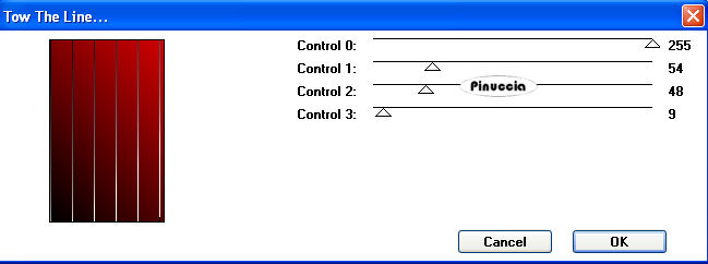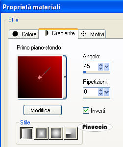 qui puoi trovare qualche risposta ai tuoi dubbi. Se l'argomento che ti interessa non è presente, ti prego di segnalarmelo. Occorrente: Materiale qui Il bel tube della donna è di Crystal. Grazie Crystal. Filtri: Tramages qui Imposta il colore di primo piano con #D30000, e il colore di sfondo con #000000 (nero). Passa il colore di primo piano a Gradiente: ![]() 1. Apri il tube della donna. Duplicalo usando sulla tastiera la combinazione di tasti shift(maiuscola+D) e metti da parte la copia. 2. Livelli>Nuovo livello raster. Riempi con il gradiente (tra poco rivedrai la donna!).3. Effetti>Plugins>Tramage - Tow the Line: ![]() 4. Livelli>Disponi>Sposta giù. Livelli>Unisci>Unisci tutto. ![]() 5. Immagine>Aggiungi bordatura, simmetriche non selezionato e con il colore giallo (o con un altro colo, purchè sia contrastante con i colori della tua immagine). ![]() Seleziona questo bordo con la bacchetta magica ![]() ![]() Imposta il colore di primo piano con un motivo oro. se non ce l'hai clicca qui Riempi la selezione con questo motivo.Selezione>Nessuna selezione. rand en vul met goudpatroon, niets selecteren, nu heb je alleen aan de rechterkant een gouden randje. 6. Apri una nuova immagine trasparente 600 x 500 pixels, e riempila con il gradiente.7. Effetti>Effetti di bordo>Aumenta di più, 2 volte. 8. Attiva l'immagine con la donna e vai a Modifica>copia. Torna a quest'ultima immagine (600x500) e vai a Modifica>Incolla come nuovo livello. Spostala a sinistra.Livelli>Unisci>Unisci tutto. 9. Attiva lo strumento Selezione , ovale,e traccia un ovale nel rettangolo. ![]() 10. Livelli>Nuovo livello raster. Riempi con il motivo oro.Abbassa l'opacità di questo livello al 40%. Livelli>Unisci>Unisci visibile. Mantieni selezionato. 11. Livelli>Nuovo livello raster. 12. Apri il tube che hai messo da parte. Attiva lo strumento Selezione , rettangolo, e seleziona una parte del tube come nell'esempio.![]() 13. Immagine>Rifletti. Modifica>Copia. Torna al tuo lavoro e vai a Modifica>Incolla>Incolla nella selezione. ![]() 14. Abbassa l'opacità di questo livello al 50%. Livelli>Unisci>Unisci visibile. 15. Selezione>Modifica>Seleziona bordature selezione, 2 pixels, interno e antialias selezionati. 16. Livelli>Nuovo livello raster. Riempi con il motivo oro.17. Effetti>Effetti 3D>Sfalsa ombra, con i seguenti settaggi: ![]() Ripeti l'Effetto Sfalsa ombra, ma cambiando verticale e orizzontale con -3. Selezione>Nessuna selezione. Livelli>Unisci>Unisci tutto. 18. Attiva lo strumento Penna ![]() , zet in de werkbalk boven de lijnstijl op stippellijn, breedte 2. Imposta il colore di primo piano con il motivo oro. 19. Traccia una linea, tenendo premuto il tasto della maiuscola 19. Trek nu vanuit de hoeken naar het ovaaltje lijnen houd daarbij de shiftknop ingedrukt. ![]() 20. Apri il tube della rosa e vai a Modifica>Copia. Torna al tuo lavoro e vai a Modifica>Incolla>Incolla come nuovo livello. Posiziona la rosa come nel mio esempio.Effetti>Effetti 3D>Sfalsa ombra, con i settaggi precedenti. Livelli>Unisci>Unisci tutto. 21. Immagine>Aggiungi bordatura, 2 pixels, simmetriche, con il colore giallo. Seleziona questo bordo con la bacchetta magica ![]() ![]() Immagine>Aggiungi bordatura, 5 pixels, simmetriche, con il colore nero. Immagine>Aggiungi bordatura, 2 pixels, simmetriche, con il colore giallo. Seleziona questo bordo con la bacchetta magica ![]() e riempilo con il motivo oro.22. Immagine>Ridimensiona, 600 x 500 pixels. Regola>Messa a fuoco>Metti a fuoco. 23. Attiva lo strumento Testo , scegli un bel font,e scrivi un testo. Effetti>Effetti 3D>sfalsa ombra, come al punto 17. Regola>Messa a fuoco>Metti a fuoco. L'immagine è finita. Se vuoi realizzare lo script, ti occorre anche un'immagine di sfondo con un motivo oro per le tabelle laterali. Per eseguire lo script Apri lo script di Jeannette che trovi qui, e segui i preliminari descritti alla fine di questo tutorial, fino all'inserimento dello sfondo-suono. Dopo aver inserito lo sfondo-suono, dovrai indicare allo script dove trovare le immagini. Clicca su Origine e identifica i punti di inserimento dei vari elementi dello script. Se hai messo tutti i file in una cartella, il percorso del suono ti servirà da guida per l'inserimento degli altri files: ti basterà cambiare l'ultima parte: il nome e l'estensione. Nella schermata sotto sono indicati i punti in cui dovrai inserire, tra le virgolette, il percorso delle due immagini di sfondo, 1. Qui inserisci il primo sfondo. 2. Qui inserisci il secondo sfondo che servirà per le tabelle. ![]() Nella schermata sotto è indicato il punto in cui dovrai inserire il percorso dell'immagine principale. ![]() Ricorda che, contemporaneamente, puoi controllare il risultato andando su Anteprima. fai molta attenzione alle estensioni dei files e alle maiuscole-minuscole, che devono essere corrette, altrimenti lo script non troverà le immagini da inserire Clicca adesso sulla linguetta Modifica, per aggiungere il testo. clicca due volte all'interno del riquadro. Apparirà la cornice che ti dà il via libera per sostituire il testo esistente e aggiungere il tuo. Quando hai finito, clicca all'esterno e la cornice sparirà. Il tuo messaggio con lo script è pronto per il tasto Invia. Se non vuoi spedirlo e vuoi soltanto tenerlo per te, vai a File>Salva con nome e mettilo in una cartella a tua scelta. Ricordati, però, che quando vorrai rivedere lo script, i files devono trovarsi nello stesso posto. Se nel frattempo li avrai spostati, vedrai soltanto delle crocette rosse. Avvertimento: non devi preoccuparti se in Modifica non vedrai il messaggio come dovrebbe essere (per fare questo devi andare in Anteprima). Ricorda ancora che per inviare il messaggio ti devi posizionare su Modifica. ![]() Se hai problemi o dubbi, o trovi un link non funzionante, o anche soltanto per dirmi che ti è piaciuto, scrivimi. 2 Novembre 2007 |