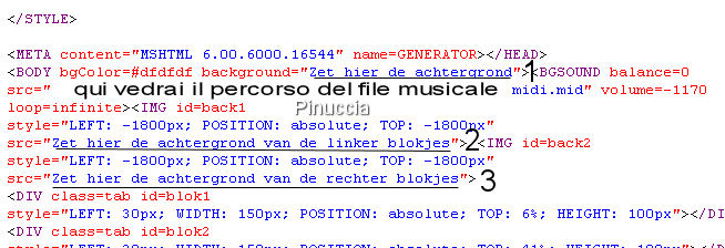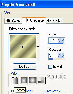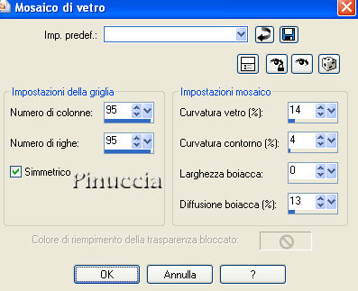 qui puoi trovare qualche risposta ai tuoi dubbi. Se l'argomento che ti interessa non è presente, ti prego di segnalarmelo. Occorrente: Materiale qui I tubes che ho usato sono di SDH e Juliane. Imposta il colore di primo piano con il bianco (#FFFFFF), e il colore di sfondo con #E9E9AB. Passa il colore di primo piano a Gradiente di primo piano/sfondo, con i seguenti settaggi: ![]() 1. Apri il tube con il fiore. Elimina il livello del watermark. 2. Livelli>Nuovo livello raster. Riempi il nuovo livello con il gradiente.3. Effetti>Effetti di trama>Mosaico di vetro: ![]() 4. Effetti>Effetti di bordo>Aumenta di più. 5. Nella paletta dei livelli trascina il livello inferiore in alto, in modo da rendere visibile il fiore. 6. Regola>Saturazione e tonalità>Viraggio: ![]() 7. Livelli>Unisci>Unisci tutto. Metti da parte questa immagine per il momento. 8. Apri il tube con la donna. Cancella il livello del watermark. 9. Livelli>Nuovo livello raster. Riempi il nuovo livello con il gradiente.Effetti>Effetti di trama>Mosaico di vetro, con i settaggi precedenti. Effetti>Effetti di bordo>Aumenta di più. Nella paletta dei livelli trascina il livello inferiore in alto, in modo da rendere visibile il tube della donna. 10. Livelli>Unisci>Unisci tutto. 11. Attiva lo strumento Selezione , esagono,e traccia un esagono intorno alla donna, iniziando in alto a sinistra, fino in basso a destra: ![]() Modifica>Copia. 12. Apri una nuova immagine trasparente 400 x 500 pixels. 13. Modifica>Incolla>Incolla come nuovo livello. 14. Clicca con la bacchetta magica sullo spazio trasparente.15. Selezione>Inverti. 16. Selezione>Modifica>Seleziona bordature selezione: ![]() 17. Riempi il bordo con il gradiente.18. Effetti>Effetti di trama>Mosaico di vetro, con i settaggi precedenti. 19. Livelli>Unisci>Unisci visibile. Selezione>Nessuna selezione. Regola>Messa a fuoco>Metti a fuoco. 20. Modifica>Copia. Attiva l'immagine che hai messo da parte al punto 7 e vai a Modifica>Incolla>Incolla come nuovo livello. Sposta l'immagine a sinistra.21. Effetti>Effetti 3D>Sfalsa ombra: ![]() Ripeti l'Effetto Sfalsa ombra, ma cambiando verticale e orizzontale a -2. 22. Apri il tube con il testo (oppure, se vuoi, scrivi un tuo testo a scelta), e vai a Modifica>Copia. Incolla>Incolla come nuovo livello. Sposta il testo a destra.23. Attiva lo strumento Testo , scegli un bel font, crea come vettore, colore di sfondo bianco,scrivi il tuo nome e posizionalo. Livelli>Converti in livello raster. 24. Effetti>Effetti 3D>Sfalsa ombra: ![]() 26. Livelli>Unisci>Unisci tutto. 27. Imposta il colore di primo piano con #767752. 28. Immagine>Aggiungi bordatura, 1 pixel, simmetriche, con il colore di primo piano. come aggiungere i bordi impostati nella paletta dei materiale, vedi Immagine>Aggiungi bordatura, 8 pixels, simmetriche, con il colore di sfondo. Immagine>Aggiungi bordatura, 1 pixel, simmetriche, con il colore di primo piano. 29. Passa il colore di primo piano a Gradiente: ![]() 30. Seleziona il bordo da 8 pixels cliccando con la bacchetta magica ![]() e riempilo con il gradiente.L'immagine è finita. Se vuoi usare lo script di Jeannette, ti occorrono anche due immagini di sfondo, una per i blocchi e una da inserire due volte, a destra e a sinistra. Per eseguire lo script Apri lo script di Jeannette che trovi qui, e segui i preliminari descritti alla fine di questo tutorial, fino all'inserimento dello sfondo-suono. Dopo aver inserito lo sfondo-suono, dovrai indicare allo script dove trovare le immagini. Clicca su Origine e identifica i punti di inserimento dei vari elementi dello script. Se hai messo tutti i file in una cartella, il percorso del suono ti servirà da guida per l'inserimento degli altri files: ti basterà cambiare l'ultima parte: il nome e l'estensione. Nella schermata sotto sono indicati i punti in cui dovrai inserire, tra le virgolette, il percorso delle due immagini di sfondo, 1. Qui inserisci il percorso dell'immagine di sfondo (tinta unita). 2. Qui inserisci il percorso dello sfondo che servirà per i blocchi a sinistra. 3. Qui inserisci il percorso dello sfondo che servirà per i blocchi a destra. ![]() Nella schermata sotto è indicato il punto in cui dovrai inserire il percorso dell'immagine principale. ![]() Ricorda che, contemporaneamente, puoi controllare il risultato andando su Anteprima. fai molta attenzione alle estensioni dei files e alle maiuscole-minuscole, che devono essere corrette, altrimenti lo script non troverà le immagini da inserire Clicca adesso sulla linguetta Modifica, per aggiungere il testo. clicca due volte all'interno del riquadro. Apparirà la cornice che ti dà il via libera per sostituire il testo esistente e aggiungere il tuo. Quando hai finito, clicca all'esterno e la cornice sparirà. Il tuo messaggio con lo script è pronto per il tasto Invia. Se non vuoi spedirlo e vuoi soltanto tenerlo per te, vai a File>Salva con nome e mettilo in una cartella a tua scelta. Ricordati, però, che quando vorrai rivedere lo script, i files devono trovarsi nello stesso posto. Se nel frattempo li avrai spostati, vedrai soltanto delle crocette rosse. Avvertimento: non devi preoccuparti se in Modifica non vedrai il messaggio come dovrebbe essere (per fare questo devi andare in Anteprima). Ricorda ancora che per inviare il messaggio ti devi posizionare su Modifica. ![]() Se hai problemi o dubbi, o trovi un link non funzionante, o anche soltanto per un saluto, scrivimi. 2 Novembre 2007 |