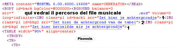 qui puoi trovare qualche risposta ai tuoi dubbi. Se l'argomento che ti interessa non è presente, ti prego di segnalarmelo. Occorrente: Materiale qui Il tube è di Top Design. Metti il pennello nella cartella dei pennelli. se hai problemi con i pennelli vedi qui Filtri: Greg's Factory Output II qui Imposta il colore di primo piano con #ea8659, e il colore di sfondo con #000000 (nero). 1. Apri una nuova immagine trasparente 488 x 375 pixels, e riempila con il colore di primo piano.2. Effetti>Plugins>Greg's Factory Output II - Pool Shadow, con i seguenti settaggi. ![]() 3. Attiva lo strumento Pennello ![]() cerca e seleziona il pennello "BC bruche 25", e applicalo cliccando con il tasto destro del mouse, per usare il colore di sfondo. attenzione, il pennello fornito con il materiale è stato ridenominato "Kopie van BC-bruche25", quindi non lo troverai alla lettera "B" ma alla lettera "K"> 4. Apri il tube della donna. Immagine>Ridimensiona, a 360 pixels di altezza. 5. Regola>Saturazione e tonalità>Viraggio: ![]() 6. Modifica>Copia. Torna al tuo lavoro e vai a Modifica>Incolla>Incolla come nuovo livello. Sposta il tube nell'angolo a sinistra.7. Apri il tube delle candele. Immagine>Ridimensiona - 230 di larghezza e 280 di altezza, mantieni proporzioni non selezionato. Regola>Messa a fuoco>Metti a fuoco. Modifica>copia. 8. Torna al tuo lavoro e vai a Modifica>Incolla>Incolla come nuovo livello. Posiziona il tube contro il braccio della donna.9. Apri il piccolo tube dell'uomo e vai a Modifica>Copia. Torna al tuo lavoro e vai a Modifica>Incolla>Incolla come nuovo livello. Posiziona il tube sopra le candele.Abbassa l'opacità di questo livello al 40%. 10. Livelli>Unisci>Unisci tutto. 11. Immagine>Aggiungi bordatura, 5 pixels, simmetriche, con il colore nero. Immagine>Aggiungi bordatura, 1 pixel, simmetriche, con il colore bianco. Seleziona questo bordo con la bacchetta magica ![]() ![]() se non hai un motivo oro clicca qui Riempi la selezione con il motivo oro.Selezione>Nessuna selezione. Immagine>Aggiungi bordatura, 2 pixels, simmetriche, con il colore nero. Immagine>Aggiungi bordatura, 1 pixel, simmetriche, con il colore bianco. Seleziona questo bordo con la bacchetta magica ![]() e riempilo con il motivo oro.Selezione>Nessuna selezione. 12. L'immagine è finita. Se intendi realizzare lo script è importante che abbia queste dimensioni: Immagine>Ridimensiona - 510 x 397 pixels. Per lo script, oltre a questa, ti occorrono anche due immagini di sfondo; e una di questa andrà inserita nello script due volte. Per eseguire lo script Apri lo script di Jeannette che trovi qui, e segui i preliminari descritti alla fine di questo tutorial, fino all'inserimento dello sfondo-suono. Dopo aver inserito lo sfondo-suono, dovrai indicare allo script dove trovare le immagini. Clicca su Origine e identifica i punti di inserimento dei vari elementi dello script. Se hai messo tutti i file in una cartella, il percorso del suono ti servirà da guida per l'inserimento degli altri files: ti basterà cambiare l'ultima parte: il nome e l'estensione. Nella schermata sotto sono indicati i punti in cui dovrai inserire, tra le virgolette, il percorso delle due immagini di sfondo, 1. In queste due posizioni, inserisci il percorso dell'immagine di sfondo. 2. Qui inserisci il percorso dello sfondo che servirà per le tabelle. ![]() Nella schermata sotto è indicato il punto in cui dovrai inserire il percorso dell'immagine principale. ![]() Ricorda che, contemporaneamente, puoi controllare il risultato andando su Anteprima. fai molta attenzione alle estensioni dei files e alle maiuscole-minuscole, che devono essere corrette, altrimenti lo script non troverà le immagini da inserire Clicca adesso sulla linguetta Modifica, per aggiungere il testo. clicca due volte all'interno del riquadro. Apparirà la cornice che ti dà il via libera per sostituire il testo esistente e aggiungere il tuo. Quando hai finito, clicca all'esterno e la cornice sparirà. Il tuo messaggio con lo script è pronto per il tasto Invia. Se non vuoi spedirlo e vuoi soltanto tenerlo per te, vai a File>Salva con nome e mettilo in una cartella a tua scelta. Ricordati, però, che quando vorrai rivedere lo script, i files devono trovarsi nello stesso posto. Se nel frattempo li avrai spostati, vedrai soltanto delle crocette rosse. Avvertimento: non devi preoccuparti se in Modifica non vedrai il messaggio come dovrebbe essere (per fare questo devi andare in Anteprima). Ricorda ancora che per inviare il messaggio ti devi posizionare su Modifica. ![]() Se hai problemi o dubbi, o trovi un link non funzionante, o anche soltanto per dirmi che ti è piaciuto, scrivimi. 21 Aprile 2008 |