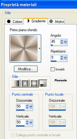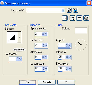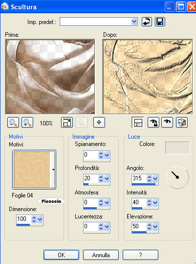 qui puoi trovare qualche risposta ai tuoi dubbi. Se l'argomento che ti interessa non è presente, ti prego di segnalarmelo. Occorrente: Materiale qui I tubes sono di Wendy, Crystal e Filly Non aprire le gif in PSP. Ti serviranno se vorrai realizzare lo script. Imposta il colore di primo piano con #E8DFD7, e il colore di sfondo con #8D7765. 1. Apri una nuova immagine trasparente 600 x 450 pixels, e riempila con il colore di primo piano.2. Apri il tube con la rosa e vai a Modifica>copia. Torna al tuo lavoro e vai a Modifica>Incolla>Incolla come nuovo livello. 3. Effetti>Effetti di trama>Scultura, con i seguenti settaggi. ![]() 4. Livelli>Duplica. Sistema i due fiori in alto,Abbassa l'opacità di entrambi i livelli al 14%. Livelli>Unisci>Unisci visibile. 5. Modifica>Incolla>Incolla come nuovo livello (il tube del fiore dovrebbe essere ancora in memoria; se non è così attivalo nuovamente e copialo). Sposta la rosa nell'angolo in basso a sinistra.Abbassa l'opacità di questo livello all'80%. Livelli>Unisci>Unisci visibile. 6. Apri il tube della donna (wb_pure), e vai a Modifica>Copia. Torna al tuo lavoro e vai a Modifica>Incolla come nuovo livello. Sposta il tube in basso a destra.Regola>Messa a fuoco>Metti a fuoco. 7. Effetti>Effetti 3D>Sfalsa ombra, con i seguenti settaggi. ![]() Livelli>Unisci>Unisci visibile. 8. Apri il tube con l'uomo e il bambino. Elimina il livello del watermark. 9. Livelli>Carica/Salva maschera da disco. Cerca e carica la maschera 20-20. ![]() se non hai questa maschera, clicca qui Livelli>elimina e rispondi sì alla domanda Unire la maschera nel livello corrente. Livelli>Unisci>Unisci gruppo. 10. Modifica>Copia. Torna al tuo lavoro e vai a Modifica>Incolla>Incolla come nuovo livello. Posiziona il tube sopra la rosa.Livelli>Unisci>Unisci tutto. 11. Passa il colore di primo piano a Gradiente, con i seguenti settaggi: ![]() 12. Immagine>Aggiungi bordatura, 1 pixel, simmetriche, con il colore di sfondo. Immagina>Aggiungi brodatura, 5 pixels, simmetriche, con il colore di primo piano. Immagine>Aggiungi bordatura, 1 pixel, simmetriche, con il colore di sfondo. Seleziona il bordo chiaro con la bacchetta magica ![]() ![]() e riempilo con il gradiente.13. Effetti>Effetti 3D>Smusso a incasso, con i seguenti settaggi: ![]() 14. Selezione>Nessuna selezione. L'immagine è finita. Se vuoi realizzare lo script, ti occorrono le due gif fornite con il materiale, e un'immagine di sfondo che servirà per le tabelle laterali. Per eseguire lo script Apri lo script di Jeannette che trovi qui, e segui i preliminari descritti alla fine di questo tutorial, fino all'inserimento dello sfondo-suono. Dopo aver inserito lo sfondo-suono, dovrai indicare allo script dove trovare le immagini. Clicca su Origine e identifica i punti di inserimento dei vari elementi dello script. Se hai messo tutti i file in una cartella, il percorso del suono ti servirà da guida per l'inserimento degli altri files: ti basterà cambiare l'ultima parte: il nome e l'estensione. Nella schermata sotto è indicato il punto in cui dovrai inserire il percorso dell'immagine di sfondo, che servirà per le tabelle laterali. ![]() Nella schermata sotto sono indicati i due punti in cui dovrai inserire il percorso dell'immagine principale e delle due gif. 1. Qui inserisci il percorso dell'immagine principale. 2. Qui inserisci il percorso della gif "gf_efa009". 3. Qui inserisci il percorso della gif "hartje". ![]() Ricorda che, contemporaneamente, puoi controllare il risultato andando su Anteprima. fai molta attenzione alle estensioni dei files e alle maiuscole-minuscole, che devono essere corrette, altrimenti lo script non troverà le immagini da inserire Clicca adesso sulla linguetta Modifica, per aggiungere il testo. clicca due volte all'interno del riquadro. Apparirà la cornice che ti dà il via libera per sostituire il testo esistente e aggiungere il tuo. Quando hai finito, clicca all'esterno e la cornice sparirà. Il tuo messaggio con lo script è pronto per il tasto Invia. Se non vuoi spedirlo e vuoi soltanto tenerlo per te, vai a File>Salva con nome e mettilo in una cartella a tua scelta. Ricordati, però, che quando vorrai rivedere lo script, i files devono trovarsi nello stesso posto. Se nel frattempo li avrai spostati, vedrai soltanto delle crocette rosse. Avvertimento: non devi preoccuparti se in Modifica non vedrai il messaggio come dovrebbe essere (per fare questo devi andare in Anteprima). Ricorda ancora che per inviare il messaggio ti devi posizionare su Modifica. ![]() Se hai problemi o dubbi, o trovi un link non funzionante, o anche soltanto per dirmi che ti è piaciuto, scrivimi. 3 Maggio 2008 |