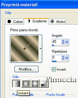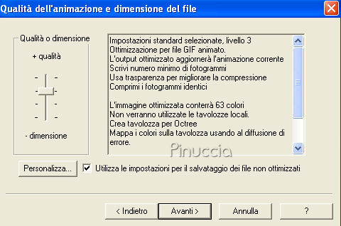 qui puoi trovare qualche risposta ai tuoi dubbi. Se l'argomento che ti interessa non è presente, ti prego di segnalarmelo. Occorrente: Materiale qui I tubes sono di Suzi Sgai e Carola. Non aprire le gif "sterretjes" e "vlammetje" in PSP. Serviranno per lo script. Imposta il colore di primo piano con #DAC7A6, e il colore di sfondo con #393921. 1. Apri una nuova immagine trasparente 550 x 400 pixels, e riempila con il colore di sfondo.ricorda che, per riempire con il colore di sfondo, devi cliccare con il tasto destro del mouse. 2. Apri il tube SS1239Misted e vai a Modifica>copia. Torna al tuo lavoro e vai a Modifica>Incolla>Incolla come nuovo livello. Sposta la rosa a sinistra.3. Apri il tube CarolaMists_Candles385. Immagine>Ridimensiona, a 300 pixels di larghezza. 4. Regola>Saturazione e tonalità>viraggio: ![]() 5. Modifica>copia. Torna al tuo lavoro e vai a Modifica>Incolla>Incolla come nuovo livello. Sposta le candele nell'angolo in basso a destra.6. Livelli>Unisci>Unisci tutto. 7. Immagine>Aggiungi bordatura, 1 pixels, simmetriche, con il colore di primo piano. Immagine>Aggiungi bordatura, 30 pixels, simmetriche, con il colore di sfondo. 8. Seleziona questo bordo con la bacchetta magica ![]() ![]() Passa il colore di primo piano a Gradiente di primo piano/sfondo, con i seguenti settaggi: ![]() Riempi il bordo con il gradiente.9. Effetti>Effetti di distorsione>Volute: ![]() 10. Effetti>Effetti 3D>Smusso a incasso: ![]() 11. Selezione>Nessuna selezione. 12. Immagine>Aggiungi bordatura, 1 pixel, simmetriche, con il colore di primo piano. 13. Chiudi il colore di primo piano e passa il colore di sfondo con il gradiente del punto 8. 14. Attiva lo strumento Testo , seleziona un bel font e scrivi il tuo testo.15. Effetti>effetti 3D>Sfalsa ombra, con i seguenti settaggi: ![]() per il mio testo ho usato il font Bickham Script Fancy 2 16. Selezione>Nessuna selezione. Aggiungi il tuo nome e/o il tuo watermark. Livelli>Unisci>Unisci tutto. L'immagine è finita. Per aggiungere le fiammelle alle candele. Copia l'immagine: Modifica>Copia. Apri Animation Shop. Clicca con il tasto destro del mouse e Incolla come nuova animazione. ![]() Modifica>Duplica e ripeti per ottenere tre fotogrammi. Clicca sul primo fotogramma per selezionarlo e vai a Modifica>Seleziona tutto. Apri la gif "vlammetje" che ti è stata fornita con il materiale. Clicca sul primo fotogramma per selezionarlo e vai a Modifica>Seleziona tutto e poi Modifica>Copia. Torna al tuo lavoro e vai a Modifica>Incolla>Incolla nel fotogramma selezionato. Posiziona la fiammella sulla prima candela e rilascia il tasto del mouse quando hai trovato la posizione corretta. Ripeti Modifica>Incolla>Incolla nel fotogramma selezionato per posizionare la fiammella sulla terza candela. Attiva la gif "vlammetje" e vai a Animazione>Rifletti. ![]() Modifica>Copia. Ritorna al tuo lavoro e vai a Modifica>Incolla>Incolla nel fotogramma selezionato, e posiziona la fiammella sulla candela centrale. Salva in formato gif, con la compressione impostata come nella schermata sotto ![]() L'immagine è finita. Per realizzare lo script ti occorrono anche due immagini di sfondo e la gif delle stelline "Kopie van Sterretje", che hai trovato nello zip. Per eseguire lo script Apri lo script di Jeannette che trovi qui, e segui i preliminari descritti alla fine di questo tutorial, fino all'inserimento dello sfondo-suono. Dopo aver inserito lo sfondo-suono, dovrai indicare allo script dove trovare le immagini. Clicca su Origine e identifica i punti di inserimento dei vari elementi dello script. Se hai messo tutti i file in una cartella, il percorso del suono ti servirà da guida per l'inserimento degli altri files: ti basterà cambiare l'ultima parte: il nome e l'estensione. Nella schermata sotto sono indicati i punti in cui dovrai inserire, tra le virgolette, il percorso delle due immagini di sfondo, 1. Qui inserisci il percorso del primo sfondo. 2. Qui inserisci il secondo sfondo che servirà per le tabelle e per la sezione del testo. ![]() Nella schermata sotto è indicato il punto in cui dovrai inserire: 1. il percorso dell'immagine principale. 2. il percorso delle stelline. Attenzione!, ricorda che entrambi i files hanno estensione .gif. ![]() Ricorda che, contemporaneamente, puoi controllare il risultato andando su Anteprima. fai molta attenzione alle estensioni dei files e alle maiuscole-minuscole, che devono essere corrette, altrimenti lo script non troverà le immagini da inserire Clicca adesso sulla linguetta Modifica, per aggiungere il testo. clicca due volte all'interno del riquadro. Apparirà la cornice che ti dà il via libera per sostituire il testo esistente e aggiungere il tuo. Quando hai finito, clicca all'esterno e la cornice sparirà. Il tuo messaggio con lo script è pronto per il tasto Invia. Se non vuoi spedirlo e vuoi soltanto tenerlo per te, vai a File>Salva con nome e mettilo in una cartella a tua scelta. Ricordati, però, che quando vorrai rivedere lo script, i files devono trovarsi nello stesso posto. Se nel frattempo li avrai spostati, vedrai soltanto delle crocette rosse. Avvertimento: non devi preoccuparti se in Modifica non vedrai il messaggio come dovrebbe essere (per fare questo devi andare in Anteprima). Ricorda ancora che per inviare il messaggio ti devi posizionare su Modifica. ![]() Se hai problemi o dubbi, o trovi un link non funzionante, o anche soltanto per dirmi che ti è piaciuto, scrivimi. 19 Novembre 2007 |