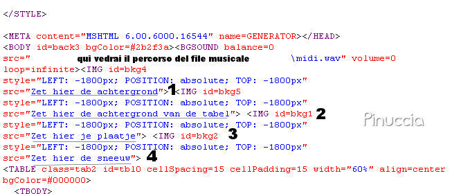 qui puoi trovare qualche risposta ai tuoi dubbi. Se l'argomento che ti interessa non è presente, ti prego di segnalarmelo. Occorrente: Materiale qui Le casette sono di Raz e Crystal, il resto è di Jeannette. Non aprire la neve e il tube merry-christmas in PSP. Servono per lo script. 1. Apri la foto "Sneeuwlandschap_naadloos". Immagine>Rifletti. 2. Apri i tubes delle casette e vai a Modifica>Copia. Torna al tuo lavoro e vai a Modifica>Incolla>Incolla come nuovo livello. Immagine>Rifletti e posiziona le casette una contro il bordo destro e una contro il bordo sinistro.Attiva lo strumento Gomma e cancella le parti del tube che "disturbano" il paesaggio,vedi gli esempi sotto. Non dimenticare, prima di cancellare, di posizionarti sul livello corrispondente. ![]() ![]() 3. Apri il tube del babbo natale sulla slitta, e vai a Modifica>Copia. Torna al tuo lavoro e vai a Modifica>Incolla>Incolla come nuovo livello. Immagine>Ruota>Ruota per gradi, 3 gradi a sinistra. ![]() Non aggiungere bordi. L'immagine è finita. Se vuoi realizzare lo script di Jeannette, ti servono anche due immagini di sfondo, e le gif che hai trovato nello zip: sneeuw e merrychristmis. Per eseguire lo script Apri lo script di Jeannette che trovi qui, e segui i preliminari descritti alla fine di questo tutorial, fino all'inserimento dello sfondo-suono. Dopo aver inserito lo sfondo-suono, dovrai indicare allo script dove trovare le immagini. Clicca su Origine e identifica i punti di inserimento dei vari elementi dello script. Se hai messo tutti i file in una cartella, il percorso del suono ti servirà da guida per l'inserimento degli altri files: ti basterà cambiare l'ultima parte: il nome e l'estensione. Nella schermata sotto sono indicati i punti in cui dovrai inserire, tra le virgolette: 1. il percorso dell'immagine di sfondo (tabelle esterne). 2. il percorso della seconda immagine di sfondo (tabelle interne). 3. il percorso dell'immagine principale. 4. il percorso della gif sneeuw. ![]() Nella schermata sotto è indicato il punto in cui dovrai inserire il percorso della gif "Merry Christmis". ![]() Ricorda che, contemporaneamente, puoi controllare il risultato andando su Anteprima. fai molta attenzione alle estensioni dei files e alle maiuscole-minuscole, che devono essere corrette, altrimenti lo script non troverà le immagini da inserire Clicca adesso sulla linguetta Modifica, per aggiungere il testo. clicca due volte all'interno del riquadro. Apparirà la cornice che ti dà il via libera per sostituire il testo esistente e aggiungere il tuo. Quando hai finito, clicca all'esterno e la cornice sparirà. Il tuo messaggio con lo script è pronto per il tasto Invia. Se non vuoi spedirlo e vuoi soltanto tenerlo per te, vai a File>Salva con nome e mettilo in una cartella a tua scelta. Ricordati, però, che quando vorrai rivedere lo script, i files devono trovarsi nello stesso posto. Se nel frattempo li avrai spostati, vedrai soltanto delle crocette rosse. Avvertimento: non devi preoccuparti se in Modifica non vedrai il messaggio come dovrebbe essere (per fare questo devi andare in Anteprima). Ricorda ancora che per inviare il messaggio ti devi posizionare su Modifica. ![]() Se hai problemi o dubbi, o trovi un link non funzionante, o anche soltanto per dirmi che ti è piaciuto, scrivimi. 6 Novembre 2007 |