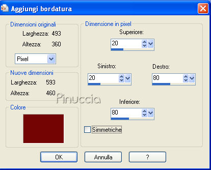 qui puoi trovare qualche risposta ai tuoi dubbi. Se l'argomento che ti interessa non è presente, ti prego di segnalarmelo. Occorrente: Materiale qui Ti servirà anche un motivo oro. Se non ce l'hai clicca qui Il bel tube della candela è di SDH. Filtro Tramage qui Apri il font e minimizzalo nella tua area di lavoro. Lo troverai nella lista dei font disponibili, quando ti servirà. Apri il motivo oro e minimizzalo nella tua area di lavoro. Lo troverai nella lista dei motivi disponibili, quando ti servirà. Imposta il colore di primo piano con #740606. Passa il colore di sfondo a Motivi. Apri il menu cliccando sulla freccia a fianco del box, e nella lista dei motivi, con i files aperti in PSP, anche il motivo oro. Selezionalo con i settaggi standard. ![]() 1. Apri il tube con la candela "candlewithwhite_poinsettias". Elimina il livello del watermark. Livelli>Nuovo livello raster. Riempi con il colore di primo piano.Effetti>Plugins>Tramage - Zero Tolerance: ![]() 2. Livelli>Disponi>Sposta giù. 3. Attiva il livello superiore. Effetti>Effetti 3D>Sfalsa ombra: ![]() Ripeti l'Effetto Sfalsa ombra, ma cambiando verticale e orizzontale a -3. 4. Livelli>Unisci>Unisci tutto. 5. Immagine>Aggiungi bordatura, 2 pixels, simmetriche, con il colore giallo. Seleziona il bordo con la bacchetta magica ![]() ![]() Riempi la selezione con il motivo oro.ricordati che hai impostato il motivo oro come colore di sfondo; quindi, per riempire, devi cliccare con il tasto destro del mouse Selezione>Nessuna selezione. 6. Immagine>Aggiungi bordatura, simmetriche non selezionato, con il colore di primo piano: ![]() 7. Seleziona il bordo con la bacchetta magica ![]() Effetti>Plugins>Tramage - Tow the line: ![]() 8. Selezione>inverti. Ripeti il punto 3. Selezione>Nessuna selezione. 9. Immagine>Aggiungi bordatura, 2 pixels, simmetriche, con il colore bianco. Seleziona il bordo con la bacchetta magica ,e riempilo con il motivo oro.Selezione>Nessuna selezione. 10. Apri una nuova immagine con il colore di primo piano 586 x 77 pixels. ![]() Attiva lo strumento Testo ,chiudi il colore di primo piano. Seleziona il font Christmas, dimensione 36, crea come vettore. Scrivi il tuo testo e posizionalo. Livelli>converti in livello raster. 11. Effetti>Effetti 3D>Sfalsa ombra, con i settaggi usati al punto 3. 12. Immagine>Aggiungi bordatura, 2 pixels, simmetriche, con il colore bianco. Seleziona il bordo con la bacchetta magica ,e riempilo con il motivo oro.Selezione>Nessuna selezione. 13. Apri il tube della pallina "jeanbal" e vai a Modifica>Copia. Torna al tuo lavoro e vai a Modifica>Incolla>Incolla come nuovo livello. Posiziona la pallina in alto a destra.14. Apri il tube con la pallina di natale e vai a Modifica>Copia. Torna al tuo lavoro e vai a Modifica>Incolla>Incolla come nuovo livello. Se intendi realizzare lo script di Jeannette questa pallina ti servirà per lo script. Poichè il tube è in formato psp (non riconosciuto dagli script), anche per mantenerne la trasparenza, dovrai salvarla in formato gif. File>Esporta>Ottimizzazione gif e salva la pallina con un nome a tua scelta. Come ottimizzare una gif vedi qui L'immagine è finita. Se vuoi realizzare lo script di Jeannette, oltre all'immagine e alla pallina in formato gif, ti serve un'immagine di sfondo con un motivo oro. Per eseguire lo script Apri lo script di Jeannette che trovi qui, e segui i preliminari descritti alla fine di questo tutorial, fino all'inserimento dello sfondo-suono. Dopo aver inserito lo sfondo-suono, dovrai indicare allo script dove trovare le immagini. Clicca su Origine e identifica i punti di inserimento dei vari elementi dello script. Se hai messo tutti i file in una cartella, il percorso del suono ti servirà da guida per l'inserimento degli altri files: ti basterà cambiare l'ultima parte: il nome e l'estensione. Nelle schermate sotto sono indicati i punti in cui dovrai inserire, tra le virgolette, il percorso delle tre immagini che servono per lo script. Nella schermata sotto è indicato il punto in cui dovrai inserire il percorso dell'immagine di sfondo con il motivo oro. ![]() Nella schermata sotto è indicato il punto in cui dovrai inserire il percorso dell'immagine principale. ![]() Nella schermata sotto è indicato il punto in cui dovrai inserire il percorso della gif della pallina. ![]() Ricorda che, contemporaneamente, puoi controllare il risultato andando su Anteprima. fai molta attenzione alle estensioni dei files e alle maiuscole-minuscole, che devono essere corrette, altrimenti lo script non troverà le immagini da inserire Clicca adesso sulla linguetta Modifica, per aggiungere il testo. clicca due volte all'interno del riquadro. Apparirà la cornice che ti dà il via libera per sostituire il testo esistente e aggiungere il tuo. Quando hai finito, clicca all'esterno e la cornice sparirà. Il tuo messaggio con lo script è pronto per il tasto Invia. Se non vuoi spedirlo e vuoi soltanto tenerlo per te, vai a File>Salva con nome e mettilo in una cartella a tua scelta. Ricordati, però, che quando vorrai rivedere lo script, i files devono trovarsi nello stesso posto. Se nel frattempo li avrai spostati, vedrai soltanto delle crocette rosse. Avvertimento: non devi preoccuparti se in Modifica non vedrai il messaggio come dovrebbe essere (per fare questo devi andare in Anteprima). Ricorda ancora che per inviare il messaggio ti devi posizionare su Modifica. ![]() Se hai problemi o dubbi, o trovi un link non funzionante, o anche soltanto per dirmi che ti è piaciuto, scrivimi. 6 Novembre 2007 |