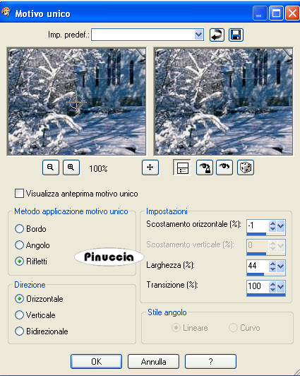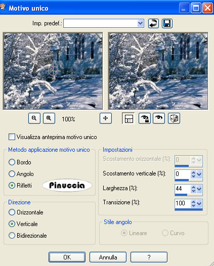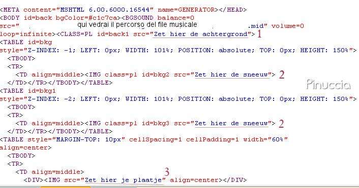 qui puoi trovare qualche risposta ai tuoi dubbi. Se l'argomento che ti interessa non è presente, ti prego di segnalarmelo. Occorrente: Materiale qui Il tube viene dal gruppo di Crystal, la foto da Internet. Non aprire il file sneeuw1.gif in PSP. Ti servirà se vorrai realizzare lo script. 1. Apri la foto, duplicala con shift+D e metti da parte l'originale. La copia sarà la base del tuo lavoro. 2. Apri il tube del Babbo Natale e vai a Modifica>Copia. Torna alla foto e vai a Modifica>Incolla>Incolla come nuovo livello. Effetti>Effetti 3D>Sfalsa ombra. ![]() 3. Apri il tube con l'angelo e vai a Modifica>Copia. Torna al tuo lavoro e vai a Modifica>Incolla>Incolla come nuovo livello. Sposta il tube nell'angolo in alto a destra.Abbassa l'opacità di questo livello al 25%. Livelli>Unisci>Unisci visibile. 4. Attiva lo strumento Ornamento , seleziona una stella e applicala sul campanile della chiesa.![]() 5. Attiva lo strumento Testo , chiudi il colore di primo piano e imposta un colore rosso come colore di sfondo.Scrivi il tuo testo. Regola>Messa a fuoco>Metti a fuoco. 6. Immagine>Aggiungi bordatura, 10 pixels, simmetriche, con il colore rosso. Seleziona il bordo con la bacchetta magica ![]() ![]() Effetti>Effetti 3D>Smusso a incasso: ![]() 7. Selezione>Nessuna selezione. L'immagine è finita. 8. Apri nuovamente la foto originale, ti servirà per lo sfondo. Effetti>Effetti di immagine>Motivo unico: ![]() 9. Ripeti l'Effetto Motivo unico, ma selezionando Orizzontale. ![]() Questo sarà lo sfondo per lo script. Oltre a questo e all'immagine principale, ti servirà la gif della neve (nello zip), che dovrai inserire due volte. Per eseguire lo script Apri lo script di Jeannette che trovi qui, e segui i preliminari descritti alla fine di questo tutorial, fino all'inserimento dello sfondo-suono. Dopo aver inserito lo sfondo-suono, dovrai indicare allo script dove trovare le immagini. Clicca su Origine e identifica i punti di inserimento dei vari elementi dello script. Se hai messo tutti i file in una cartella, il percorso del suono ti servirà da guida per l'inserimento degli altri files: ti basterà cambiare l'ultima parte: il nome e l'estensione. Nella schermata sotto sono indicati i punti in cui dovrai inserire, tra le virgolette, il percorso delle immagini necessarie per lo script: 1. Qui inserisci il percorso dell'immagine di sfondo. 2. Qui inserisci il file "sneeuw1", che hai trovato con il materiale (non dimenticare che l'estensione del file è .gif). 3. Qui inserisci il percorso dell'immagine principale. ![]() Ricorda che, contemporaneamente all'inserimento dei percorsi, puoi controllare il risultato andando su Anteprima. fai molta attenzione alle estensioni dei files e alle maiuscole-minuscole, che devono essere corrette, altrimenti lo script non troverà le immagini da inserire Clicca adesso sulla linguetta Modifica, per aggiungere il testo. clicca due volte all'interno del riquadro. Apparirà la cornice che ti dà il via libera per sostituire il testo esistente e aggiungere il tuo. Quando hai finito, clicca all'esterno e la cornice sparirà. Il tuo messaggio con lo script è pronto per il tasto Invia. Se non vuoi spedirlo e vuoi soltanto tenerlo per te, vai a File>Salva con nome e mettilo in una cartella a tua scelta. Ricordati, però, che quando vorrai rivedere lo script, i files devono trovarsi nello stesso posto. Se nel frattempo li avrai spostati, vedrai soltanto delle crocette rosse. Avvertimento: non devi preoccuparti se in Modifica non vedrai il messaggio come dovrebbe essere (per fare questo devi andare in Anteprima). Ricorda ancora che per inviare il messaggio ti devi posizionare su Modifica. ![]() Se hai problemi o dubbi, o trovi un link non funzionante, o anche soltanto per dirmi che ti è piaciuto, scrivimi. 18 Novembre 2007 |