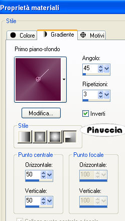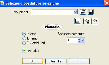 qui puoi trovare qualche risposta ai tuoi dubbi. Se l'argomento che ti interessa non è presente, ti prego di segnalarmelo. Occorrente: Materiale qui I tubes sono di Jeannette. Filtri: Greg's Factory Output II qui Imposta il colore di primo piano con #590a37, e il colore di sfondo con #7f4c6d. Passa il colore di primo piano a Gradiente: ![]() 1. Apri una nuova immagine trasparente 450 x 450 pixels, e riempila con il gradiente.2. Attiva lo strumento Forme predefinite ![]() e seleziona la forma all25. Dovrebbe essere standard in PSP9. Se non ce l'hai vedi questo tutorial 3. Traccia la forma partendo dall'angolo in alto a sinistra, fino all'angolo in basso a destra. 4. Livelli>Converti in livello raster. Attiva lo strumento Bacchetta magica ![]() ![]() e seleziona tutti le parti nere. ![]() se il tuo PSP non ha l'impostazione "aggiungi", selezionando tieni premuto il tasto della maiuscola 5. Riporta il colore di primo piano al colore #590a37. Livelli>Nuovo livello raster. Riempi le selezioni con il colore di primo piano.impostando lo strumento in modalità "Nessuno", per riempire sarà sufficiente un solo clic. 6. Effetti>Effetti 3D>sfalsa ombra: ![]() Ripeti l'Effetto Sfalsa ombra, ma cambiando verticale e orizzontale con -3. Mantieni selezionato. 7. Effetti>Plugins>Greg's Factory - Pool Shadow: ![]() 8. Selezione>Modifica>Seleziona bordature selezione - 1 pixel, interno. ![]() Livelli>Nuovo livello raster. Riempi con il colore di sfondo.Selezione>Nessuna selezione. Livelli>Unisci>Unisci tutto. 9. Immagine>Aggiungi bordatura, 1 pixel, simmetriche, con il colore nero. Immagine>Aggiungi bordatura, 1 pixel, simmetriche, con il colore bianco. Seleziona questo bordo con la bacchetta magica ![]() Imposta il colore di primo piano con un motivo oro e riempi la selezione con questo motivo.se non hai un motivo oro clicca qui Immagine>Aggiungi bordatura, 1 pixel, simmetriche, con il colore nero. 10. Immagine>Aggiungi bordatura, 5 pixels, simmetriche, con il colore di primo piano. Ripeti il punto 9. 11. Chiudi il colore di primo piano. Attiva lo strumento Testo e scegli un font.Per il mio testo ho usato il font Bookman old style, dimensione 16. Dovrai adattare la dimensione a seconda del testo e della versione di PSP che stai usando. 12. Effetti>Effetti 3D>Sfalsa ombra: ![]() Regola>Messa a fuoco>Metti a fuoco, 2 volte. Selezione>Nessuna selezione. Duplica l'immagine, usando sulla tastiera la combinazione shift(maiuscola)+D. Adesso hai tre immagini. 14. Uno alla volta apri i tre tube dei fiori e vai a Modifica>Copia. Attiva una delle tre immagini e vai a Modifica>Incolla>Incolla come nuovo livello. Effetti>Effetti 3D>Sfalsa ombra, con i settaggi precedenti. Livelli>Unisci>Unisci tutto. Alla fine, ogni immagine avrà il suo fiore. Adesso che le immagini sono pronte, se vuoi, puoi realizzare lo script. Per questo ti serviranno anche due immagini di sfondo. Per eseguire lo script Apri lo script di Jeannette che trovi qui, e segui i preliminari descritti alla fine di questo tutorial, fino all'inserimento dello sfondo-suono. Dopo aver inserito lo sfondo-suono, dovrai indicare allo script dove trovare le immagini. Clicca su Origine e identifica i punti di inserimento dei vari elementi dello script. Se hai messo tutti i file in una cartella, il percorso del suono ti servirà da guida per l'inserimento degli altri files: ti basterà cambiare l'ultima parte: il nome e l'estensione. Nella schermata sotto sono indicati i punti in cui dovrai inserire, tra le virgolette, il percorso delle due immagini di sfondo, 1. Qui inserisci il percorso della prima immagine di sfondo. 2. Qui inserisci il percorso del secondo sfondo che servirà per le tabelle. ![]() Nella schermata sotto è indicato il punto in cui dovrai inserire il percorso delle tre immagini principali. 1. Qui la prima immagine. 2. Qui la seconda immagine. 3. Qui la terza immagine. ![]() Ricorda che, contemporaneamente, puoi controllare il risultato andando su Anteprima. fai molta attenzione alle estensioni dei files e alle maiuscole-minuscole, che devono essere corrette, altrimenti lo script non troverà le immagini da inserire Clicca adesso sulla linguetta Modifica, per aggiungere il testo. clicca due volte all'interno del riquadro. Apparirà la cornice che ti dà il via libera per sostituire il testo esistente e aggiungere il tuo. Quando hai finito, clicca all'esterno e la cornice sparirà. Il tuo messaggio con lo script è pronto per il tasto Invia. Se non vuoi spedirlo e vuoi soltanto tenerlo per te, vai a File>Salva con nome e mettilo in una cartella a tua scelta. Ricordati, però, che quando vorrai rivedere lo script, i files devono trovarsi nello stesso posto. Se nel frattempo li avrai spostati, vedrai soltanto delle crocette rosse. Avvertimento: non devi preoccuparti se in Modifica non vedrai il messaggio come dovrebbe essere (per fare questo devi andare in Anteprima). Ricorda ancora che per inviare il messaggio ti devi posizionare su Modifica. ![]() Se hai problemi o dubbi, o trovi un link non funzionante, o anche soltanto per dirmi che ti è piaciuto, scrivimi. 21 Aprile 2008 |