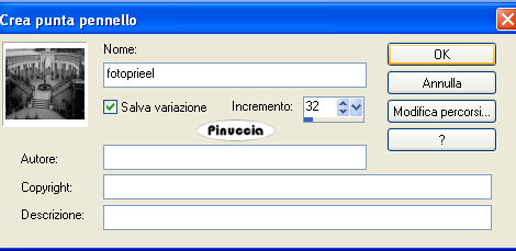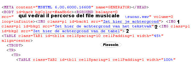 qui puoi trovare qualche risposta ai tuoi dubbi. Se l'argomento che ti interessa non è presente, ti prego di segnalarmelo. Occorrente: Materiale qui I tubes sono di Hanne e Yoka. Il motivo oro è di Jeannette e la foto viene da Internet. Metti il motivo nella cartella dei Motivi. Se lo apri e minimizzi nella tua area di lavoro, lo troverai tra i motivi disponibili quando ti servirà. Imposta il colore di primo piano con il motivo oro: ![]() e imposta il colore di sfondo con #EBD3CB. 1. Apri la foto "Prieel". File>Esporta>Pennello personalizzata - assegna un nome al pennello e clicca ok. ![]() 2. Apri una nuova immagine trasparente 500 x 450 pixels, e riempila con il motivo oro.3. Attiva lo strumento Pennello ![]() cerca e seleziona il pennello che hai esportato, e clicca con il tasto destro del mouse, per applicarlo con il colore di sfondo. Immagine>Ridimensiona, 600 x 450 pixels, mantieni proporzioni non selezionato. ![]() 4. Effetti>Effetti di bordo>Aumenta di più. 5. Apri il tube con la coppia "Hanne Misted couple08", e vai a Modifica>Copia. Torna al tuo lavoro e vai a Modifica>Incolla>Incolla come nuovo livello. Spostalo nell'angolo in basso a sinistra.6. Apri il tube con il viso "Yoka MistedChild'sface", e vai a Modifica>Copia. Torna al tuo lavoro e vai a Modifica>Incolla>Incolla come nuovo livello. Spostalo in alto a destra.7. Apri il tube con i fiori "Yoka Jdl FlowerMisted", e vai a Modifica>Copia. Torna al tuo lavoro e vai a Modifica>Incolla>Incolla come nuovo livello. Spostalo nell'angolo in basso a destra.8. Livelli>Unisci>Unisci tutto. 9. Immagine>Aggiungi bordatura, 5 pixels, simmetriche, con il colore nero. Seleziona questo bordo con la bacchetta magica ![]() ![]() Livelli>Nuovo livello raster. Riempi con il colore di sfondo.10. Effetti>Effetti 3D>Smusso a incasso: ![]() Selezione>Nessuna selezione. 11. Livelli>Unisci>Unisci tutto. L'immagine è finita. Per realizzare lo script, ti occorrono anche due immagini di sfondo. Per eseguire lo script Apri lo script di Jeannette che trovi qui, e segui i preliminari descritti alla fine di questo tutorial, fino all'inserimento dello sfondo-suono. Dopo aver inserito lo sfondo-suono, dovrai indicare allo script dove trovare le immagini. Clicca su Origine e identifica i punti di inserimento dei vari elementi dello script. Se hai messo tutti i file in una cartella, il percorso del suono ti servirà da guida per l'inserimento degli altri files: ti basterà cambiare l'ultima parte: il nome e l'estensione. Nella schermata sotto sono indicati i punti in cui dovrai inserire, tra le virgolette, il percorso delle due immagini di sfondo, 1. Qui inserisci il percorso dell'immagine di sfondo. 2. In questi due punti inserisci il percorso dello sfondo che ti servirà per le tabelle e per la sezione del testo. ![]() Nella schermata sotto sono indicati i punti in cui dovrai inserire il percorso dell'immagine principale. ![]() Ricorda che, contemporaneamente, puoi controllare il risultato andando su Anteprima. fai molta attenzione alle estensioni dei files e alle maiuscole-minuscole, che devono essere corrette, altrimenti lo script non troverà le immagini da inserire Clicca adesso sulla linguetta Modifica, per aggiungere il testo. clicca due volte all'interno del riquadro. Apparirà la cornice che ti dà il via libera per sostituire il testo esistente e aggiungere il tuo. Quando hai finito, clicca all'esterno e la cornice sparirà. Il tuo messaggio con lo script è pronto per il tasto Invia. Se non vuoi spedirlo e vuoi soltanto tenerlo per te, vai a File>Salva con nome e mettilo in una cartella a tua scelta. Ricordati, però, che quando vorrai rivedere lo script, i files devono trovarsi nello stesso posto. Se nel frattempo li avrai spostati, vedrai soltanto delle crocette rosse. Avvertimento: non devi preoccuparti se in Modifica non vedrai il messaggio come dovrebbe essere (per fare questo devi andare in Anteprima). Ricorda ancora che per inviare il messaggio ti devi posizionare su Modifica. ![]() Se hai problemi o dubbi, o trovi un link non funzionante, o anche soltanto per dirmi che ti è piaciuto, scrivimi. 21 Aprile 2008 |