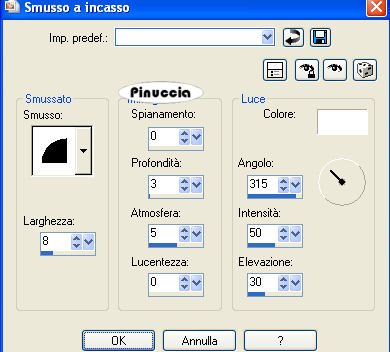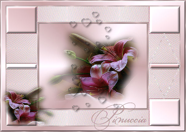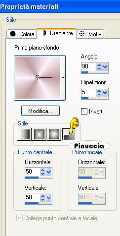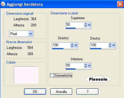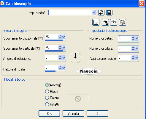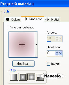 qui puoi trovare qualche risposta ai tuoi dubbi. Se l'argomento che ti interessa non è presente, ti prego di segnalarmelo. Occorrente: Materiale qui Il tube dei fiori è di Patry. Imposta il colore di primo piano con #BF9D9F, e il colore di sfondo con #FDF2FA. Passa il colore di primo piano a Gradiente di primo piano/sfondo con i seguenti settaggi. ![]() 1. Apri il tube dei fiori. Modifica>Copia, e metti da parte l'originale che ti servirà più tardi. Modifica>Incolla>Incolla come nuova immagine. Livelli>Nuovo livello raster. Riempi con il gradiente.Livelli>Disponi>Porta sotto. 2. Livelli>Unisci>Unisci tutto. Immagine>Ridimensiona, a 350 pixels di larghezza, mantieni proporzioni e tutti i livelli selezionati. ![]() Regola>Messa a fuoco>Metti a fuoco. 3. Immagine>Aggiungi bordatura, 1 pixel, simmetriche, con il colore di primo piano. Immagine>Aggiungi bordatura, 1 pixel, simmetriche, con il colore nero. Seleziona questo bordo con la bacchetta magica ![]() e riempilo con un motivo argento.4. Immagine>Aggiungi bordatura, 2 pixels, simmetriche, con il colore di primo piano. Immagine>Aggiungi bordatura, 1 pixel, simmetriche, con il colore nero. Seleziona questo bordo con la bacchetta magica ![]() e riempilo con un motivo argento.Immagine>Aggiungi bordatura, 1 pixel, simmetriche, con il colore di primo piano. 5. Immagine>Aggiungi bordatura, simmetriche non selezionato, con il colore di sfondo e i seguenti settaggi. ![]() 6. Cambia i settaggi del gradiente: ![]() 7. Seleziona il bordo con la bacchetta magica ![]() Livelli>Nuovo livello raster. Riempi con il gradiente.8. Effetti>Effetti di bordo>Aumenta di più, 2 volte. 9. Effetti>Effetti di riflesso>Caleidoscopio: ![]() 10. Regola>Messa a fuoco>Metti a fuoco, 2 volte. Selezione>Nessuna selezione. Livelli>Unisci>Unisci tutto. 11. Con la bacchetta magica seleziona le parti chiare.(in totale sono sei sezioni, non dimenticare le più piccole). ![]() 12. Cambia nuovamente i settaggi del gradiente, impostando quelli iniziali. ![]() 13. Livelli>Nuovo livello raster. Riempi con il gradiente.14. Effetti>Effetti 3D>Smusso a incasso: ![]() 15. Livelli>Unisci>Unisci visibile. Selezione>Nessuna selezione. 16. Immagine>Aggiungi bordatura, 1 pixel, simmetriche, con il colore di primo piano. Immagine>Aggiungi bordatura, 1 pixel, simmetriche, con il colore nero. Seleziona questo bordo con la bacchetta magica ![]() e riempilo con il motivo argento.Immagine>Aggiungi bordatura, 2 pixels, simmetriche, con il colore di primo piano. 17. Immagine>Aggiungi bordatura, 15 pixels, simmetriche, con il colore di sfondo. Seleziona questo bordo con la bacchetta magica ![]() e riempilo con il gradiente.18. Effetti>Effetti 3D>Smusso a incasso, con i seguenti settaggi: ![]() Selezione>Nessuna selezione. 19. Ripeti i bordi come al punto 16. 20. Attiva nuovamente il tube dei fiori. Immagine>Ridimensiona, a 200 pixels di larghezza. Regola>Messa a fuoco>Metti a fuoco. Immagine>Rifletti. 21. Modifica>Copia. Torna al tuo lavoro e vai a Modifica>Incolla>Incolla come nuovo livello. Sposta i fiori nell'angolo in basso a sinistra, vedi l'esempio finale.22. Apri il tube con i cuori e vai a Modifica>copia. Torna al tuo lavoro e vai a Modifica>Incolla>Incolla come nuovo livello. Posiziona il tube come nel mio esempio.Abbassa l'opacità di questo livello al 65%. 23. Livelli>Unisci>Unisci visibile. 24. Attiva lo strumento Penna , e seleziona Punte di freccia opposte-uguali:![]() 25. Traccia due linee come nell'esempio. ![]() Livelli>Converti in livello raster. Regola>Messa a fuoco>Metti a fuoco, 2 volte. Livelli>Duplica. Immagine>Capovolgi. Livelli>Unisci>Unisci tutto. L'immagine è finita. Se vuoi realizzare lo script ti occorrono anche due immagini di sfondo. Per eseguire lo script Apri lo script di Jeannette che trovi qui, e segui i preliminari descritti alla fine di questo tutorial, fino all'inserimento dello sfondo-suono. Dopo aver inserito lo sfondo-suono, dovrai indicare allo script dove trovare le immagini. Clicca su Origine e identifica i punti di inserimento dei vari elementi dello script. Se hai messo tutti i file in una cartella, il percorso del suono ti servirà da guida per l'inserimento degli altri files: ti basterà cambiare l'ultima parte: il nome e l'estensione. Nella schermata sotto è indicato il punto in cui dovrai inserire il percorso delle due immagini di sfondo. 1. Qui inserisci il percorso della prima immagine di sfondo. 2. Qui inserisci il percorso del secondo sfondo, che servirà per le tabelle laterali. 3. Qui inserisci nuovamente il percorso della prima immagine di sfondo, che servirà per le tabelle centrali. ![]() Nella schermata sotto è indicato il punto in cui dovrai inserire il percorso dell'immagine principale. ![]() Ricorda che, contemporaneamente, puoi controllare il risultato andando su Anteprima. fai molta attenzione alle estensioni dei files e alle maiuscole-minuscole, che devono essere corrette, altrimenti lo script non troverà le immagini da inserire Clicca adesso sulla linguetta Modifica, per aggiungere il testo. clicca due volte all'interno del riquadro. Apparirà la cornice che ti dà il via libera per sostituire il testo esistente e aggiungere il tuo. Quando hai finito, clicca all'esterno e la cornice sparirà. Il tuo messaggio con lo script è pronto per il tasto Invia. Se non vuoi spedirlo e vuoi soltanto tenerlo per te, vai a File>Salva con nome e mettilo in una cartella a tua scelta. Ricordati, però, che quando vorrai rivedere lo script, i files devono trovarsi nello stesso posto. Se nel frattempo li avrai spostati, vedrai soltanto delle crocette rosse. Avvertimento: non devi preoccuparti se in Modifica non vedrai il messaggio come dovrebbe essere (per fare questo devi andare in Anteprima). Ricorda ancora che per inviare il messaggio ti devi posizionare su Modifica. ![]() Se hai problemi o dubbi, o trovi un link non funzionante, o anche soltanto per dirmi che ti è piaciuto, scrivimi. 8 Giugno 2008 |