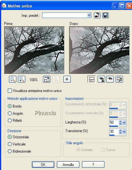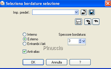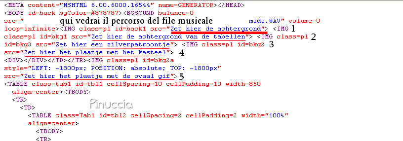 qui puoi trovare qualche risposta ai tuoi dubbi. Se l'argomento che ti interessa non è presente, ti prego di segnalarmelo. Occorrente: Materiale qui I bei tubes usati per questo tutorial sono di Azyzam, Marif e Gini. Ti servirà anche un motivo argento. Se non ce l'hai, clicca qui Dopo aver scompattato il file, apri il motivo Silver Foil e minimizzalo nella tua area di lavoro. Lo troverai nella lista dei motivi disponibili, quando ti servirà. Filtro: Filters Unlimited qui Imposta il colore di primo piano con il nero #000000, e il colore di sfondo con #c0c0c0. 1. Apri una nuova immagine trasparente 750 x 500 pixels, e riempila con il nero.2. Attiva lo strumento Selezione , ellisse,e traccia un'ellisse, il più grande possibile, al centro della tela. 3. Premi sulla tastiera il tasto canc ![]() ![]() 4. Selezione>Modifica>Seleziona bordature selezione: ![]() 5. Livelli>Nuovo livello raster. Passa il colore di primo piano a Motivi. Cerca e seleziona il motivo argento: ![]() Riempi il nuovo livello con questo motivo.6. Livelli>Unisci>Unisci visibile. Selezione>Nessuna selezione. 7. Attiva nuovamente lo strumento Selezione , freccia (scegli tra quelle disponibili),e traccia una freccia in alto a sinistra. 8. Ripeti i passaggi dal 3 al 6. 9. Imposta adesso lo strumento Selezione a cerchio,e traccia un cerchio in basso a sinistra. 10. Ripeti i passaggi dal 3 al 6. 11. Apri il tube con la donna. Immagine>Ridimensiona, a 500 pixels di altezza. Modifica>Copia. Torna al tuo lavoro e vai a Modifica>Incolla>Incolla come nuovo livello. Sposta il tube a destra.![]() 12. Livelli>Unisci>Unisci visibile. 13. Salva l'immagine in formato gif, per mantenere lo sfondo trasparente. Sull'ottimizzazione gif vedi qui Adesso andiamo a creare l'immagine di sfondo. 14. Apri una nuova immagine trasparente 650 x 500 pixels, e riempila con il colore di sfondo.ricorda che per riempire con il colore di sfondo, devi cliccare con il tasto destro del mouse 15. Effetti>Plugins>Filters Unlimited, Render - Wood (scaled fore-/background), con i settaggi standard: ![]() 16. Livelli>Nuovo livello raster. Riempi il nuovo livello con il colore di sfondo.17. Nella paletta dei livelli abbassa l'opacità di questo livello al 64%. Livelli>Unisci>Unisci visibile. 18. Apri il tube di Gini "SnowySormyScene", e vai a Modifica>Copia. Torna al tuo lavoro e vai a Modifica>Incolla come nuovo livello. 19. Apri il tube di Marif con il castello e vai a Modifica>Copia. Torna al tuo lavoro e vai a Modifica>Incolla come nuovo livello. Sposta l'immagine un po' più a destra.20. Livelli>Unisci>Unisci visibile. 21. Effetti>Effetti di immagine>Motivo unico, con i seguenti settaggi: ![]() ![]() L'immagine è finita. Se vuoi realizzare lo script di Jeannette, ti servono anche 3 immagini di sfondo. Per eseguire lo script Apri lo script di Jeannette che trovi qui, e segui i preliminari descritti alla fine di questo tutorial, fino all'inserimento dello sfondo-suono. Dopo aver inserito lo sfondo-suono, dovrai indicare allo script dove trovare le immagini. Clicca su Origine e identifica i punti di inserimento dei vari elementi dello script. Se hai messo tutti i file in una cartella, il percorso del suono ti servirà da guida per l'inserimento degli altri files: ti basterà cambiare l'ultima parte: il nome e l'estensione. Nella schermata sotto sono indicati i punti in cui dovrai inserire, tra le virgolette, il percorso delle due immagini di sfondo, 1. Qui inserisci il percorso del primo sfondo. 2. Qui inserisci il percorso di uno sfondo a tinta unita. 3. Qui inserisci il percorso di uno sfondo color argento, che servirà per le tabelle. 4. Qui inserisci il percorso dell'immagine con il castello. 5. Qui inserisci il percorso del file con l'ovale che hai salvato in formato gif. ![]() Ricorda che, contemporaneamente, puoi controllare il risultato andando su Anteprima. fai molta attenzione alle estensioni dei files e alle maiuscole-minuscole, che devono essere corrette, altrimenti lo script non troverà le immagini da inserire Clicca adesso sulla linguetta Modifica, per aggiungere il testo. clicca due volte all'interno del riquadro. Apparirà la cornice che ti dà il via libera per sostituire il testo esistente e aggiungere il tuo. Quando hai finito, clicca all'esterno e la cornice sparirà. Il tuo messaggio con lo script è pronto per il tasto Invia. Se non vuoi spedirlo e vuoi soltanto tenerlo per te, vai a File>Salva con nome e mettilo in una cartella a tua scelta. Ricordati, però, che quando vorrai rivedere lo script, i files devono trovarsi nello stesso posto. Se nel frattempo li avrai spostati, vedrai soltanto delle crocette rosse. Avvertimento: non devi preoccuparti se in Modifica non vedrai il messaggio come dovrebbe essere (per fare questo devi andare in Anteprima). Ricorda ancora che per inviare il messaggio ti devi posizionare su Modifica. ![]() Se hai problemi o dubbi, o trovi un link non funzionante, o anche soltanto per un saluto, scrivimi. 31 Ottobre 2007 |
