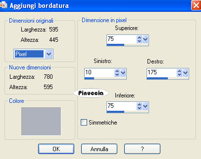 qui puoi trovare qualche risposta ai tuoi dubbi. Se l'argomento che ti interessa non è presente, ti prego di segnalarmelo. Occorrente: Materiale qui Il template è di Ann, il tube dell'uomo è di SilNic, l'immagine del giglio viene da Internet. Filtro: Simple qui Imposta il colore di primo piano con #424D66, e il colore di sfondo con #ADB2BC. 1. Apri il template di Ann. File>Esporta>Pennello personalizzato, assegna un nome al pennello e clicca ok. ![]() 2. Apri l'immagine con il fiore. 3. Immagine>Aggiungi bordatura, 1 pixel, simmetriche, con il colore di sfondo. come aggiungere velocemente bordi con i colori impostati nella paletta dei materiali, vedi qui Immagine>Aggiungi bordatura, 1 pixel, simmetriche, con il colore di primo piano. Ripeti ancora una volta. Per finire: Immagine>Aggiungi bordatura, 1 pixel, simmetriche, con il colore di sfondo. Regola>Messa a fuoco>Metti a fuoco. 4. Immagine>Aggiungi bordatura, simmetriche non selezionato, con il colore di primo piano e con i seguenti settaggi: ![]() 5. Seleziona questo bordo con la bacchetta magica ![]() 6. Effetti>Effetti di trama>Veneziana: ![]() 7. Effetti>Effetti di bordo>Aumenta di più. 8. Effetti>Plugins>Simple - Pizza slice mirror. 9. Selezione>Nessuna selezione. 10. Livelli>Nuovo livello raster. Attiva lo strumento Pennello ![]() Cerca e seleziona il pennello che hai esportato e applicalo a destra dell'immagine cliccando una volta con il tasto destro del mouse, per usare il colore di sfondo. Regola>Messa a fuoco>Metti a fuoco. 11. Sposta il testo contro il bordo a destra.12. Attiva lo strumento Gomma ,e cancella la parte esterna al testo, in modo che rimanga soltanto il testo. 13. Livelli>Unisci>Unisci tutto. 14. Apri il tube con l'uomo e vai a Modifica>Copia. Torna al tuo lavoro e vai a Modifica>Incolla>Incolla come nuovo livello. Posizionalo nell'angolo in alto a sinistra,e abbassa l'opacità di questo livello al 50%. Se vuoi, questo è il momento di firmare il tuo lavoro. 15. Livelli>Unisci>Unisci tutto. 16. Immagine>Aggiungi bordatura, 1 pixel, simmetriche, con il colore di sfondo. Immagine>Aggiungi bordatura, 1 pixel, simmetriche, con il colore di primo piano. Ripeti ancora una volta. Finisci con Immagine>Aggiungi bordatura, 1 pixel, simmetriche, con il colore di sfondo. L'immagine è finita. Se vuoi realizzare lo script ti occorrono anche due immagini di sfondo. Per eseguire lo script Apri lo script di Jeannette che trovi qui, e segui i preliminari descritti alla fine di questo tutorial, fino all'inserimento dello sfondo-suono. Dopo aver inserito lo sfondo-suono, dovrai indicare allo script dove trovare le immagini. Clicca su Origine e identifica i punti di inserimento dei vari elementi dello script. Se hai messo tutti i file in una cartella, il percorso del suono ti servirà da guida per l'inserimento degli altri files: ti basterà cambiare l'ultima parte: il nome e l'estensione. Nella schermata sotto sono indicati i punti in cui dovrai inserire, tra le virgolette, il percorso delle due immagini di sfondo, 1. Qui inserisci il primo sfondo. 2. Qui inserisci il secondo sfondo che servirà per le tabelle laterali. ![]() Nella schermata sotto è indicato il punto in cui dovrai inserire il percorso dell'immagine principale. ![]() Ricorda che, contemporaneamente, puoi controllare il risultato andando su Anteprima. fai molta attenzione alle estensioni dei files e alle maiuscole-minuscole, che devono essere corrette, altrimenti lo script non troverà le immagini da inserire Clicca adesso sulla linguetta Modifica, per aggiungere il testo. clicca due volte all'interno del riquadro. Apparirà la cornice che ti dà il via libera per sostituire il testo esistente e aggiungere il tuo. Quando hai finito, clicca all'esterno e la cornice sparirà. Il tuo messaggio con lo script è pronto per il tasto Invia. Se non vuoi spedirlo e vuoi soltanto tenerlo per te, vai a File>Salva con nome e mettilo in una cartella a tua scelta. Ricordati, però, che quando vorrai rivedere lo script, i files devono trovarsi nello stesso posto. Se nel frattempo li avrai spostati, vedrai soltanto delle crocette rosse. Avvertimento: non devi preoccuparti se in Modifica non vedrai il messaggio come dovrebbe essere (per fare questo devi andare in Anteprima). Ricorda ancora che per inviare il messaggio ti devi posizionare su Modifica. ![]() Se hai problemi o dubbi, o trovi un link non funzionante, o anche soltanto per dirmi che ti è piaciuto, scrivimi. 21 Gennaio 2008 |