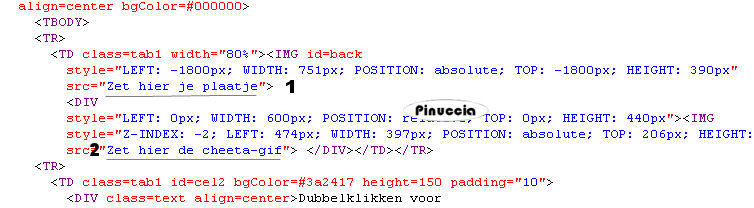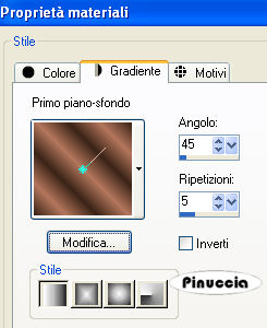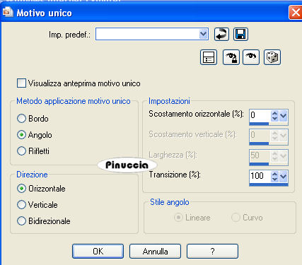 qui puoi trovare qualche risposta ai tuoi dubbi. Se l'argomento che ti interessa non è presente, ti prego di segnalarmelo. Occorrente: Materiale qui I tubes della donna è di Crystal, la cheeta di Mariel e il pennello di Yoka. Non aprire la gif "Cheeta" di Jax, ti servirà se vorrai realizzare lo script. Metti il pennello Yoka-takken nella cartella pennelli di PSP. Imposta il colore di primo piano con #3A2417, e il colore di sfondo con #B4765C. Passa il colore di primo piano a Gradiente di primo piano/sfondo con i seguenti settaggi. ![]() 1. Apri una nuova immagine trasparente 700 x 450 pixels, e riempila con il gradiente.2. Effetti>Effetti di bordo>Aumenta di più, 2 volte. 3. Imposta nuovamente il colore di primo piano con il colore. 4. Livelli>Nuovo livello raster. Attiva lo strumento Pennello ![]() e clicca - con il tasto sinistro del mouse, per usare il colore di primo piano - in alto a destra e in basso destra. se il tuo PSP non rende disponibile il pennello, apri il file in PSP. File>Esporta>Pennello personalizzato - assegna un nome al pennello, e clicca ok. ![]() 5. Immagine>Rifletti. Livelli>Duplica. Livelli>Unisci giù. 6. Effetti>Effetti di immagine>Motivo unico: ![]() 7. Apri il tube con la donna ".rystaltubed Liv T9", e vai a Modifica>Copia. Torna al tuo lavoro e vai a Modifica>Incolla come nuovo livello. Sposta il tube a sinistra,a circa mezzo centimetro dal bordo. 8. Apri il tube "MarieL animal wild01 small", e vai a Modifica>copia. non chiuderlo perchè ti servirà ancora. Torna al tuo lavoro e vai a Modifica>Incolla come nuovo livello. Livelli>Duplica. Immagine>Rifletti. Posiziona i due tigrotti uno accanto all'altro,vedi l'esempio finale. 9. Attiva nuovamente il tube del tigrotto. Attiva lo strumento Selezione a mano libera ,e traccia una selezione pressappoco come nell'esempio. ![]() Modifica>Copia. Torna al tuo lavoro e vai a Modifica>Incolla come nuovo livello. 10. Livelli>Carica/salva maschera>Carica maschera da disco. Cerca e carica la maschera 20-20: ![]() se non hai la maschera clicca qui Livelli>Unisci>Unisci gruppo. 11. Sposta il tigrotto in alto a destra,e abbassa l'opacità di questo livello al 20%. Livelli>Unisci>Unisci visibile. 12. Chiudi il colore di primo piano e imposta il colore di sfondo con un motivo oro. se non hai un motivo oro, clicca qui Attiva lo strumento Testo , crea come vettore, e scrivi un testo.Livelli>Converti in livello raster. 13. Effetti>Effetti 3D>Sfalsa ombra. ![]() Regola>Messa a fuoco>Metti a fuoco. Livelli>Unisci>Unisci tutto. L'immagine è finita. Se non vuoi realizzare lo script, aggiungi un piccolo bordo dorato all'immagine. Per realizzare lo script, ti occorrono due immagini di sfondo e la gif della pantera "Jax tube cheeta.gif". Per eseguire lo script Apri lo script di Jeannette che trovi qui, e segui i preliminari descritti alla fine di questo tutorial, fino all'inserimento dello sfondo-suono. Dopo aver inserito lo sfondo-suono, dovrai indicare allo script dove trovare le immagini. Clicca su Origine e identifica i punti di inserimento dei vari elementi dello script. Se hai messo tutti i file in una cartella, il percorso del suono ti servirà da guida per l'inserimento degli altri files: ti basterà cambiare l'ultima parte: il nome e l'estensione. Nella schermata sotto è indicato il punto in cui dovrai inserire il percorso delle due immagini di sfondo. 1. Qui inserisci il percorso della prima immagine di sfondo. 2. Qui inserisci il percorso dello sfondo, che servirà per le tabelle laterali. ![]() Nella schermata sotto sono indicati i due punti in cui dovrai inserire il percorso dell'immagine principale e della gif. 1. Qui inserisci il percorso dell'immagine principale. 2. Qui inserisci il percorso della gif. ![]() Ricorda che, contemporaneamente, puoi controllare il risultato andando su Anteprima. fai molta attenzione alle estensioni dei files e alle maiuscole-minuscole, che devono essere corrette, altrimenti lo script non troverà le immagini da inserire Clicca adesso sulla linguetta Modifica, per aggiungere il testo. clicca due volte all'interno del riquadro. Apparirà la cornice che ti dà il via libera per sostituire il testo esistente e aggiungere il tuo. Quando hai finito, clicca all'esterno e la cornice sparirà. Il tuo messaggio con lo script è pronto per il tasto Invia. Se non vuoi spedirlo e vuoi soltanto tenerlo per te, vai a File>Salva con nome e mettilo in una cartella a tua scelta. Ricordati, però, che quando vorrai rivedere lo script, i files devono trovarsi nello stesso posto. Se nel frattempo li avrai spostati, vedrai soltanto delle crocette rosse. Avvertimento: non devi preoccuparti se in Modifica non vedrai il messaggio come dovrebbe essere (per fare questo devi andare in Anteprima). Ricorda ancora che per inviare il messaggio ti devi posizionare su Modifica. ![]() Se hai problemi o dubbi, o trovi un link non funzionante, o anche soltanto per dirmi che ti è piaciuto, scrivimi. 1 Maggio 2008 |