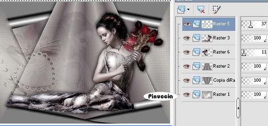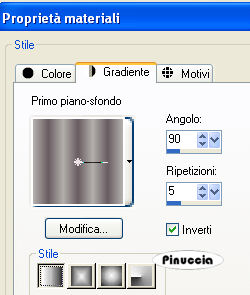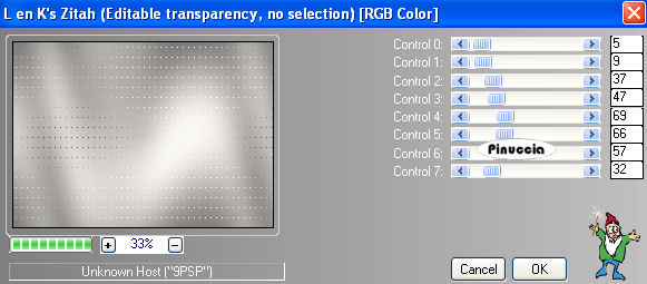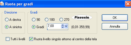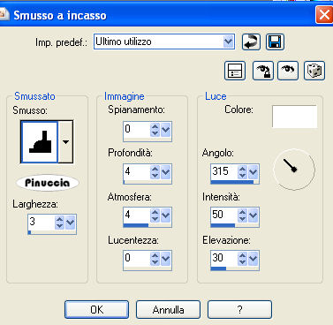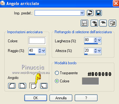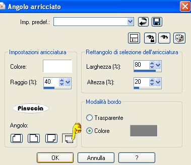 qui puoi trovare qualche risposta ai tuoi dubbi. Se l'argomento che ti interessa non è presente, ti prego di segnalarmelo. Questo tutorial è stato scritto in PSP 9, ma può essere eseguito con qualsiasi versione del programma. Occorrente: Materiale qui I tubes usati per questo tutorial sono di Jet e Marif. Filtri: Greg's Factory Output II qui L & K Zitah qui Imposta il colore di primo piano con #695C61, e il colore di sfondo con #B2AFAC. Passa il colore di primo piano a Gradiente, con i seguenti settaggi. ![]() 1. Apri una nuova immagine trasparente 700 x 500 pixels, e riempila con il colore di sfondo.2. Effetti>Plugins>Greg's Factory - Poolshadow: ![]() 3. Effetti>Plugins>L & K - Zitah: ![]() 4. Livelli>Nuovo livello raster. Riempi con il gradiente.5. Premi sulla tastiera il tasto D per attivare il Puntatore ![]() e, tenendo premuto Ctrl spingi verso l'interno uno dei due angoli superiori, tenere premuto il tasto Ctrl fa sì che gli angoli esterni si spostino simmetricamente vedi l'esempio: ![]() 6. Per liberarti della griglia clicca sullo strumento Spostamento o sulla manina ![]() 7. Effetti>Effetti di bordo>Aumenta 8. Effetti>Effetti 3D>Sfalsa ombra: ![]() Ripeti l'Effetto Sfalsa ombra, ma cambiando verticale e orizzontale con -5. 9. Effetti>Effetti di immagine>Angolo arricciato, sugli angoli inferiori: prima quello a destra: ![]() 10. Poi ripeti gli stessi settaggi per quello a sinistra: ![]() 11. Livelli>Duplica. Immagine>Capovolgi. ![]() 12. Nella paletta dei livelli sposta il livello superiore di una posizione in basso. ![]() 13. Apri il tube della donna. Elimina il livello del watermark. Duplica il tube usando sulla tastiera la combinazione di tasti shift(maiuscola)+D e metti da parte l'originale. Sulla copia: Immagine>Ridimensiona, a 650 pixels di larghezza. Modifica>Copia. Torna al tuo lavoro e vai a Modifica>Incolla come nuovo livello. Il tube è già correttamente posizionato. Non occorre spostarlo. 15. Effetti>Effetti 3D>Sfalsa ombra: ![]() Ripeti l'Effetto Sfalsa ombra cambiando verticale e orizzontale con -5. 16. Attiva il tube originale della donna. Immagine>Rifletti. 17. Attiva lo strumento Selezione , rettangolo,e traccia una selezione del busto della donna. ![]() 18. Modifica>Copia. Torna al tuo lavoro e vai a Modifica>Incolla come nuovo livello. Posiziona l'immagine al centro.19. Nella paletta dei livelli sposta questo livello di una posizione e abbassa l'opacità all'11. ![]() 20. Apri il tube di Marif, e vai a Modifica>Copia. Torna al tuo lavoro e vai a Modifica>Incolla come nuovo livello. Sposta il tube in basso a sinistra, pressappoco come nel mio esempio.La posizione diventa importante soltanto se vuoi realizzare lo script, nello script questo tube dovrà trovarsi al centro dell'anello (vedi l'esempio in fondo al tutorial). Abbassa l'opacità di questo livello al 37. ![]() 21. Controlla che tutto sia al posto giusto e vai a Livelli>Unisci>Unisci visibile. 22. Selezione>Seleziona tutto. 23. Selezione>Modifica>Contrai - 50 pixels. 24. Selezione>Inverti. 25. Livelli>Nuovo livello raster. Riempi con il colore di sfondo.26. Effetti>Plugins>Greg's Factory Output - Pool Shadow, con i settaggi standard. ![]() 27. Effetti>Effetti 3D>Smusso a incasso: ![]() 28. Abbassa l'opacità di questo livello al 47%. 29. Livelli>Unisci>Unisci visibile. 30. Apri il tube "steentje" e vai a Modifica>copia. Torna al tuo lavoro e vai a Modifica>Incolla come nuovo livello. Spostalo nell'angolo in alto a sinistra.Livelli>Duplica, 3 volte e posiziona i duplicati negli altri angoli.Livelli>Unisci>Unisci tutto. L'immagine è finita. Adesso dovrai fare l'animazione, se vorrai realizzare lo script. 32. Apri il tube ring. 33. Livelli>Duplica, e ripeti. Avrai così tre livelli. 34. Attiva il livello superiore. 35. Immagine>Ruota per gradi - 7 gradi a sinistra: ![]() 36. Regola>Messa a fuoco>Metti a fuoco, 2 volte. 37. Attiva il livello centrale. 38. Immagine>Ruota per gradi - 14 gradi a sinistra. 39. Regola>Messa a fuoco>Metti a fuoco - 2 volte. 40. Salva in formato psp per Animation Shop. ![]() va bene anche in formato pspimage. 41. Apri Animation Shop e apri l'immagine che hai appena salvato. 42. Modifica>Seleziona tutto. 43. Animazione>Proprietà fotogramma e imposta la velocità a 7. ![]() 44. Salva in formato gif. Anche l'animazione è pronta. Se vorrai realizzare lo script, oltre a questi due files, ti serviranno anche due immagini di sfondo. ![]() Per eseguire lo script Apri lo script di Jeannette che trovi qui, e segui i preliminari descritti alla fine di questo tutorial, fino all'inserimento dello sfondo-suono. Dopo aver inserito lo sfondo-suono, dovrai indicare allo script dove trovare le immagini. Clicca su Origine e identifica i punti di inserimento dei vari elementi dello script. Se hai messo tutti i file in una cartella, il percorso del suono ti servirà da guida per l'inserimento degli altri files: ti basterà cambiare l'ultima parte: il nome e l'estensione. Nella schermata sotto è indicato il punto in cui dovrai inserire il percorso delle due immagini di sfondo. 1. Qui inserisci il percorso dell'immagine di sfondo. 2. Qui inserisci il percorso dello sfondo argento, che servirà per le tabelle laterali. ![]() Nella schermata sotto sono indicati i due punti in cui dovrai inserire il percorso: 1. dell'immagine principale, 2. il percorso della gif dell'anello. ![]() Ricorda che, contemporaneamente, puoi controllare il risultato andando su Anteprima. fai molta attenzione alle estensioni dei files e alle maiuscole-minuscole, che devono essere corrette, altrimenti lo script non troverà le immagini da inserire Clicca adesso sulla linguetta Modifica, per aggiungere il testo. clicca due volte all'interno del riquadro. Apparirà la cornice che ti dà il via libera per sostituire il testo esistente e aggiungere il tuo. Quando hai finito, clicca all'esterno e la cornice sparirà. Il tuo messaggio con lo script è pronto per il tasto Invia. Se non vuoi spedirlo e vuoi soltanto tenerlo per te,