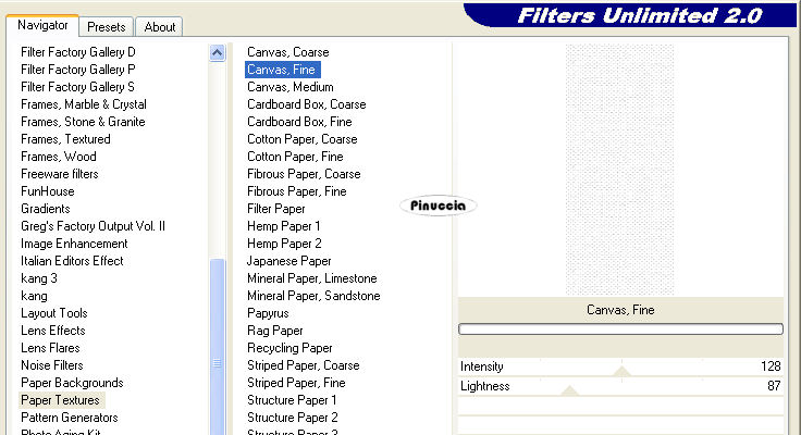 Effetti>Plugins>Filters Unlimited 2.0 - Paper textures - Canvas Fine, imposta il valore Intensity a 128: