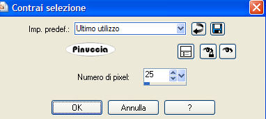 qui puoi trovare qualche risposta ai tuoi dubbi. Se l'argomento che ti interessa non è presente, ti prego di segnalarmelo. Materiale qui Il tube usato per questo tutorial è di Crystal. Non aprire l'animazione "Gespiegeld zilver" in PSP. Ti servirà se vorrai realizzare lo script. Filtro Greg's Factory Output II qui Imposta il colore di primo piano con #151214, e il colore di sfondo con #BCADDE. Passa il colore di primo piano a Gradiente di primo piano/sfondo, lineare, con i seguenti settaggi: ![]() 1. Apri il tube della donna ed elimina il livello del watermark. Lavorerai su questa immagine. 2. Immagine>Ridimensiona, a 450 pixels di altezza, mantieni proporzioni selezionato. ![]() 3. Livelli>Nuovo livello raster. Riempi con il gradiente.4. Nella paletta dei livelli sposta il livello inferiore in su, in modo che l'immagine sia visibile. 5. Nella paletta dei livelli clicca sul livello inferiore in modo che diventi blu. ![]() 6. Attiva lo strumento Selezione , rettangolo,e sul bordo inferiore traccia una selezione, come mostrato nella schermata sotto. ![]() 7. Effetti>Plugins>Greg's Factory Output II - Poolshadow, con i seguenti settaggi: ![]() 8. Effetti>Effetti di bordo>Aumenta di più. Effetti>Effetti di bordo>Aumenta. Selezione>Nessuna selezione. 9. E' sempre attivo il livello inferiore. 10. Selezione>Seleziona tutto. Selezione>modifica>Contrai, di 25 pixels. ![]() 11. Selezione>Inverti. Livelli>Nuovo livello raster. Riempi con il gradiente.12. Immagine>Capovolgi. Effetti>Effetti di bordo>Aumenta di più, 2 volte. 13. Selezione>Nessuna selezione. Livelli>Unisci>unisci tutto. 14. Immagine>Aggiungi bordatura, 1 pixel, simmetriche, conil colore bianco. 15. Immagine>Aggiungi bordatura, simmetriche non selezionato, con il colore di primo piano, con i seguenti settaggi: ![]() 16. Seleziona il bordo con la bacchetta magica ,e riempilo con il gradiente.17. Effetti>Effetti di bordo>Aumenta di più. Regola>Messa a fuoco>Metti a fuoco. 18. Effetti>Plugins>Greg's Factory Output - Pool Shadow, come al punto 7. 19. Selezione>nessuna selezione. 20. Immagine>Aggiungi bordatura, 1 pixel, simmetriche, con il colore di primo piano. per aggiungere i bordi con i colori impostati nella paletta dei materiali, vedi qui Immagine>Aggiungi bordatura, 5 pixels, simmetriche, con il colore di sfondo. Immagine>Aggiungi bordatura, 1 pixel, simmetriche, con il colore di primo piano. 21. Seleziona con la bacchetta magica il bordo da 5 pixels.Effetti>Plugins>Greg's Factory - Pool Shadow, con i settaggi precedenti. Selezione>Nessuna selezione. 22. Apri il tube con il cuore e vai a Modifica>Copia. Torna al tuo lavoro e vai a Modifica>Incolla>Incolla come nuovo livello. Spostalo a destra.23. Effetti>Effetti 3D>Sfalsa ombra, con i seguenti settaggi: ![]() Regola>Messa a fuoco>Metti a fuoco. Livelli>Unisci>Unisci tutto. 24. Attiva lo strumento Testo , seleziona un font e scrivi un testo.Effetti>Effetti 3D>Sfalsa ombra, con i settaggi precedenti. Livelli>Unisci>Unisci tutto. ![]() L'immagine è finita. Se vuoi realizzare lo script, ti occorrono anche 2 immagini di sfondo e l'animazione che hai trovato nello zip. Attenzione. L'animazione va inserita nello script 3 volte. Indicazioni per gli sfondi Per il primo sfondo apri una nuova immagine 150x150 pixels, e riempila con il colore scuro di sfondo. Effetti>Effetti di trama>Incannicciato. Salva in formato jpg come sfondo1. Per il secondo sfondo, che ti servirà per le tabelle laterali, apri una nuova immagine 150x150 pixels e riempila con un motivo argento. Salva in formato jpg come sfondo2. Per eseguire lo script Apri lo script di Jeannette che trovi qui, e segui i preliminari descritti alla fine di questo tutorial, fino all'inserimento dello sfondo-suono. Dopo aver inserito lo sfondo-suono, dovrai indicare allo script dove trovare le immagini. Clicca su Origine e identifica i punti di inserimento dei vari elementi dello script. Se hai messo tutti i file in una cartella, il percorso del suono ti servirà da guida per l'inserimento degli altri files: ti basterà cambiare l'ultima parte: il nome e l'estensione. Nella schermata sotto sono indicati i punti in cui dovrai inserire, tra le virgolette, il percorso delle due immagini di sfondo: 1. Qui inserisci lo sfondo1 (l'immagine a tinta unita). 2. Qui inserisci lo sfondo2, con il motivo argento. ![]() Nella schermata sotto è indicato: al punto 1, dove dovrai inserire, tra le virgolette, il percorso dell'immagine principale, e nei tre punti 2, dove dovrai inserire il percorso della gif che hai trovato con il materiale. ![]() Ricorda che, contemporaneamente, puoi controllare il risultato andando su Anteprima. fai molta attenzione alle estensioni dei files e alle maiuscole-minuscole, che devono essere corrette, altrimenti lo script non troverà le immagini da inserire Clicca adesso sulla linguetta Modifica, per aggiungere il testo. clicca due volte all'interno del riquadro. Apparirà la cornice che ti dà il via libera per sostituire il testo esistente e aggiungere il tuo. Quando hai finito, clicca all'esterno e la cornice sparirà. Il tuo messaggio con lo script è pronto per il tasto Invia. Se non vuoi spedirlo e vuoi soltanto tenerlo per te, vai a File>Salva con nome e mettilo in una cartella a tua scelta. Ricordati, però, che quando vorrai rivedere lo script, i files devono trovarsi nello stesso posto. Se nel frattempo li avrai spostati, vedrai soltanto delle crocette rosse. Avvertimento: non devi preoccuparti se in Modifica non vedrai il messaggio come dovrebbe essere (per fare questo devi andare in Anteprima). Ricorda ancora che per inviare il messaggio ti devi posizionare su Modifica. ![]() Se hai problemi o dubbi, o trovi un link non funzionante, o anche soltanto per un saluto, scrivimi. 12 Maggio 2007 |