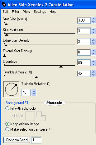 Effetti>Plugins>Alien Skin Xenofex 2 - Constellation, con gli stessi settaggi, ma clicca una volta su Random Seed.