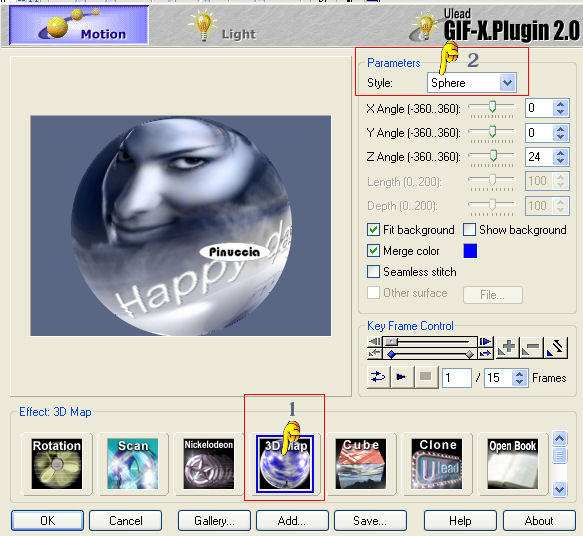 nel menu degli effetti seleziona "3D Map" (1) e nei parametri Style seleziona "Sphere" (2).