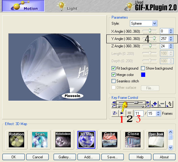 Quando fermerai l'animazione cliccando sul quadretto (2), apparirà il numero del fotogramma (sul totale di 15) sul quale l'animazione si è fermata (3) e l'angolo Y di questo fotogramma (4).