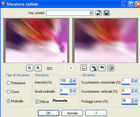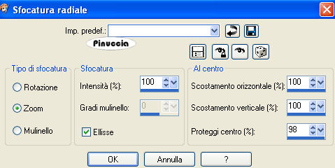 Ripeti Regola>Sfocatura>Sfocatura radiale, con i seguenti settaggi:
