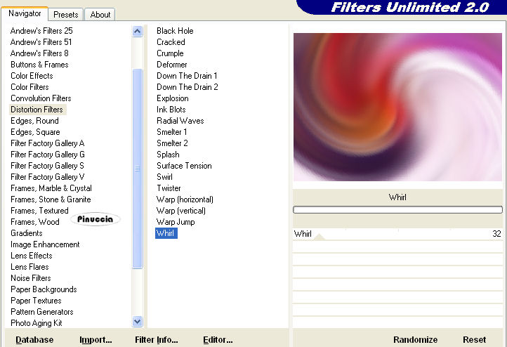 Effetti>Plugins>Filters Unlimited 2.0 - Distorsion Filters - Whirl, con i settaggi standard: