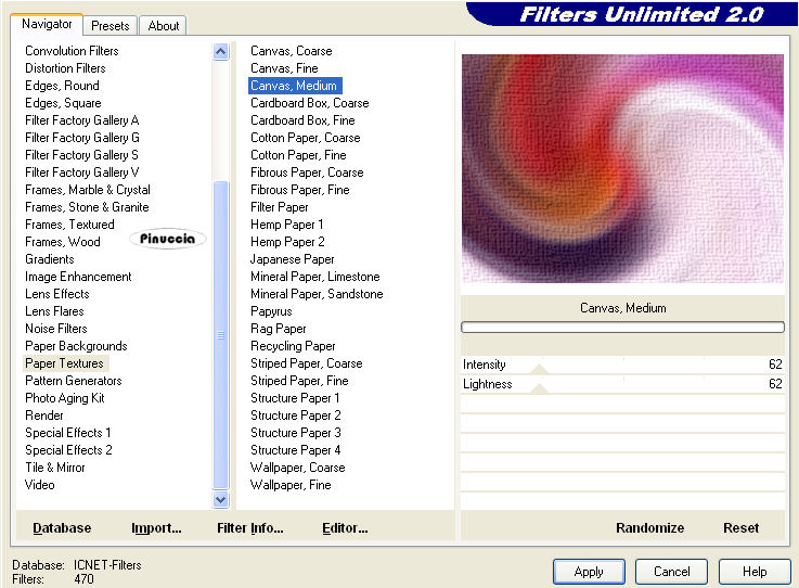 Effetti>Plugins>Filters Unlimited 2.0 - Paper Textures - Canvas Medium, con i seguenti settaggi: