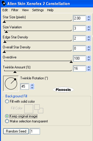 Effetti>Plugins>Alien Skin Xenofex 2 - Constellation, con i settaggi precedenti, ma clicca una volta su Random Seed.