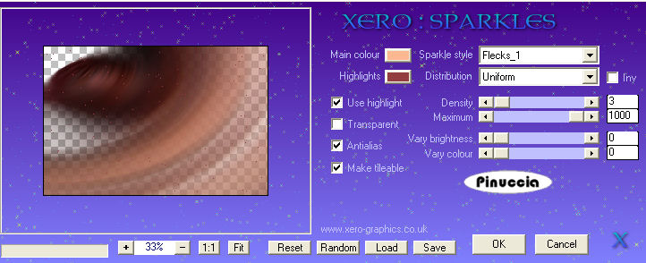 Effetti>Plugins>Xero - Sparkles, con i seguenti settaggi, con i tuoi colori di primo piano e sfondo.