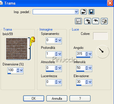 Effetti>Effetti di trama>Trama - apri il menu delle trame e seleziona Brick59, con questi settaggi: