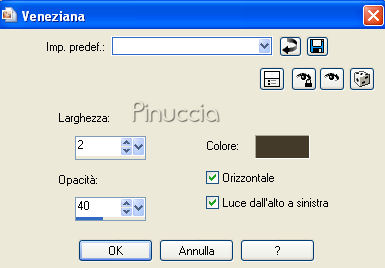 Effetti>Effetti di trama>Veneziana, con i seguenti settaggi, con il colore di primo piano (#453a2b