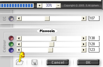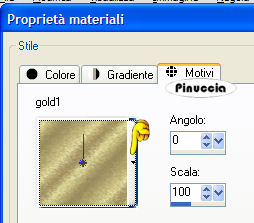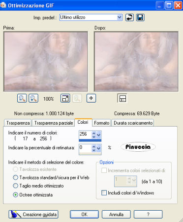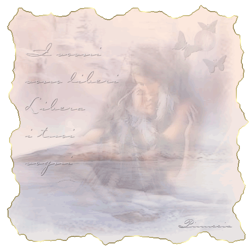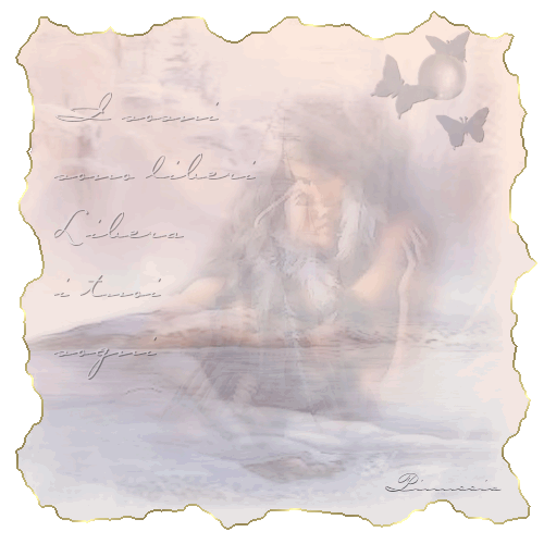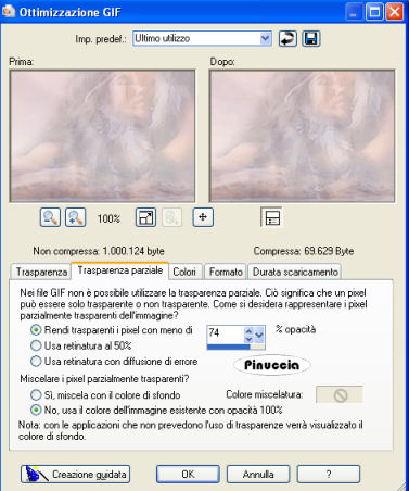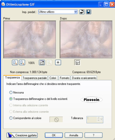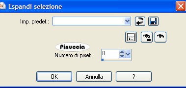 qui puoi trovare qualche risposta ai tuoi dubbi. Se l'argomento che ti interessa non è presente, ti prego di segnalarmelo. Questo tutorial è stato scritto con PSP 9, ma può essere eseguito anche con le altre versioni di PSP. Occorrente: Materiale qui Filtri: Xero qui Filters Unlimited qui Fotomatic qui Metti il preset roseblauwger.sky nella cartella del Filtro Skygrad. Apri il motivo oro Gold1 e minimizzalo nella tua area di lavoro. Lo troverai nella lista dei motivi disponibili, quando ti servirà. Apri il font Carpenter e minimizzalo nella tua area di lavoro. Lo troverai nella lista dei font disponibili, quando ti servirà. Il tube del template è di Gerda. Il pennello con il castello è di Ben. 1. Apri Gertemplate5. Questa sarà la base del tuo lavoro. Effetti>Plugins>Fotomatic - Skygrad, clicca sull'icona indicata dalla freccia e cerca il preset roseblauwger.sky: ![]() 2. Livelli>Nuovo livello raster. Riempi il nuovo livello con il colore bianco.Effetti>Plugins>Fotomatic - Skygrad, imposta nuovamente il preset roseblauwger.sky. Nella paletta dei livelli trascina questo livello sotto il livello del template. Livelli>Nuovo livello raster. Apri il file Indiankopperlger1 e vai a Modifica>Copia. Torna al tuo lavoro e vai a Modifica>Incolla>Incolla come nuovo livello. Abbassa l'opacità di questo livello al 90%. Apri il file droomkasteel1 e vai a Modifica>Copia. Torna al tuo lavoro e vai a Modifica>Incolla>Incolla come nuovo livello. Effetti>Plugins>Fotomatic - Skygrad. Ancora una volta seleziona il preset roseblauwger.sky. Abbassa l'opacità di questo livello al 40%. Livelli>Unisci>Unisci visibile. 3. Effetti>Plugins>Xero - Porcelain, con i settaggi standard. ![]() Effetti>Plugins>Filters Unlimited - Edges Square - Square edges 13. Avrai questo: ![]() Attiva lo strumento Bacchetta magica .![]() clicca sulla parte trasparente per selezionarla. Se vedi che qualche parte rimane non selezionata, clicca nuovamente. ![]() Assicurati che tutto sia selezionato. Selezione>Modifica>Espandi, di 8 pixels. ![]() E la selezione sarà più uniforme. ![]() Imposta il colore di primo piano su Motivi. Apri il menu cliccando sulla freccia a fianco del box e seleziona il motivo oro gold1. ![]() Riempi la selezione con il motivo oro.![]() Selezione>Modifica>Contrai, di 2 pixels. Premi sulla tastiera il tasto CANC ![]() Selezione>Nessuna selezione. 4. Livelli>Nuovo livello raster. Scegli un colore dall'immagine per impostarlo come colore di primo piano. Io ho scelto #dfdee3. Attiva lo strumento Aerografo ![]() cerca e seleziona Vlinder 01 - dimensione 109, e clicca nell'angolo in alto a destra. puoi anche usare lo strumento Pennello ![]() Nell'esempio in basso la versione come pennello Effetti>effetti 3D>Sfalsa ombra: ![]() Abbassa l'opacità di questo livello al 32%. Livelli>Nuovo livello raster. Attiva lo strumento Testo , font Carpenter,e scrivi il testo che preferisci. Livelli>Unisci>Unisci visibile. Salva in formato gif: File>Esporta>Ottimizzazione gif: ![]() ![]() ![]() ![]() versione con il pennello ![]() ![]() Se hai problemi o dubbi, o trovi un link non funzionante, o anche soltanto per un saluto, scrivimi 19 Giugno 2007 |