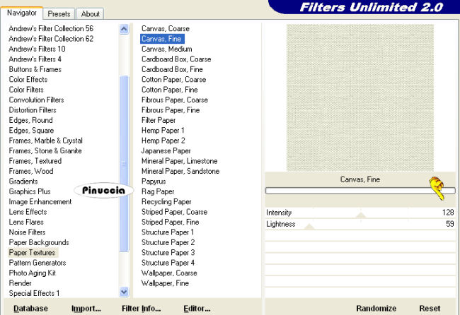 Effetti>Plugins>Filters Unlimited - Paper Texture - Canvas Fine, con i seguenti settaggi: