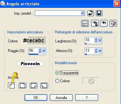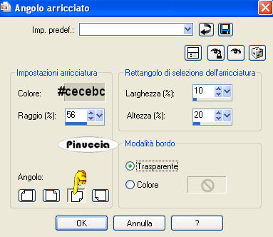 3. Effetti>Effetti di immagine>Angolo arricciato, con i seguenti settaggi.