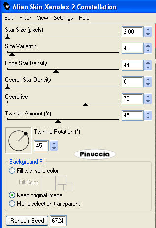 Effetti>Plugins>Alien Skin Xenofex 2 - Constellation, con i settaggi precedenti, ma clicca una volta su Random seed.