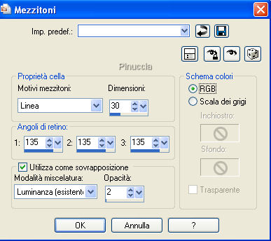 Effetti>Effetti artistici>Mezzitoni, con i settaggi precedenti.![]() Selezione>Nessuna selezione. Modifica>Copia. 9. Torna alla tua immagine più grande (600 x 450) e vai a Modifica>Incolla>Incolla come nuovo livello. Immagine>Ruota>Ruota per gradi, 45 gradi a destra. ![]() Effetti>Effetti di immagine>Scostamento, con i seguenti settaggi: ![]() Livelli>Duplica. Immagine>Rifletti. Livelli>Unisci>Unisci giù. 10. Livelli>Nuovo livello raster. Selezione>Seleziona tutto. Attiva nuovamente il tube chrismist_Ratzeburg Germany1, e vai a Modifica>Copia. Torna al tuo lavoro e vai a Modifica>Incolla>Incolla nella selezione. Selezione>Nessuna selezione. Livelli>Disponi>Sposta giù. Cambia la modalità di miscelatura di questo livello in Luminanza (Esistente), Effetti>Plugins>FM Tile Tools - Blend Emboss, con i settaggi standard, 2 volte. Attiva il livello superiore. 11. Attiva l'immagine che hai minimizzato prima al punto 6 e vai a Modifica>Copia. Torna al tuo lavoro e vai a Modifica>Incolla>Incolla come nuovo livello. Livelli>Duplica. Immagine>Ridimensiona, al 90%, tutti i livelli non selezionato. Effetti>Effetti di immagine>Scostamento, con i seguenti settaggi: ![]() Livelli>Duplica. Immagine>Rifletti. Livelli>Unisci>Unisci giù. Regola>Messa a fuoco>Metti a fuoco. Livelli>Disponi>Sposta giù. 12. Attiva il livello superiore. Effetti>Effetti 3D>Sfalsa ombra, con i seguenti settaggi, colore nero: ![]() 13. Apri il tube autumn_la01, e vai a Modifica>Copia. Torna al tuo lavoro e vai a Modifica>Incolla>Incolla come nuovo livello. Spostalo nell'angolo in basso a destra.Apri il tube autumn_la02, e vai a Modifica>Copia. Torna al tuo lavoro e vai a Modifica>Incolla>Incolla come nuovo livello. Spostalo nell'angolo in basso a sinistra.14. Apri il tube autumn, e vai a Modifica>Copia. Torna al tuo lavoro e vai a Modifica>Incolla>Incolla come nuovo livello. Effetti>Plugins>Mura's Meister - Copies, con i seguenti settaggi: ![]() nelle impostazioni la parola "random" significa casuale, per questo il risultato dell'applicazione del filtro potrebbe non essere simile al mio esempio. Nella paletta dei livelli tenendo premuto il tasto sinistro del mouse su questo livello trascinalo al secondo posto dal basso. ![]() Cambia la modalità di miscelatura di questo livello in Luminanza (esistente), e abbassa l'opacità al 60%. Effetti>Plugins>FM Tile Tools - Blend Emboss, con i settaggi standard, 2 volte. 15. Immagine>Aggiungi bordatura, 3 pixels, simmetriche, con il colore #743917. Seleziona questo bordo con la bacchetta magica ![]() ![]() Effetti>Effetti artistici>Mezzitoni, con i seguenti settaggi: ![]() Selezione>Nessuna selezione. Immagine>Aggiungi bordatura, 40 pixels, simmetriche, con il colore bianco. Seleziona il bordo con la bacchetta magica ![]() Apri l'immagine di sfondo clarey_beautifulautumn_paper2, e minimizzala nella tua area di lavoro. Passa il colore di primo piano e cerca l'immagine nella lista dei motivi: ![]() Riempi la selezione con questo motivo.Effetti>Plugins>FM Tile Tools, con i settaggi standard. Effetti>Effetti di trama>Veneziana, con i seguenti settaggi: ![]() Selezione>Inverti. Effetti>Effetti 3D>Sfalsa ombra, con i seguenti settaggi, colore nero: ![]() Ripeti l'Effetto Sfalsa ombra, ma cambiando verticale e orizzontale con -2. Immagine>Aggiungi bordatura, 3 pixels, simmetriche, con il colore #743917. Seleziona questo bordo con la bacchetta magica ![]() ![]() Effetti>Effetti artistici>Mezzitoni, con i seguenti settaggi: ![]() Selezione>Nessuna selezione. 16. Passa il colore di sfondo a Motivi e seleziona l'immagine di sfondo clarey_beautifulautumn_paper4: ![]() Immagine>Aggiungi bordatura, 6 pixels, simmetriche, con il colore bianco. Seleziona questo bordo con la bacchetta magica ![]() e riempilo con questo motivo.ricorda che è impostato come colore di sfondo, quindi per riempire devi cliccare con il tasto destro del mouse. Effetti>Plugins>FM Tile Tools, con i settaggi standard. Immagine>Aggiungi bordatura, 3 pixels, simmetriche, con il colore #743917. Seleziona questo bordo con la bacchetta magica ![]() ![]() Effetti>Effetti artistici>Mezzitoni, con i seguenti settaggi: ![]() Selezione>Nessuna selezione. 17. Apri il tube herbstgesteck, e vai a Modifica>Copia. Torna al tuo lavoro e vai a Modifica>Incolla>Incolla come nuovo livello. Spostalo in alto a destra, sullo sfondo chiaro.Apri il tube bow, e vai a Modifica>Copia. Torna al tuo lavoro e vai a Modifica>Incolla>Incolla come nuovo livello. Spostalo sopra il tube precedente.Livelli>Unisci>Unisci tutto. Immagine>Aggiungi bordatura, 10 pixels, simmetriche, con il colore bianco. Seleziona il bordo con la bacchetta magica ![]() e riempilo con il motivo di primo piano.Effetti>Plugins>FM Tile Tools - Blend Emboss, con i settaggi standard. Effetti>Effetti di trama>Veneziana, con i settaggi usati al punto 15. 18. Apri il tube Men-HJ_la, e vai a Modifica>Copia. Torna al tuo lavoro e vai a Modifica>Incolla>Incolla come nuovo livello. Immagine>Ridimensiona, al 60%, tutti i livelli non selezionato. Regola>Messa a fuoco>MEtti a fuoco. Sposta il tube a sinistra.Effetti>Effetti 3D>Sfalsa ombra, con i seguenti settaggi, colore nero: ![]() 19. Immagine>Aggiungi bordatura, 15 pixels, simmetriche, con il colore bianco. Seleziona il bordo con la bacchetta magica ![]() Imposta il colore di primo piano con il motivo 22 septembre 20061, e riempi la selezione con questo motivo.Effetti>Plugins>FM Tile Tools - Blend Emboss, con i settaggi standard. Effetti>Effetti 3D>Smusso a incasso, con i seguenti settaggi: ![]() Se vuoi: Apri il file di testo Wordart01 e vai a Modifica>Copia. Torna al tuo lavoro e vai a Modifica>Incolla>Incolla come nuovo livello. Posiziona il testo in basso a destra.Cambia la modalità di miscelatura di questo livello in Moltiplica. Apri il file di testo Wordart02. Chiudi il livello del watermark e posizionati su uno degli altri livelli. Modifica>Copia Unione. Torna al tuo lavoro e vai a Modifica>Incolla>Incolla come nuovo livello. Posiziona il t