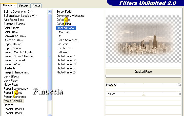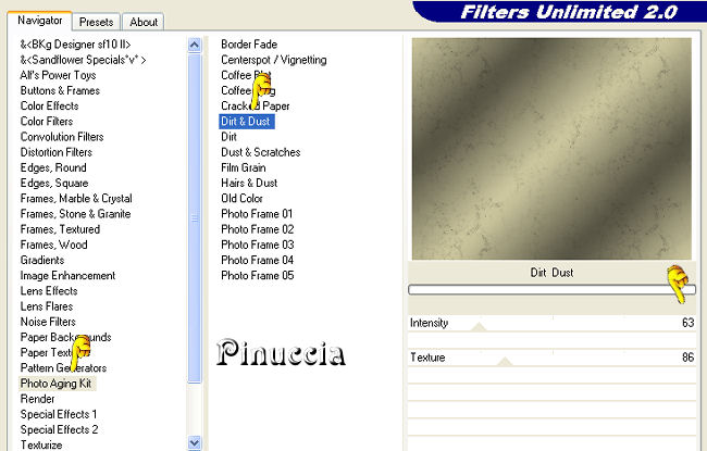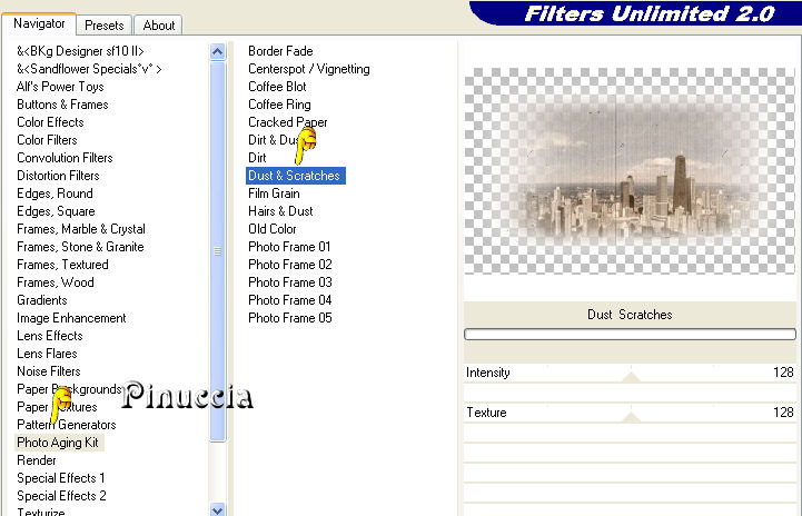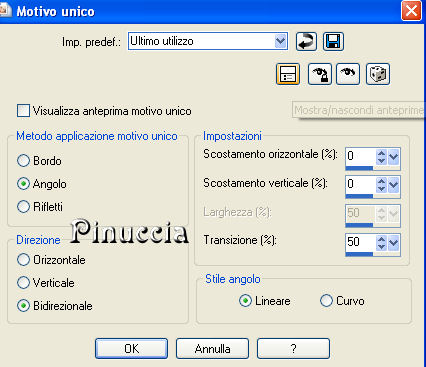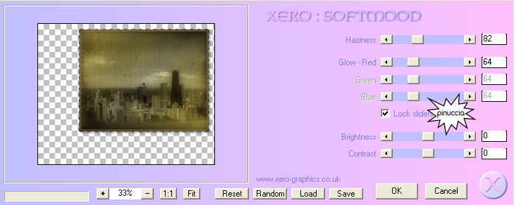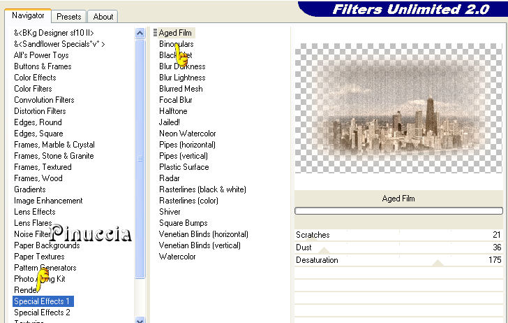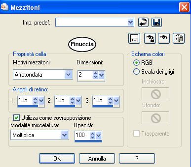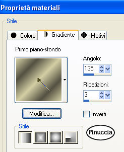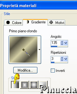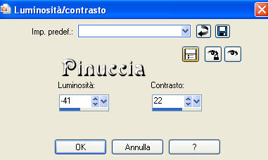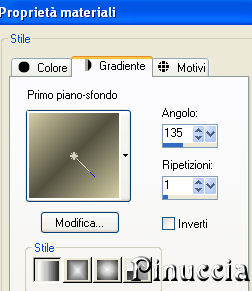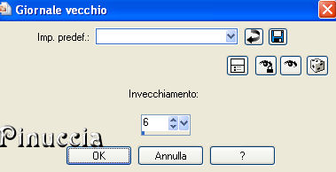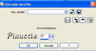 qui puoi trovare qualche risposta ai tuoi dubbi. Se l'argomento che ti interessa non è presente, ti prego di segnalarmelo. Questo tutorial è stato scritto con PSP X2, ma può essere eseguito anche con le altre versioni di PSP. Il copyright del tutorial appartiene a Laguna Azul. Il copyright della traduzione è mio. Il copyright dei tubes e delle immagini è dei rispettivi artisti. Per favore, rispetta il lavoro degli autori. Occorrente: Materiale qui FiltrI: FM Tile Tools qui Xero qui Filters Unlimited 2.0 qui Eye Candy 5 Textures qui Filter Factory V qui Photo Aging Kit qui i filtri Factory Gallery per essere usati devono prima essere convertiti. Come fare vedi qui Si possono usare importati in Filters Unlimited 2.0, ma funzionano anche da soli. Anche Photo Aging Kit si usa importato in Filters Unlimited 2.0. Come importare filtri in Unlimited vedi qui 1. Apri una nuova immagine trasparente 750 x 600 pixels. Scegli due colori dal tuo tube e imposta il colore di primo piano con un colore chiaro (#d4cea4), e il colore di sfondo con un colore scuro (#525041). Passa il colore di primo piano a Gradiente con i seguenti settaggi: ![]() Riempi l'immagine trasparente con questo gradiente.Regola>Sfocatura>Sfocatura gaussiana - raggio 20. ![]() 2. Effetti>Plugins>Filters Unlimited 2.0 - Photo Aging Kit - Dirt and Dust. ![]() Effetti>Effetti di bordo>Aumenta. Livelli>Duplica. 3. Effetti>Effetti artistici>Giornale vecchio: ![]() Apri la maschera dmsk001 e minimizzala nella tua area di lavoro. Torna al tuo lavoro. Livelli>Nuovo livello maschera>Da immagine. Apri il menu sotto la finestra di origine e seleziona la maschera con i seguenti settaggi: ![]() Livelli>Unisci>Unisci gruppo. Cambia la modalità di miscelatura di questo livello in Moltiplica, e abbassa l'opacità al 50%. Effetti>Effetti di bordo>Aumenta di più. Non chiudere la maschera perchè ti servirà ancora. 4. Apri il tube GD_Misted_Gorgeous_Red_Rose e vai a Modifica>Copia. Torna al tuo lavoro, attiva il livello inferiore e vai a Modifica>Incolla come nuovo livello. Effetti>Effetti di immagine>Motivo unico, con i seguenti settaggi: ![]() Effetti>Plugins>FM Tile Tools - Blend Emboss, con i settaggi standard, 2 volte. ![]() Cambia la modalità di miscelatura di questo livello in Luce diffusa, e abbassa l'opacità al 50%. Minimizza questa immagine per il momento. 5. Apri una nuova immagine trasparente 565x450 pixels, e riempila con il colore di sfondo.Effetti>Plugins>Filters Unlimited 2.0 - Photo Aging Kit - Photo Frame 02. ![]() Effetti>Effetti artistici>Giornale vecchio: ![]() Attiva lo strumento Bacchetta magica tolleranza e sfumatura 0,![]() clicca sullo sfondo per selezionarlo. Premi sulla tastiera il tasto CANC ![]() Selezione>Deseleziona. Livelli>Nuovo livello raster. Livelli>Disponi>Sposta giù. Cambia i settaggi del gradiente: ![]() Riempi il livello con il gradiente.6. Regola>Luminosità e contrasto>Luminosità e contrasto, con i seguenti settaggi: ![]() 7. Apri il tube la_chicago, e vai a Modifica>Copia. Torna al tuo lavoro e vai a Modifica>Incolla come nuovo livello. Cambia la modalità di miscelatura di questo livello in Luminanza (esistente). Effetti>Plugins>Filters Unlimited 2.0 - Special Effects 1 - Aged Film: ![]() Effetti>Plugins>Filters Unlimited 2.0 - Photo Aging Kit - Cracked Paper: ![]() 8. Effetti>Plugins>Filters Unlimited 2.0 - Photo Aging Kit - Dust and Scratches: ![]() Livelli>Duplica. Livelli>Nuovo livello maschera>Da immagine: Seleziona nuovamente la maschera dmsk001: ![]() Livelli>Unisci>Unisci gruppo. Cambia la modalità di miscelatura di questo livello in Moltiplica. Effetti>Plugins>FM Tile Tools - Blend Emboss, con i settaggi standard, 2 volte. Livelli>Unisci>Unisci tutto. 9. Immagine>Aggiungi bordatura, 15 pixels, simmetriche, con il colore #1c1a16 (è lo stesso colore scuro dello spazio esterno alla cornice). Livelli>Innalza livello di sfondo. Seleziona il bordo con la bacchetta magica , sfumatura 1,e premi sulla tastiera 2 volte il tasto canc ![]() ![]() Selezione>Deseleziona. Regola>Messa a fuoco>Accentua messa a fuoco. 10. Modifica>Copia. Attiva l'immagine che hai messo da parte al punto 4. Attiva il livello superiore e vai a Modifica>Incolla come nuovo livello. Sposta l'immagine nell'angolo in alto a destra.![]() Effetti>Effetti 3D>Sfalsa ombra, con i seguenti settaggi, colore nero: ![]() Livelli>Duplica. Attiva il secondo livello dall'alto. Immagine>Ruota per gradi - 5 gradi a destra: ![]() Cambia la modalità di miscelatura di questo livello in Moltiplica. Attiva nuovamente il livello superiore. Regola>Luminosità e contrasto>Luminosità e contrasto, con i settaggi precedenti: ![]() ![]() 11. Effetti>Plugins>Xero - Soft Mood, con i seguenti settaggi: ![]() 12. Apri il tube la_letter, e vai a Modifica>copia. Torna al tuo lavoro e vai a Modifica>Incolla come nuovo livello. Spostalo nell'angolo in basso a destra.![]() Cambia la modalità di miscelatura di questo livello in Sovrapponi. 13. Apri il tube la_bmw_335_limousine_1939, e vai a Modifica>Copia. Torna al tuo lavoro e vai a Modifica>Incolla come nuovo livello. Immagine>Ridimensiona, al 60%, tutti i livelli non selezionato. Sposta l'auto come nell'esempio.![]() Effetti>Plugins>Xero - Super Smooth, con i seguenti settaggi: ![]() Effetti>Plugins>Filter Factory V - Posterize - steps 246. ![]() questo effetto, come molti effetti della serie Filters Factory, si può trovare anche in altri Filtri. Per questo, se non lo trovi nella lista di questo filtro, vuol dire che l'hai già inserito nei Percorsi con un altro filtro. Nel caso specifico, puoi trovare Posterize anche in VM Toolbox. Effetti>Plugins>Xero - Improver, con i seguenti settaggi: ![]() Effetti>Effetti artistici>Giornale Vecchio: ![]() Livelli>Duplica. Cambia la modalità di miscelatura di questo livello in Luce netta. Effetti>Effetti 3D>Sfalsa ombra, con i seguenti settaggi, colore nero: ![]() 14. Apri il tube Thaiss..., e vai a Modifica>copia. Torna al tuo lavoro e vai a Modifica>Incolla come