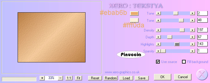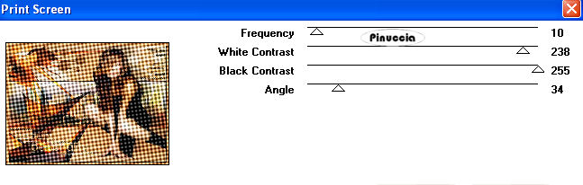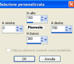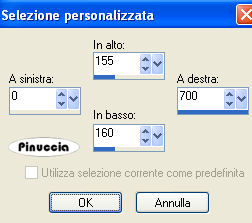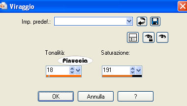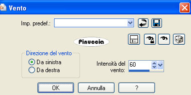 qui puoi trovare qualche risposta ai tuoi dubbi. Se l'argomento che ti interessa non è presente, ti prego di segnalarmelo. Questo tutorial è stato scritto con PSP x, ma può essere eseguito anche con le altre versioni di PSP. Il copyright del tutorial appartiene a Laguna Azul. Il copyright della traduzione è mio. Il copyright dei tubes e delle immagini è dei rispettivi artisti. Per favore, rispetta il lavoro degli autori. Occorrente: Materiale qui Importa i pennelli in PSP (come fare vedi qui) Filtro: Xero qui VM Toolbox qui 1. Apri una nuova immagine trasparente 700 x 520 pixels. Imposta il colore di primo piano con #fff0da (un colore chiaro dal tube), e il colore di sfondo con #7b4112 (un colore scuro dal tuo tube). Passa il colore di primo piano a Gradiente di primo piano/sfondo, con i seguenti settaggi. ![]() Riempi l'immagine trasparente con il gradiente.Effetti>Plugins>Xero - Tekstya, con i seguenti settaggi: ![]() 2. Apri il tube la_city-19, e vai a Modifica>copia. non chiudere il tube, perchè ti servirà ancora. Torna al tuo lavoro e vai a Modifica>Incolla come nuovo livello. Immagine>Ridimensiona, al 300%, tutti i livelli non selezionato. Effetti>Effetti di distorsione>Vento, con i seguenti settaggi: ![]() Cambia la modalità di miscelatura di questo livello in Luce diffusa. 3. Livelli>Nuovo livello raster. Attiva lo strumento Pennello ![]() (lo strumento si può attivare anche premendo sulla tastiera il tasto B), cerca e seleziona il pennello Shapes and curvers 9, e applicalo sull'immagine con il colore di primo piano. Sposta il pennello nell'angolo in alto a sinistra.4. Livelli>Nuovo livello raster. Cerca e seleziona il pennello Wild Swirl 4, e applica anche questo con il colore di primo piano. Sposta questo pennello nell'angolo in alto a destra.![]() 5. Apri il tube la_flowers-11 e vai a Modifica>copia. Torna al tuo lavoro e vai a Modifica>Incolla come nuovo livello. Immagine>Ridimensiona, al 70%, tutti i livelli non selezionato. Regola>Saturazione e tonalità>Viraggio: ![]() Immagine>Rifletti. Immagine>Capovolgi. Regola>Rimozione disturbo in un passaggio. Sposta il fiore nell'angolo in alto a sinistra.Cambia la modalità di miscelatura di questo livello in Luce netta. 6. Livelli>Nuovo livello raster. Attiva lo strumento Selezione ,clicca sull'icona Selezione personalizzata ![]() e imposta i seguenti settaggi. ![]() Apri l'immagine wolke 176 e vai a Modifica>copia. Torna al tuo lavoro e vai a Modifica>Incolla nella selezione. Cambia la modalità di miscelatura di questo livello in Sovrapponi. 7. Mantieni selezionato. Attiva nuovamente il tube la_city-19, e vai a Modifica>Copia. Torna al tuo lavoro e vai a Modifica>Incolla come nuovo livello. Sposta il tube in basso, come nell'esempio.![]() Selezione>Inverti. Premi sulla tastiera il tasto CANC ![]() Selezione>Deseleziona. Cambia la modalità di miscelatura di questo livello in Luce netta. 8. Livelli>Nuovo livello raster. Attiva nuovamente Selezione personalizzata , con i seguenti settaggi:![]() Riempi la selezione con il colore #752f0c.Effetti>Effetti 3D>Smusso a incasso, con i seguenti settaggi: ![]() Selezione>Deseleziona. Livelli>Duplica. Immagine>Capovolgi. 9. Apri il tube @nn_141007_photos_227_abstract_tdstudio, e vai a Modifica>Copia. Torna al tuo lavoro e vai a Modifica>Incolla come nuovo livello. Immagine>Ridimensiona, al 60%, tutti i livelli non selezionato. Sposta il tube nell'angolo in basso a sinistra.Cambia la modalità di miscelatura di questo livello in Luce netta. ![]() 10. Apri il tube la_woman_120, e vai a Modifica>copia. Torna al tuo lavoro e vai a Modifica>Incolla come nuovo livello. Immagine>Ridimensiona, al 70%, tutti i livelli non selezionato. Regola>Messa a fuoco>Metti a fuoco. Sposta il tube a destra, in modo che non si noti la troncatura del piede.Effetti>Effetti 3D>Sfalsa ombra, con i seguenti settaggi, colore nero: ![]() 11. Apri il tube la_points_dark, e vai a Modifica>Copia. Torna al tuo lavoro e vai a Modifica>Incolla come nuovo livello. Spostalo in alto a sinistra accanto al fiore.Abbassa l'opacità di questo livello al 75%. Apri il tube la_points, e vai a Modifica>Copia. Torna al tuo lavoro e vai a Modifica>Incolla come nuovo livello. Spostalo nell'angolo in alto a destra, o dove preferisci.Abbassa l'opacità di questo livello al 75%. 12. Apri il tube la_text, e vai a Modifica>Copia. Torna al tuo lavoro e vai a Modifica>Incolla come nuovo livello. Spostalo nell'angolo in alto a destra.se trovi difficoltà a spostarlo, attiva il puntatore ,(o premi il tasto D sulla tastiera); quando hai fatto, per liberarti della griglia, premi il tasto M. 13. Apri il tube la_pfeile, e vai a Modifica>Copia. Torna al tuo lavoro e vai a Modifica>Incolla come nuovo livello. Sposta il tube a destra, sotto il testo.Livelli>Duplica. Immagine>Rifletti. Immagine>Capovolgi. 14. Livelli>Nuovo livello raster. Attiva lo strumento Pennello ![]() cerca e seleziona il pennello mzepeda-quotestack-beauty01, dimensione 400, imposta il colore di primo piano con #dd9d5d (una tonalità media del tuo tube), e applicalo sull'immagine con questo colore. Posiziona il pennello a sinistra.Effetti>Effetti 3D>sfalsa ombra, con i seguenti settaggi, colore nero: ![]() Livelli>Duplica. Cambia la modalità di miscelatura di questo livello in Filtra. Attiva il secondo livello dall'alto (il livello originale del pennello). Effetti>Effetti di distorsione>Vento, con i settaggi precedenti. Effetti>Effetti di bordo>Aumenta di più. Livelli>Unisci>Unisci tutto. 15. Immagine>Aggiungi bordatura, 1 pixel, simmetriche, con il colore nero. Immagine>Aggiungi bordatura, 10 pixels, simmetriche, con il colore #dd9d5d. Seleziona questo bordo con la bacchetta magica ![]() ![]() Effetti>Plugins>VM Toolbox - Print Screen: ![]() Selezione>inverti. Effetti>Effetti 3D>sfalsa ombra, con i seguenti settaggi, colore nero: ![]() Selezione>Deseleziona. 16. Immagine>Aggiungi bordatura, 1 pixel, simmetriche, con il colore #8e5216 (un colore scuro dal tuo tube). Immagin