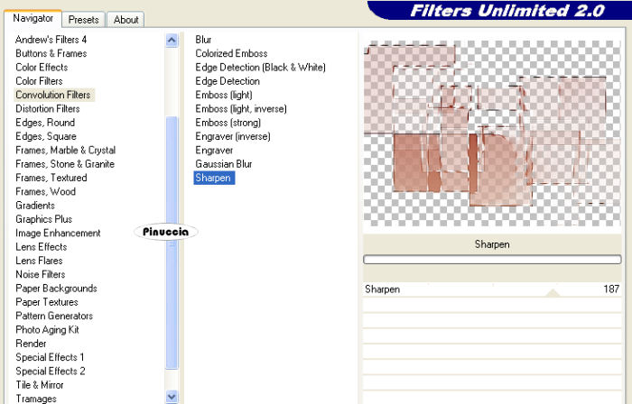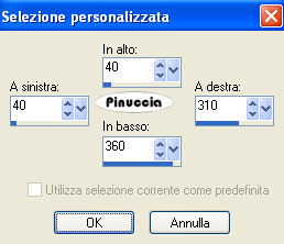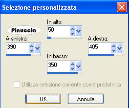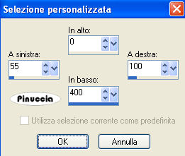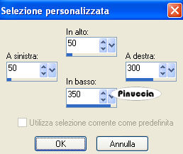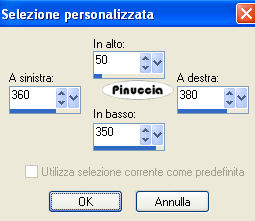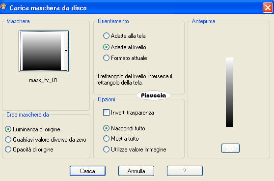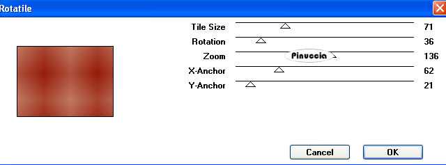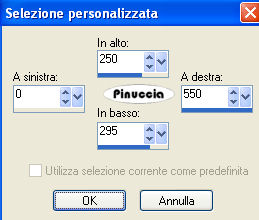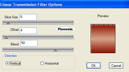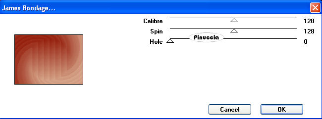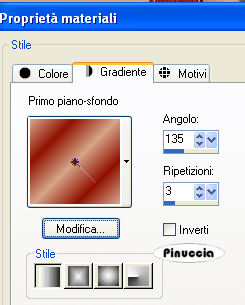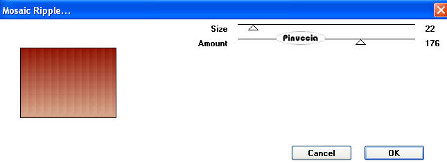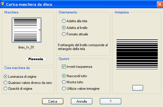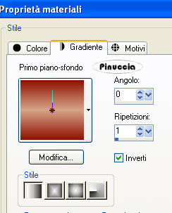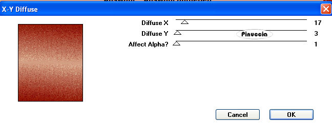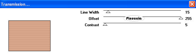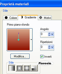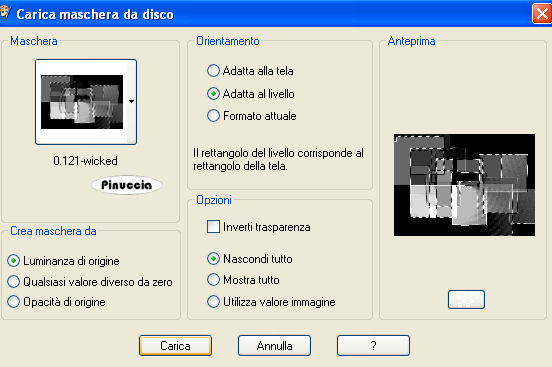 qui puoi trovare qualche risposta ai tuoi dubbi. Se l'argomento che ti interessa non è presente, ti prego di segnalarmelo. Questo tutorial è stato scritto con PSP 9, ma può essere eseguito anche con le altre versioni di PSP. Il copyright del tutorial appartiene a Laguna Azul. Il copyright della traduzione è mio. Il copyright dei tubes e delle immagini è dei rispettivi artisti. Per favore, rispetta il lavoro degli autori. Occorrente: Materiale qui Filtri: Filters Unlimited 2.0 qui Graphics Plus qui I-Decay qui VM Distortion qui VM Extravaganza qui VM Toolbox qui Xero qui DSB Flux qui Metti le Maschere nella cartella maschere. 1. Apri una nuova immagine trasparente 550 x 400 pixels. Imposta il colore di primo piano con #d6a489, e il colore di sfondo con #8f1100. Riempi l'immagine trasparente con il colore di primo piano.Effetti>Plugins>VM Extravaganza - Transmission, con i seguenti settaggi: ![]() 2. Livelli>Nuovo livello raster. Passa il colore di primo piano a Gradiente di primo piano/sfondo, con i seguenti settaggi: ![]() Riempi il nuovo livello con il gradiente.Effetti>Plugins>VM Toolboox - Rotatile, con i settaggi standard. ![]() Cambia la modalità di miscelatura di questo livello in Luce diffusa. 3. Livelli>Nuovo livello raster. Riempi con il gradiente.Effetti>Plugins>VM Distortion - Mosaic Ripple. con i settaggi standard. ![]() Effetti>Plugins>VM Extravaganza - James Bondage, con i settaggi standard. ![]() Cambia la modalità di miscelatura di questo livello in Moltiplica, e abbassa l'opacità all'80%. 4. Effetti>Effetti di bordo>Aumenta. Attiva lo strumento Selezione ,, e imposta i seguenti settaggi: ![]() Livelli>Nuovo livello raster. Cambia i settaggi del gradiente: ![]() Riempi con il gradiente.Effetti>Plugins>DSB Flux - Linear Transmission, con i seguenti settaggi: ![]() 5. Effetti>Effetti di bordo>Aumenta di più. Effetti>Plugins>I-Decay - X-Y Diffuse, con i settaggi standard. ![]() Effetti>Effetti 3D>Sfalsa ombra, con i seguenti settaggi: ![]() Selezione>Nessuna selezione. 6. Attiva lo strumento Selezione personalizzata , con i seguenti settaggi![]() Selezione>Inverti. Livelli>Nuovo l ivello raster. Riempi con il gradiente del punto 4.Selezione>Inverti. Selezione>Modifica>Espandi - 10 pixels. Selezione>Inverti. Premi sulla tastiera il tasto CANC ![]() Selezione>Inverti. Effetti>Effetti 3D>Sfalsa ombra, con i settaggi usati al punto 5. 7. Selezione>Modifica>Espandi - 10 pixels. Selezione>Inverti. Livelli>Nuovo livello raster. Riempi con il gradiente.Selezione>Inverti. Selezione>Modifica>Espandi - 10 pixels. Selezione>Inverti. Premi sulla tastiera il tasto CANC. Selezione>Inverti. Effetti>Effetti 3D>Sfalsa ombra, con i settaggi precedenti. 8. Selezione>Nessuna selezione. Apri il tube Cowboyjk, e vai a Modifica>Copia. non chiuderlo, perchè ti servirà ancora. Torna al tuo lavoro e vai a Modifica>Incolla>Incolla come nuovo livello. Immagine>Ridimensiona, al 63%, tutti i livelli non selezionato. Regola>Messa a fuoco>Metti a fuoco. Effetti>Effetti 3D>Sfalsa ombra, con i settaggi precedenti. Sposta il tube al centro delle cornici.9. Attiva lo strumento Selezione personalizzata , con i seguenti settaggi:![]() Livelli>Nuovo livello raster. Riempi con il colore di sfondo.Selezione>Modifica>Contrai, 3 pixels. Riempi con il colore di primo piano.Abbassa l'opacità di questo livello al 50%. Selezione>Nessuna selezione. Effetti>Effetti di bordo>Aumenta. 10. Livelli>Carica/Salva maschera>Carica maschera da disco. Cerca e carica la maschera mask_fv_01, con i seguenti settaggi: ![]() Livelli>Unisci>Unisci gruppo. 11. Attiva lo strumento Selezione personalizzata con i seguenti settaggi:![]() Livelli>Nuovo livello raster. Riempi la selezione con il colore scuro di sfondo.Selezione>Modifica>Contrai, 3 pixels. Riempi con il colore di primo piano.Abbassa l'opacità di questo livello al 50%. Selezione>Nessuna selezione. Effetti>Effetti di bordo>Aumenta. Livelli>Carica/Salva maschera>Carica maschera da disco. Cerca e carica la maschera mask_fv_02, con i seguenti settaggi: ![]() Livelli>Unisci>Unisci gruppo. 12. Attiva lo strumento Selezione personalizzata , con i seguenti settaggi:![]() Livelli>Nuovo livello raster. Cambia i settaggi del gradiente: ![]() Riempi la selezione con il gradiente.Regola>Aggiungi/rimuovi disturbo>Aggiungi disturbo, con i seguenti settaggi. ![]() Effetti>Effetti 3d>Sfalsa ombra, con i settaggi precedenti. Selezione>Nessuna selezione. 13. Attiva lo strumento Selezione personalizzata con i seguenti settaggi:![]() Livelli>Nuovo livello raster. Cambia i settaggi del gradiente, togliendo la spunta a Inverti: ![]() Riempi la selezione con il gradiente.Regola>Aggiungi/rimuovi disturbo>Aggiungi disturbo, con i settaggi precedenti. Effetti>Effetti 3D>Sfalsa ombra, con i settaggi precedenti. Selezione>Nessuna selezione. 14. Attiva nuovamente il tube Cowboyjk, e vai a Modifica>Copia. Torna al tuo lavoro e vai a Modifica>Incolla>Incolla come nuovo livello. Spostalo a destra.Nella paletta dei livelli trascina questo livello come terzo livello dal basso, e abbassa l'opacità al 50%. ![]() ![]() 15. Livelli>Nuovo livello raster. Riempi con il gradiente.Livelli>Carica/Salva maschera>Carica maschera da disco. Cerca e carica la maschera 0.121-wicked, con i seguenti settaggi: ![]() Livelli>Unisci>Unisci gruppo. Effetti>Plugins>Filters Unlimited - Convolution Filter - Sharpen, con i settaggi standard. ![]() 16. Attiva il livello superiore. Livelli>Nuovo livello raster. Cambia i settaggi del gradiente: ![]() Riempi il livello con il gradiente.Livelli>Carica/Salva maschera>Carica maschera da disco. Cerca e carica la maschera lines_fv_01 con i seguenti settaggi. ![]() Livelli>Unisci>Unisci gruppo. Cambia la modalità di miscelatura di questo livello in Moltiplica. Immagine>Ridimensiona, con i seguenti settaggi: ![]() 17. Sposta le linee in basso.Livelli>Duplica. Cambia la modalità di miscelatura di questo livello in Filtra. Sposta le linee un po' più in alto, approssimatimente come nella