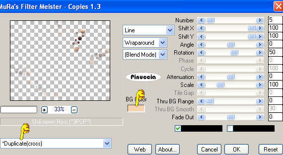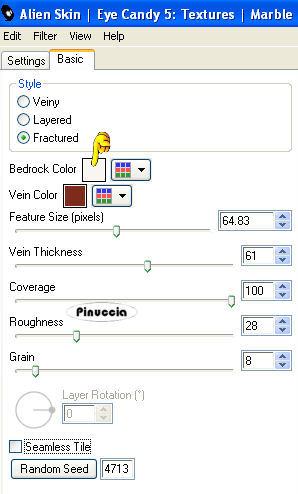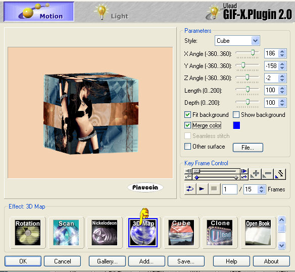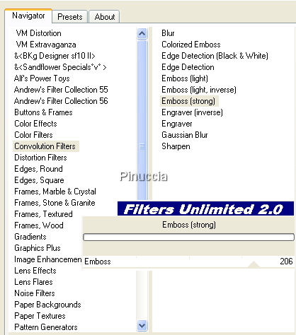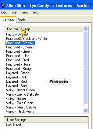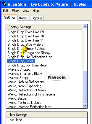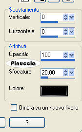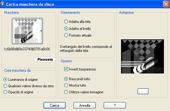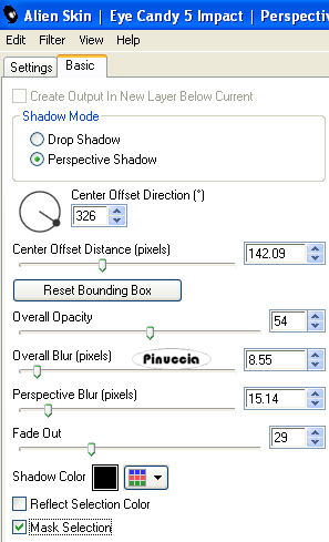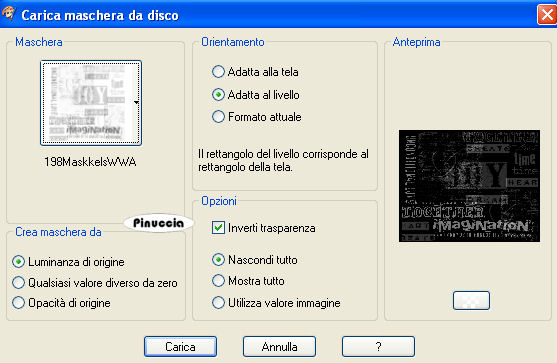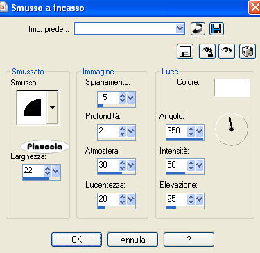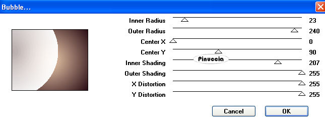 qui puoi trovare qualche risposta ai tuoi dubbi. Se l'argomento che ti interessa non è presente, ti prego di segnalarmelo. Questo tutorial è stato scritto con PSP X, ma può essere eseguito anche con le altre versioni di PSP. Il copyright del tutorial appartiene a Laguna Azul. Il copyright della traduzione è mio. Il copyright dei tubes e delle immagini è dei rispettivi artisti. Per favore, rispetta il lavoro degli autori. Occorrente: Materiale qui Filtri: Filters Unlimited 2.0 qui Eye Candy 5 - Impact qui Eye Candy 5 - Textures qui Mura's Meister qui Ulead GIF-X 2.0 qui Filters Factory Gallery B qui I filtri Factory Gallery devono essere convertiti per poterli usare. Come fare vedi qui Metti le maschera nella cartella Maschere. Apri i font e minimizzali nella tua area di lavoro. Li troverai nella lista dei font disponibili, quando ti serviranno. 1. Apri una nuova immagine trasparente 600 x 480 pixels. Scegli dal tube un colore chiaro come colore di primo piano (#f4d1b1), e un colore scuro come colore di sfondo (#2c0f17). Passa il colore di primo piano a Gradiente di primo piano/sfondo: ![]() Riempi l'immagine trasparente con il gradiente.Effetti>Plugins>Filter Factory Gallery B - Bubble, con i seguenti settaggi: ![]() Immagine>immagine negativa. 2. Livelli>Nuovo livello raster. Riempi con il colore di primo piano.Livelli>Carica/Salva maschera>Carica maschera da disco. Cerca e carica la maschera !cid_003201c6......: ![]() Livelli>Unisci>Unisci gruppo. Immagine>Immagine negativa. 3. Livelli>Nuovo livello raster. Riempi con il colore di sfondo.ricorda che, per riempire con il colore di sfondo, devi cliccare con il tasto destro del mouse Livelli>Carica/Salva maschera>Carica maschera da disco. Carica nuovamente la maschera 198MaskkelsWWA, con gli stessi settaggi. ![]() Livelli>Unisci>Unisci gruppo. Effetti>Plugins>Filters Unlimited 2.0 - Convolution Filter - Emboss(strong), con i settaggi standard. ![]() Cambia la modalità di miscelatura di questo livello in Luce diffusa. 4. Apri il tube Thaïss...vec-08, e vai a Modifica>copia. Torna al tuo lavoro e vai a Modifica>Incolla come nuovo livello. Immagine>Rifletti. Sposta il tube a destra, come nel mio esempio.![]() Effetti>Plugins>Filters Unlimited 2.0 - Convolution Filter - Emboss(Strong), con i settaggi standard. Cambia la modalità di miscelatura di questo livello in Rafforza, e abbassa l'opacità al 20%. 5. Livelli>Nuovo livello raster. Attiva lo strumento Selezione , rettangolo.(lo strumento si attiva anche premendo sulla tastiera il tasto S). clicca sull'icona Selezione personalizzata ,e imposta i seguenti settaggi: ![]() Riempi la selezione con il colore di primo piano.6. Mantieni selezionato. Effetti>Plugins>Alien Skin Eye Candy 5 - Nature - Ripples: prima, sotto Setting, seleziona Single Drop, Small: ![]() e poi, sotto Basic, imposta i seguenti settaggi: ![]() 7. Mantieni selezionato. Selezione>Inverti. Premi sulla tastiera il tasto CANC. Selezione>Deseleziona. Cambia la modalità di miscelatura di questo livello in Differenza. 8. Livelli>Nuovo livello raster. Attiva nuovamento lo strumento Selezione personalizzata con i seguenti settaggi:![]() Riempi la selezione con il colore di primo piano.Effetti>Plugins>Alien Skin Eye Candy 5 - Textures - Marble: prima, sotto Settings, seleziona Fractured - Creamy: ![]() quindi, sotto Basic, imposta i seguenti settaggi e il colore bianco (#ffffff) come Bedrock Color. ![]() Cambia la modalità di miscelatura di questo livello in Moltiplica. Effetti>Effetti 3D>Sfalsa ombra, con i seguenti settaggi, colore nero. ![]() Selezione>Deseleziona. 9. Livelli>Nuovo livello raster. Attiva lo strumento Selezione , cerchio:![]() Disegna alcuni cerchi come nel mio esempio: ![]() Cambia i settaggi del gradiente: ![]() e riempi la selezione con il gradiente.impostando "Nessuno" come modalità di corrispondenza dello strumento Riempimento, basterà un solo clic per riempire tutti i cerchi Selezione>Deseleziona. 10. Effetti>Effetti 3D>Smusso a incasso ![]() Effetti>Plugins>Mura's Meister - Copies: imposta con i seguenti settaggi, come colore di sfondo il colore chiaro f4d1b1. ![]() A questo punto, cancella con cautela i primi cerchi.![]() Cambia la modalità di miscelatura di questo livello in Luce netta. 11. Apri il tube Thaïss...vec-08, e vai a Modifica>Copia. Torna al tuo lavoro e vai a Modifica>Incolla come nuovo livello. Immagine>Ridimensiona, al 67%, tutti i livelli non selezionato. Regola>Messa a fuoco>Metti a fuoco. Sposta il tube a sinistra, contro il bordo.Fai una copia di questo lavoro, premendo sulla tastiera la combinazione di tasti shift(maiuscola)+D. Livelli>Unisci>Unisci visibile (stai unendo i livelli della copia). 12. Effetti>Plugins>Ulead Effects - Gif-X 2.0: prima seleziona l'effetto - 3DMap - poi imposta i settaggi come nella schermata, e clicca ok. ![]() Modifica>Copia. Attiva il tuo lavoro originale e vai a Modifica>Incolla come nuovo livello. 13. Immagine>Ridimensiona, al 70%, tutti i livelli non selezionato. Regola>Messa a fuoco>Metti a fuoco. Sposta il cubo nell'angolo in basso a destra.Livelli>Duplica. 14. Effetti>Plugins>Alien Skin Eye Candy 5 - Impact - Perspective Shadow: sotto Settings imposta Short Perspective Shadow, in Back. ![]() quindi, sotto Basic, imposta i seguenti settaggi: ![]() 15. Attiva il secondo livello dall'alto. Selezione>Seleziona tutto. Selezione>Mobile. Selezione>Immobilizza. Attiva il livello superiore e premi il tasto CANC. Selezione>Deseleziona. Livelli>Disponi>Sposta giù. Attiva il livello superiore e cambia la modalità di miscelatura in Filtra. 16. Attiva lo strumento Testo ,chiudi il colore di primo piano, e seleziona il font Gismonda, con i seguenti settaggi: ![]() Scrivi il tuo nome o quello che preferisci in lettere maiuscole. Livelli>Converti in livello raster. Sposta il testo sopra il cubo. Cambia la modalità di miscelatura di questo livello in Luce netta, e abbassa l'opacità al 75%. 17. Inverti nella paletta dei materiali i colori di primo piano