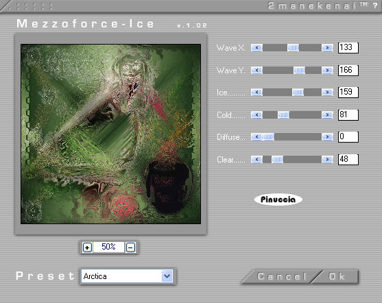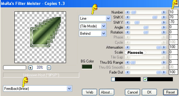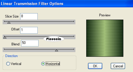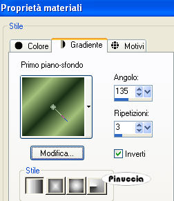 qui puoi trovare qualche risposta ai tuoi dubbi. Se l'argomento che ti interessa non è presente, ti prego di segnalarmelo. Questo tutorial è stato scritto con PSP 9, ma può essere eseguito anche con le altre versioni di PSP. Il copyright del tutorial appartiene a Laguna Azul. Il copyright della traduzione è mio. Il copyright dei tubes e delle immagini è dei rispettivi artisti. Per favore, rispetta il lavoro degli autori. Questo tutorial è stato riscritto. Trovi le traduzioni della nuova versione del tutorial qui: traduzione italiana ![]() traduzione francese ![]() Occorrente: Materiale qui Filtri: DSB Flux qui Filters Unlimited 2.0 qui Graphics Plus qui Mezzoforce Ice 1.02 qui Mura's Meister qui Penta.com qui 1. Apri una nuova immagine trasparente 500 x 500 pixels. Scegli dal tuo tube un colore chiaro come colore di primo piano (#a3c17a), e un colore scuro come colore di sfondo (#192f16). Passa il colore di primo piano a Gradiente di primo piano/sfondo: ![]() Riempi l'immagine trasparente con il gradiente.2. Effetti>Plugins>DSB Flux - Linear Transmission, con i seguenti settaggi. ![]() Effetti>Effetti di bordo>Aumenta. 3. Attiva lo strumento Selezione , rettangolo, sfumatura 0.Traccia un quadrato sull'immagine, non preoccuparti se non è esattamente al centro, lo potrai spostare più tardi. La dimensione del quadrato dovrebbe essere approssimativamente 243x243 pixels: puoi controllare le misure sulla barra di stato inferiore. ![]() 4. Livelli>Nuovo livello raster. Cambia i settaggi del gradiente: ![]() e riempi la selezione con questo gradiente.Selezione>Modifica>Contrai, di 8 pixels. Premi sulla tastiera il tasto CANC ![]() Selezione>modifica>Contrai, di 8 pixels. Lascia così la selezione: non devi riempirla. Ripeti Selezione>Modifica>Contrai, di 8 pixels. Premi sulla tastiera il tasto CANC. Selezione>Modifica>contrai, di 8 pixels. Riempi con il gradiente.Selezione>Nessuna selezione. ![]() 5. Adesso sposta l'immagine al centro.(oppure copiala e incollala come nuovo livello: in questo modo sarà perfettamente al centro; elimina poi il livello originale). Livelli>Duplica. Chiudi questo livello e posizionati sul livello sottostante. Immagine>Ridimensiona, all'80%, tutti i livelli non selezionato. Effetti>Plugins>Mura's Meister - Copies: ![]() Livelli>Duplica. Immagine>Rifletti. Livelli>Unisci>Unisci giù. Di nuovo: Livelli>Duplica. Immagine>Capovolgi. Livelli>Unisci>Unisci giù. Abbassa l'opacità di questo livello al 60%. Effetti>Effetti di bordo>Aumenta. Rendi nuovamente visibile il livello superiore e attivalo. Effetti>Effetti 3D>Sfalsa ombra: ![]() Ripeti l'Effetto Sfalsa ombra, ma cambiando verticale e orizzontale con -2. 6. Apri il tube vsc_Paradise by Jane Jones1, e vai a Modifica>Copia. Torna al tuo lavoro e vai a Modifica>Incolla>Incolla come nuovo livello. Immagine>Ridimensiona, al 50%,tutti i livelli non selezionato. Regola>Messa a fuoco>Metti a fuoco. Immagine>Rifletti. Sposta il tube in basso a destra.Effetti>Effetti 3D>Sfalsa ombra, con i settaggi usati al punto 5, ma senza la ripetizione con il segno meno. 7. Apri il tube hd-parfum, e vai a Modifica>copia. Torna al tuo lavoro e vai a Modifica>Incolla>Incolla come nuovo livello. Immagine>Ridimensiona, al 50%, tutti i livelli non selezionato. Regola>Messa a fuoco>Metti a fuoco. Sposta anche questo tube in basso a destra,in modo che non si veda il vaso di fiori. Effetti>Effetti 3D>Sfalsa ombra, con i settaggi precedenti. 8. Apri il tube goldkette, e vai a Modifica>copia. Torna al tuo lavoro e vai a Modifica>Incolla>Incolla come nuovo livello. Sposta il tube a sinistra.Effetti>Effetti 3D>Sfalsa ombra, con i settaggi precedenti. Apri il tube @nn_290607_photos_107_DiorG_tdstudio1, e vai a Modifica>Copia. Torna al tuo lavoro e vai a Modifica>Incolla>Incolla come nuovo livello. Immagine>Ridimensiona, all'80%, tutti i livelli non selezionato. Regola>Messa a fuoco>Metti a fuoco. Effetti>Effetti 3D>sfalsa ombra, con i settaggi precedenti. 9. Apri il tube "Word art", e vai a Modifica>copia. Torna al tuo lavoro e vai a Modifica>Incolla>Incolla come nuovo livello. Posizionalo il testo dove preferisci.Controlla che tutto sia al posto giusto e vai a Livelli>Unisci>Unisci tutto. ![]() Immagine>Aggiungi bordatura, 1 pixel, simmetriche, con il colore di sfondo. Immagine>Aggiungi bordatura, 10 pixels, simmetriche, con il colore bianco. Seleziona questo bordo con la bacchetta magica ![]() ![]() Riempi la selezione con il gradiente del punto 4.![]() Effetti>Plugins>Graphics Plus - Cross Shadow, con i settaggi standard. ![]() 10. Mantieni selezionato. Effetti>Plugins>Penta.com - Dot and Cross, con i settaggi standard. ![]() Effetti>Plugins>2manekenai - Mezzoforce Ice, con i seguenti settaggi. ![]() Effetti>Plugins>FM Tile Tools - Blend Emboss, con i settaggi standard. ![]() Effetti>Effetti 3D>Smusso a incasso. ![]() Selezione>Nessuna selezione. Immagine>Aggiungi bordatura, 1 pixel, simmetriche, con il colore di sfondo. Aggiungi il tuo nome e/o il tuo watermark. Livelli>Unisci>Unisci tutto. ![]() Per creare l'animazione Copia l'ìmmagine: Modifica>Copia. 11. Apri Animation Shop e vai a Modifica>Incolla>Incolla come nuova animazione. Modifica>Duplica, e ripeti finchè non avrai ottenuto 7 fotogrammi. Clicca sul primo fotogramma per selezionarlo e vai a Modifica>Seleziona tutto (oppure premi sulla tastiera la combinazione di tasti ctrl+A). Apri il tube Stars composto anche questo da 7 fotogrammi. Clicca sul primo fotogramma per selezionarlo e vai a Modifica>Seleziona tutto (Ctrl+A). Modifica>Copia (ctrl+C). Torna al tuo lavoro e vai a Modifica>Incolla>Incolla nel fotogramma selezionato (ctrl+E). Posiziona l'animazione sul primo diamantino e, quando sei certo di aver trovato la posizione corretta, rilascia il tasto del mouse. Ripeti Ctrl+E per aggiungere l'animazione sugli altri diamantini. Quando hai finito, controlla il risultato cliccando su Visualizza e salva in formato gif.![]() Se hai problemi o dubbi, o trovi un link non funzionante, o a