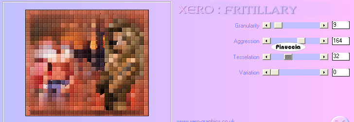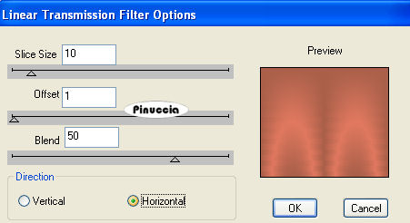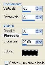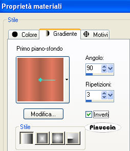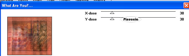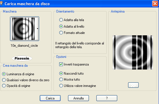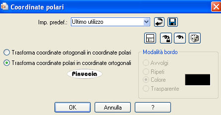qui puoi trovare qualche risposta ai tuoi dubbi. Se l'argomento che ti interessa non è presente, ti prego di segnalarmelo. Questo tutorial è stato scritto con PSP X, ma può essere eseguito anche con le altre versioni di PSP. Il copyright del tutorial appartiene a Laguna Azul. Il copyright della traduzione è mio. Il copyright dei tubes e delle immagini è dei rispettivi artisti. Per favore, rispetta il lavoro degli autori. Occorrente: Materiale qui Filtri: DSB Flux qui Graphics Plus qui Toadies qui Xero qui Metti la maschera nella cartella Maschere. Apri il pennello Dirty e vai a File>Esporta>Pennello personalizzato, assegna un nome al pennello e clicca ok. 1. Apri una nuova immagine trasparente 700 x 600 pixels. Imposta il colore di primo piano con un colore chiaro: #e27960, e il colore di sfondo con un colore scuro: #a95f49. Passa il colore di primo piano a Gradiente di primo piao/sfondo, con i seguenti settaggi: ![]() Riempi l'immagine trasparente con il gradiente.Effetti>Effetti di distorsione>Coordinate polari, con i seguenti settaggi: ![]() 2. Effetti>Plugins>Dsb Flux - Linear Transmission, con i seguenti settaggi: ![]() Effetti>effetti di bordo>Aumenta. 3. Apri il tube la_cars, e vai a Modifica>Copia. Torna al tuo lavoro e vai a Modifica>Incolla come nuovo livello. Spostalo nell'angolo in basso a destra.Cambia la modalità di miscelatura di questo livello in Luce diffusa, e abbassa l'opacità all'85%. 4. Apri il tube la_clouds, e vai a Modifica>Copia. Torna al tuo lavoro e vai a Modifica>Incolla come nuovo livello. Spostalo nell'angolo in alto a sinistra, più o meno come nell'esempio.![]() 5. Apri il tube la_city-10, e vai a Modifica>Copia. Torna al tuo lavoro e vai a Modifica>Incolla come nuovo livello. Posiziona il tube come nell'esempio.![]() 6. Livelli>Nuovo livello raster. Riempi con il colore di sfondo.Livelli>Carica/Salva maschera>Carica maschera da disco. Cerca e carica la maschera 10e_diamond_circle, con i seguenti settaggi: ![]() Livelli>Unisci>Unisci gruppo. Effetti>Effetti 3D>sfalsa ombra, con i seguenti settaggi, colore bianco. ![]() Di nuovo: Effetti>Effetti 3D>Sfalsa ombra, con i seguenti settaggi, colore nero: ![]() Cambia la modalità di miscelatura di questo livello in Luce diffusa. 7. Apri il tube la_man_victor, e vai a Modifica>Copia. Torna al tuo lavoro e vai a Modifica>Incolla come nuovo livello. Sposta il tube nell'angolo in basso a sinistra, più o meno come nell'esempio:![]() 8. Apri il tube jet-woman5-november-2007, e vai a Modifica>Copia. Torna al tuo lavoro e vai a Modifica>Incolla come nuovo livello. Immagine>Ridimensiona, al 90%, tutti i livelli non selezionato. Regola>Messa a fuoco>Metti a fuoco. Sposta il tube a destra:![]() Effetti>effetti 3D>Sfalsa ombra, con i seguenti settaggi, colore nero: ![]() 9. Livelli>Nuovo livello raster. Imposta il colore di primo piano con il bianco. Attiva lo strumento Pennello ![]() Cerca e seleziona il pennello Dirty4 e applicalo sull'immagine cliccando con il tasto sinistro del mouse, per usare il colore bianco di primo piano. Effetti>Effetti 3D>Sfalsa ombra, con i seguenti settaggi, colore nero: ![]() Cambia la modalità di miscelatura di questo livello in Sovrapponi, e abbassa l'opacità al 60%. Livelli>Unisci>Unisci tutto. 10. Immagine>Aggiungi bordatura, 2 pixels, simmetriche, con il colore #471c11. Immagine>Aggiungi bordatura, 6 pixels, simmetriche, con il colore #e27960. Seleziona questo bordo con la bacchetta magica , sfumatura e tolleranza 0,![]() Effetti>Plugins>Graphics Plus - Cross Shadow, con i settaggi standard. ![]() Selezione>Deseleziona. 11. Immagine>Aggiungi bordatura, 2 pixels, simmetriche, con il colore #471c11. Immagine>Aggiungi bordatura, 18 pixels, simmetriche, con il colore #e27960. Seleziona questo bordo con la bacchetta magica ![]() Effetti>Plugins>Toadies - What Are You"..., con i seguenti settaggi: ![]() 12. Mantieni selezionato. Effetti>Plugins>Xero - Fritillary, con i seguenti settaggi. ![]() 13. Mantieni ancora selezionato. Effetti>Effetti 3D>Smusso a incasso, con i seguenti settaggi: ![]() Selezione>Deseleziona. Immagine>Aggiungi bordatura, 1 pixel, simmetriche, con il colore #471c11. Aggiungi il tuo nome e/o il tuo watermark e salva in formato jpg. ![]() Se hai problemi o dubbi, o trovi un link non funzionante, o anche soltanto per un saluto, scrivimi. 30 Marzo 2008 |