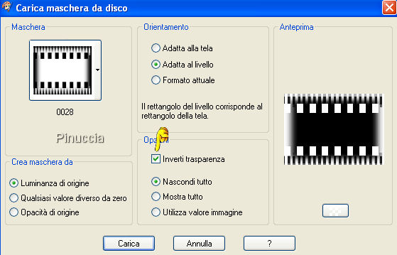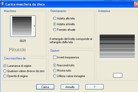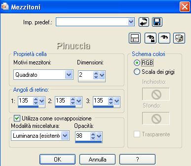 qui puoi trovare qualche risposta ai tuoi dubbi. Se l'argomento che ti interessa non è presente, ti prego di segnalarmelo. Questo tutorial è stato scritto con PSP 9, ma può essere eseguito anche con le altre versioni di PSP. Il copyright del tutorial appartiene a Laguna Azul. Il copyright della traduzione è mio. Il copyright dei tubes e delle immagini è dei rispettivi artisti. Per favore, rispetta il lavoro degli autori. Occorrente: Materiale qui Metti le maschere nella cartella Maschere. Filtro: Simple qui 1. Apri una nuova immagine trasparente 700 x 500 pixels. Imposta il colore di primo piano con #6d85b7, e il colore di sfondo con #280b87. Passa il colore di primo piano a Gradiente di primo piano/sfondo, con i seguenti settaggi: ![]() Riempi l'immagine trasparente con il gradiente.Regola>Sfocatura>Sfocatura gaussiana, raggio 20. ![]() 2. Livelli>Nuovo livello raster. Riempi questo livello con il colore di primo piano.Livelli>Carica/Salva maschera>Carica maschera da disco. Cerca e carica la maschera "0028", con i seguenti settaggi: ![]() Livelli>Unisci>Unisci gruppo. Effetti>Effetti di bordo>Aumenta. Cambia la modalità di miscelatura di questo livello in Sovrapponi, e abbassa l'opacità al 28%. 3. Apri il tube "house group", e vai a Modifica>copia. Torna al tuo lavoro e vai a Modifica>Incolla>Incolla come nuovo livello. Immagine>Ridimensiona, al 65%, tutti i livelli non selezionato. Regola>Messa a fuoco>Metti a fuoco. Sposta il tube nell'angolo in alto a sinistra.Cambia la modalità di miscelatura di questo livello in Sovrapponi. 4. Apri il tube "h_roentgen", e vai a Modifica>Copia. Torna al tuo lavoro e vai a Modifica>Incolla>Incolla come nuovo livello. Immagine>Ridimensiona, al 65%, tutti i livelli non selezionato. Sposta questo tube nell'angolo in alto a destra.Cambia la modalità di miscelatura di questo livello in Luminanza (esistente). ![]() 5. Livelli>Nuovo livello raster. Riempi questo livello con il colore di sfondo.ricorda che, per riempire con il colore di sfondo, devi cliccare con il tasto destro del mouse. Livelli>Carica/Salva maschera>Carica maschera da disco. Cerca e carica la maschera "0029", con i seguenti settaggi: ![]() Livelli>Unisci>Unisci gruppo. Effetti>Effetti di bordo>Aumenta. Cambia la modalità di miscelatura di questo livello in Sovrapponi, e abbassa l'opacità al 14%. 6. Apri il tube "h_25467", e vai a Modifica>Copia. Torna al tuo lavoro e vai a Modifica>Incolla>Incolla come nuovo livello. cambia la modalità di miscelatura di questo livello in Filtra, e spostalo nell'angolo in basso a sinistra, come nell'esempio.![]() 7. Apri il tube "h_roentgen 2", e vai a Modifica>Copia. Torna al tuo lavoro e vai a Modifica>Incolla>Incolla come nuovo livello. Sposta questo tube a destra, in modo che si veda soltanto una striscia di radiografie.![]() Cambia la modalità di miscelatura di questo livello in Filtra. 8. Apri il tube "group_house", e vai a Modifica>Copia. Torna al tuo lavoro e vai a Modifica>Incolla>Incolla come nuovo livello. Immagine>Ridimensiona, al 50%, tutti i livelli non selezionato. Regola>Messa a fuoco>Metti a fuoco. Sposta questo tube nell'angolo in basso a sinistra,ma lascia liberi almeno 2,5 cm dal bordo inferiore. ![]() 9. Apri il tube "flatline", e vai a Modifica>Copia. Torna al tuo lavoro e vai a Modifica>Incolla>Incolla come nuovo livello. Spostalo sotto il tube precedente, come mostrato nell'esempio.![]() Effetti>effetti 3D>Sfalsa ombra, con i seguenti settaggi, colore bianco (#ffffff). ![]() Ripeti l'Effetto Sfalsa ombra, ma cambiando verticale e orizzontale a -3. ![]() 10. Apri il tube "house" e vai a Modifica>Copia. Torna al tuo lavoro e vai a Modifica>Incolla>Incolla come nuovo livello. Spostalo a destra, guarda il mio esempio per controllare la posizione.Regola>Messa a fuoco>Metti a fuoco. Effetti>Effetti 3D>Sfalsa ombra, con i seguenti settaggi, colore nero: ![]() 11. Apri il tube "wordart house", e vai a Modifica>Copia. Torna al tuo lavoro e vai a Modifica>Incolla>Incolla come nuovo livello. Immagine>Ridimensiona, all'80%, tutti i livelli non selezionato. Regola>Messa a fuoco>Accentua messa a fuoco. Sposta il testo sotto la Flatline.Livelli>Unisci>Unisci tutto. 12. Immagine>Aggiungi bordatura, 1 pixel, simmetriche, con il colore nero. Immagine>Aggiungi bordatura, 25 pixels, simmetriche, con il colore bianco. Seleziona il bordo bianco con la bacchetta magica ![]() ![]() Effetti>Plugins>Simple - Quick Tile. Regola>Sfocatura>Sfocatura gaussiana, raggio 20. Effetti>Effetti artistici>Mezzitoni, con i seguenti settaggi: ![]() Selezione>Inverti. Effetti>Effetti 3D>Sfalsa ombra, con i seguenti settaggi, colore nero: ![]() Selezione>Nessuna selezione. Immagine>Aggiungi bordatura, 1 pixel, simmetriche, con il colore nero. Aggiungi il tuo nome e/o il tuo watermark e salva in formato jpg. ![]() Se hai problemi o dubbi, o trovi un link non funzionante, o anche soltanto per un saluto, scrivimi. 24 Febbraio 2008 |
