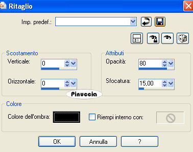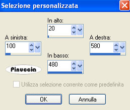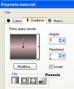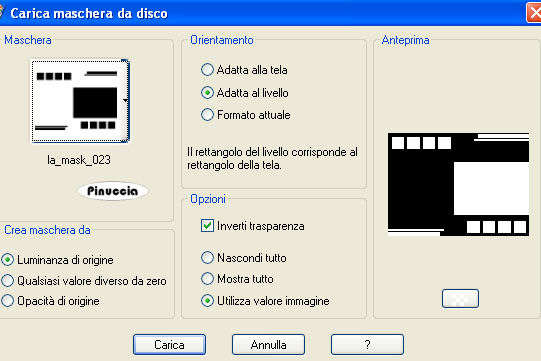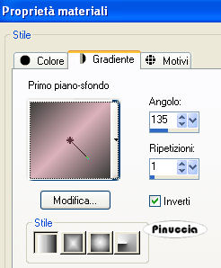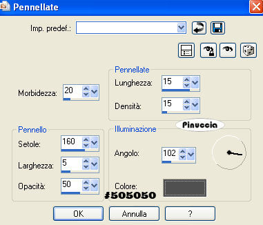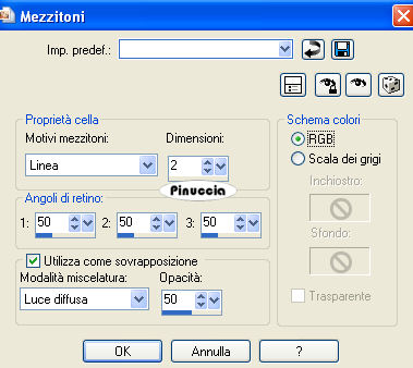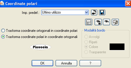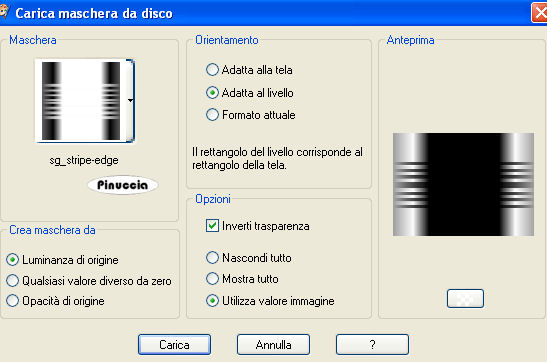 qui puoi trovare qualche risposta ai tuoi dubbi. Se l'argomento che ti interessa non è presente, ti prego di segnalarmelo. Questo tutorial è stato scritto con PSP X, ma può essere eseguito anche con le altre versioni di PSP. Il copyright del tutorial appartiene a Laguna Azul. Il copyright della traduzione è mio. Il copyright dei tubes e delle immagini è dei rispettivi artisti. Per favore, rispetta il lavoro degli autori. Occorrente: Materiale qui Metti le maschere nella cartella Maschere. 1. Apri una nuova immagine trasparente 680 x 500 pixels. Imposta il colore di primo piano con dcb2bc, e il colore di sfondo con #3c3c3a. Passa il colore di primo piano a Gradiente di primo piano/sfondo con i seguenti settaggi: ![]() Riempi l'immagine trasparente con il gradiente.Effetti>Effetti di distorsione>Tasselli, con i seguenti settaggi: ![]() Effetti>Effetti di distorsione>Coordinate polari, con i seguenti settaggi: ![]() 2. Livelli>Duplica. Immagine>Capovolgi. Cambia la modalità di miscelatura di questo livello in Luce netta. Premi sulla tastiera il tasto S per attivare lo strumento Selezione ![]() clicca sull'icona Selezione personalizzata ![]() e imposta i seguenti settaggi: ![]() Cambia i settaggi del gradiente. ![]() Livelli>Nuovo livello raster. Riempi la selezione con il gradiente.Cambia la modalità di miscelatura di questo livello in Differenza. Livelli>Nuovo livello raster. Effetti>Effetti 3D>Sfalsa ombra, con i seguenti settaggi, colore nero: ![]() Selezione>Deseleziona. 4. Livelli>Nuovo livello raster. Riempi con il colore di sfondo.Livelli>Carica/Salva maschera>Carica maschera da disco. Cerca e carica la maschera sg_stripe-edge, con i seguenti settaggi: ![]() Livelli>Unisci>Unisci gruppo. Effetti>Effetti di bordo>Aumenta di più. 4. Apri il tube mh_lipstick_black_sep_2006, e vai a Modifica>Copia. Torna al tuo lavoro e vai a Modifica>Incolla come nuovo livello. Immagine>Ridimensiona, al 60%, tutti i livelli non selezionato. Regola>Messa a fuoco>Metti a fuoco. Effetti>Effetti 3D>sfalsa ombra, con i seguenti settaggi, colore bianco. ![]() Sposta il tube in basso come nell'esempio.![]() Cambia la modalità di miscelatura di questo livello in Luce netta. 5. Apri il tube jet-yellow-flower-oktober-2007, e vai a Modifica>Copia. Torna al tuo lavoro e vai a Modifica>Incolla come nuovo livello. Immagine>Capovolgi. Regola>Saturazione e tonalità>Viraggio, con i seguenti settaggi: ![]() Sposta il tube nell'angolo in alto a destra.![]() Cambia la modalità di miscelatura di questo livello in Luce netta. 6. Apri il tube Face121@TM, e vai a Modifica>Copia. Torna al tuo lavoro e vai a Modifica>Incolla come nuovo livello. Spostalo a sinistra, un po' più in basso.7. Attiva il livello inferiore e vai a Modifica>Copia. Attiva il livello superiore e vai a Modifica>Incolla come nuovo livello. Cambia la modalità di miscelatura di questo livello in Luce netta. Livelli>Duplica. Immagine>Capovolgi. Livelli>Unisci>Unisci giù. Livelli>Carica/Salva maschera>Carica maschera da disco. Cerca e carica la maschera la_mask_023, con i seguenti settaggi: ![]() Livelli>Unisci>Unisci gruppo. Cambia la modalità di miscelatura di questo livello in Moltiplica. 8. Selezione>Seleziona tutto. Selezione>Mobile. Selezione>Modifica>Espandi, 1 pixel. Livelli>Nuovo livello raster. Riempi con il colore di primo piano.Selezione>Modifica>Contrai, 1 pixel. Premi sulla tastiera il tasto CANC ![]() Selezione>Deseleziona. Effetti>Effetti 3D>Sfalsa ombra, con i seguenti settaggi, colore nero: ![]() Cambia la modalità di miscelatura di questo livello in Luce diffusa. 9. Apri il tube la_word_geisha, e vai a Modifica>Copia. Torna al tuo lavoro e vai a Modifica>Incolla come nuovo livello. Sposta il testo dove preferisci, o come nel mio esempio.Livelli>Nuovo livello raster. Selezione>Seleziona tutto. Effetti>Effetti 3D>Ritaglio, con i seguenti settaggi, colore nero: ![]() Selezione>Deseleziona. Livelli>Unisci>Unisci tutto. 10. Immagine>Aggiungi bordatura, 2 pixels, simmetriche, con il colore di sfondo. Immagine>Aggiungi bordatura, 8 pixels, simmetriche, con il colore di primo piano. Seleziona questo bordo con la bacchetta magica ![]() ![]() Effetti>Effetti tecniche di disegno>Pennellate: ![]() Selezione>Deseleziona. 11. Immagine>Aggiungi bordatura, 2 pixels, simmetriche, con il colore di sfondo. Immagine>Aggiungi bordatura, 20 pixels, simmetriche, con il colore di primo piano. Seleziona questo bordo con la bacchetta magica ![]() Effetti>Effetti artistici>Mezzitoni, con i seguenti settaggi: ![]() Effetti>Effetti 3D>Ritaglio, con i settaggi usati al punto 9. Selezione>Deseleziona. Immagine>Aggiungi bordatura, 1 pixel, simmetriche, con il colore di sfondo. Aggiungi il tuo watermark e salva in formato jpg. ![]() Se hai problemi o dubbi, o trovi un link non funzionante, o anche soltanto per un saluto, scrivimi. 3 Aprile 2008 |