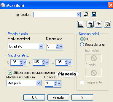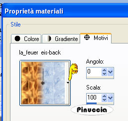 qui puoi trovare qualche risposta ai tuoi dubbi. Se l'argomento che ti interessa non è presente, ti prego di segnalarmelo. Questo tutorial è stato scritto con PsP X, ma può essere eseguito anche con le altre versioni di PSP. Il copyright del tutorial appartiene a Laguna Azul. Il copyright della traduzione a me. Il copyright dei tubes ai rispettivi artisti. Per favore, rispetta il lavoro degli autori. Occorrente: Materiale qui Filtro: FM Tile Tools - Blend Emboss qui I tubes delle donne e dell'occhio sono di Suzi Sgai Metti la Maschera 20-20 nella cartella Maschere. 1. Apri una nuova immagine trasparente 750 x 520 pixels. Imposta il colore di primo piano con #ffcc865, e il colore di sfondo con #a0badd. Passa il colore di primo piano a Gradiente di primo piano/sfondo, con i seguenti settaggi. ![]() Riempi l'immagine trasparente con questo gradiente.2. Apri l'immagine "Eis_la" e vai a Modifica>copia. Torna al tuo lavoro e vai a Modifica>Incolla come nuovo livello. Livelli>Carica/Salva maschera>Carica maschera da disco. Cerca e carica la maschera 20-20 con i seguenti settaggi: ![]() Livelli>Unisci>Unisci gruppo. Sposta l'immagine nell'angolo in alto a sinistra.Apri l'immagine "feuer_la" e vai a Modifica>Copia. Torna al tuo lavoro e vai a Modifica>Incolla come nuovo livello. Livelli>Carica/Salva maschera>Carica maschera da disco. Cerca e carica la maschera 20-20, con i settaggi precedenti. Livelli>Unisci>Unisci gruppo. Sposta l'immagine nell'angolo in alto a destra.![]() 3. Apri il tube SS_524 e vai a Modifica>copia. Torna al tuo lavoro e vai a Modifica>Incolla come nuovo livello. Immagine>Ridimensiona, all'82%, tutti i livelli non selezionato. Regola>Messa a fuoco>Metti a fuoco. Sposta il tube nell'angolo in alto a sinistra.Apri il tube "la_eyes-05", e vai a Modifica>Copia. Torna al tuo lavoro e vai a Modifica>Incolla come nuovo livello. Sposta l'occhio nell'angolo in alto a destra.![]() Cambia la modalità di miscelatura di questi due livelli con l'occhio in Luce netta, e abbassa l'opacità al 57%. 4. Attiva lo strumento Selezione , rettangolo,clicca sull'icona Selezione personalizzata ![]() e imposta i seguenti settaggi: ![]() Livelli>Nuovo livello raster. Riempi la selezione con il gradiente.Effetti>Effetti 3D>Sfalsa ombra, con i seguenti settaggi, colore nero. ![]() Cambia la modalità di miscelatura di questo livello in Moltiplica. Selezione>Deseleziona. ![]() 5. Apri il tube "la_feuerwolken" e vai a Modifica>Copia. Torna al tuo lavoro e vai a Modifica>Incolla come nuovo livello. Sposta il tube in basso a sinistra.Cambia la modalità di miscelatura di questo livello in Rafforza. Apri il tube "la_eiswolken", e vai a Modifica>Copia. Torna al tuo lavoro e vai a Modifica>Incolla come nuovo livello. Sposta il tube in basso a destra.Cambia la modalità di miscelatura di questo livello in Rafforza. ![]() 6. Apri il tube SS_394, e vai a Modifica>copia. Torna al tuo lavoro e vai a Modifica>Incolla come nuovo livello. Immagine>Rifletti. Livelli>Carica/Salva maschera>Carica maschera da disco. Cerca e carica la maschera 20-20 con i settaggi precedenti. Livelli>Unisci>Unisci gruppo. Immagine>Ridimensiona, all'85%, tutti i livelli non selezionato. Regola>Messa a fuoco>Metti a fuoco. Sposta il tube sotto l'occhio sinistro.7. Apri il tube SS_545, e vai a Modifica>copia. Torna al tuo lavoro e vai a Modifica>Incolla come nuovo livello. Livelli>Carica/Salva maschera>Carica maschera da disco. Cerca e carica la maschera 20-20, con i settaggi precedenti. Livelli>Unisci>Unisci gruppo. Immagine>Ridimensiona, all'85%, tutti i livelli non selezionato. Regola>Messa a fuoco>Metti a fuoco. Sposta il tube sotto l'occhio destro.![]() 8. Apri il tube "la_eiswürfel", e vai a Modifica>copia. Torna al tuo lavoro e vai a Modifica>Incolla come nuovo livello. Immagine>Ridimensiona, al 60%, tutti i livelli non selezionato. Regola>Messa a fuoco>Metti a fuoco. Immagine>Rifletti. Sposta il tube nell'angolo in basso a destra.Cambia la modalità di miscelatura di questo livello in Filtra. Livelli>Disponi>Sposta giù. Attiva il livello superiore. Apri il tube mds2247Flamme03.02.07pspimage, e vai a Modifica>copia. Torna al tuo lavoro e vai a Modifica>Incolla come nuovo livello. Sposta il tube nell'angolo in basso a sinistra.![]() Livelli>Unisci>Unisci tutto. 9. Immagine>Aggiungi bordatura, 2 pixels, simmetriche, con il colore nero. Immagine>Aggiungi bordatura, 25 pixels, simmetriche, con il colore bianco. Seleziona il bordo bianco con la bacchetta magica ![]() ![]() Apri il tube "la_feuer & eis-back" e minimizzalo nella tua area di lavoro. Passa il colore di primo piano a Motivi. Apri il menu cliccando sulla freccia a fianco del box, e cerca l'immagine nella lista dei motivi disponibili, imposta il motivo: ![]() Riempi la selezione con questo motivo.Effetti>Effetti artistici>Mezzitoni, con i seguenti settaggi: ![]() Effetti>Effetti 3D>Ritaglio, con i seguenti settaggi: ![]() Effetti>Plugins>FM Tile Tools - Blend Emboss, con i settaggi standard, per due volte. ![]() Selezione>Deseleziona. Immagine>Aggiungi bordatura, 2 pixels, simmetriche, con il colore nero. 9. Apri il tube "la_and", e vai a Modifica>Copia. Torna al tuo lavoro e vai a Modifica>Incolla come nuovo livello. Posiziona la scritta al centro, in basso.Aggiungi il tuo nome e/o il tuo watermark. Livelli>Unisci>Unisci tutto. ![]() Copia l'immagine: Modifica>Copia. Apri Animation Shop e vai a Modifica>Incolla>Incolla come nuova animazione. Modifica>Duplica, e ripeti finchè non avrai dieci fotogrammi. Clicca sul primo fotogramma per selezionarlo e vai a Modifica>Seleziona tutto. Apri "la_wordart_fire". Clicca sul primo fotogramma per selezionarlo e vai a Modifica>Seleziona tutto e poi Modifica>Copia. Torna al tuo lavoro e vai a Modifica>Incolla>Incolla nel fotogramma selezionato. Posiziona la scritta in basso a sinistra e, quando sei certo di aver trovato la posizione corretta, rilascia il tasto del mouse. Apri "la_wordart_fire", e ripeti i passaggi precedenti per incolla