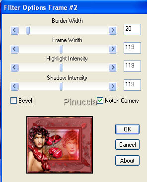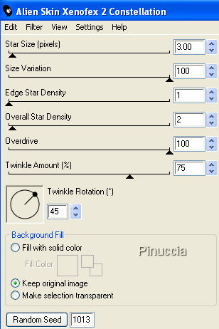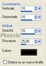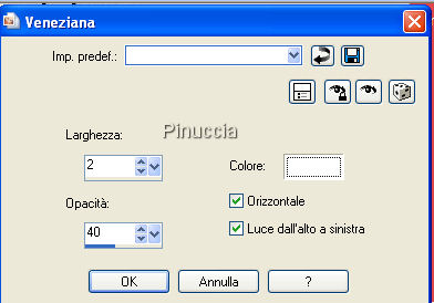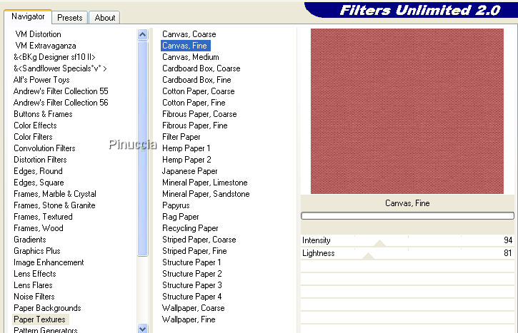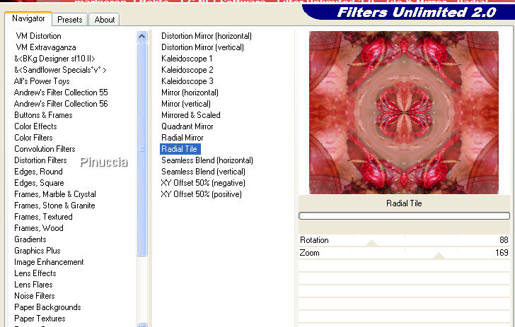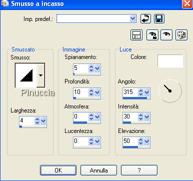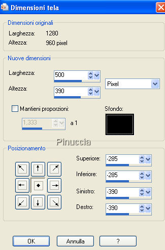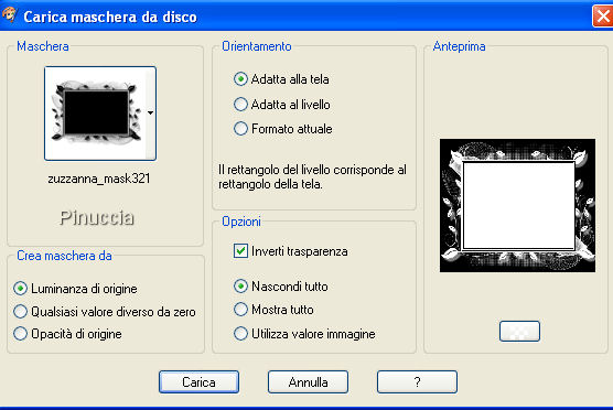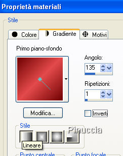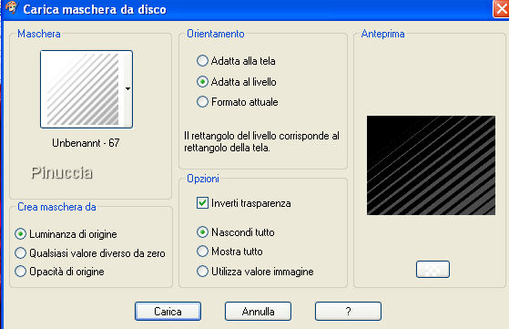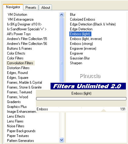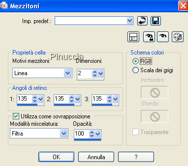 qui puoi trovare qualche risposta ai tuoi dubbi. Se l'argomento che ti interessa non è presente, ti prego di segnalarmelo. Questo tutorial è stato scritto con PSP X, ma può essere eseguito anche con le altre versioni di PSP. Il copyright del tutorial appartiene a Laguna Azul. Il copyright della traduzione è mio. Il copyright dei tubes e delle immagini è dei rispettivi artisti. Per favore, rispetta il lavoro degli autori. Occorrente: Materiale qui Metti le maschere nella cartella Maschere. Filtri: Bordermania qui Filters Unlimited 2.0 qui Xenofex 2 qui Apri l'immagine "159", che sarà la base del tuo lavoro. Immagine>Dimensione tela, con i seguenti settaggi: ![]() Regola>Sfocatura>Sfocatura gaussiana, raggio 20. ![]() Effetti>Plugins>Filters Unlimited 2 - Convolution Filter - Emboss(strong), con i settaggi standard - 2 volte. ![]() 2. Apri il tube "la_misc-06", e vai a Modifica>Copia. Torna al tuo lavoro e vai a Modifica>Incolla>Incolla come nuovo livello e spostalo come nell'esempio.![]() Cambia la modalità di miscelatura di questo livello in Filtra. 3. Livelli>Nuovo livello raster. Imposta il colore di primo piano con #8e0002, e riempi il livello con questo colore.Livelli>Carica/Salva maschera>Carica maschera da disco. Cerca e carica la maschera Unbenannt-67, con i seguenti settaggi: ![]() Livelli>Unisci>Unisci gruppo. Immagine>Rifletti. Immagine>Capovolgi. Effetti>Plugins>Filters Unlimited 2.0 - Convolutions Filters - Emboss(strong). 4. Apri il tube jet-woman15-september-2007, e vai a Modifica>Copia. non chiuderlo, perchè ti servirà ancora. Torna al tuo lavoro e vai a Modifica>Incolla>Incolla come nuovo livello. Sposta il tube a destra, come nel mio esempio:![]() Cambia la modalità di miscelatura di questo livello in Sovrapponi, e abbassa l'opacità al 60%. 5. Apri il tube "la_flower-18_anthurium", e vai a Modifica>Copia. Torna al tuo lavoro e vai a Modifica>Incolla>Incolla come nuovo livello. Immagine>Ridimensiona, al 70%, tutti i livelli non selezionato. Regola>Messa a fuoco>Metti a fuoco. Sposta il tube a sinistra.Effetti>Effetti 3D>Sfalsa ombra, con i seguenti settaggi, colore nero. ![]() Livelli>Unisci>Unisci tutto. 6. Immagine>Aggiungi bordatura, 1 pixel, simmetriche, con il colore nero. Immagine>Aggiungi bordatura, 4 pixels, simmetriche, con il colore di primo piano. Immagine>Aggiungi bordatura, 1 pixel, simmetriche, con il colore nero. Seleziona il bordo rosso con la bacchetta magica ![]() ![]() Effetti>Effetti 3D>Smusso a incasso: ![]() Effetti>effetti artistici>Mezzitoni, con i seguenti settaggi: ![]() Selezione>Nessuna selezione. 7. Immagine>Aggiungi bordatura, 18 pixels, simmetriche, con il colore bianco. Seleziona questo bordo con la bacchetta magica ![]() e riempilo con il colore di primo piano.Effetti>Effetti di trama>Veneziana, con i seguenti settaggi. ![]() Selezione>Deseleziona. Ripeti ancora una volta il punto 6. Immagine>Ridimensiona, all'80%, tutti i livelli selezionato. Regola>Messa a fuoco>Metti a fuoco. Livelli>Innalza livello di sfondo. 8. Immagine>Dimensione tela: ![]() Livelli>Nuovo livello raster. Imposta il colore di primo piano con #b86262, e riempi il livello con questo colore.Livelli>Disponi>Sposta giù. Effetti>Plugins>Filters Unlimited 2 - Paper Textures - Canvas, Fine, con i seguenti settaggi: ![]() Effetti>Plugins>Filters Unlimited 2 - Convolutions Filters - Emboss (light), con i settaggi standard. ![]() 9. Livelli>Nuovo livello raster. Imposta il colore di primo piano con #710304, e il colore di sfondo con #e44a4b. Passa il colore di primo piano a Gradiente di primo piano/sfondo, con i seguenti settaggi. ![]() Riempi il livello con il gradiente.Livelli>Carica/Salva maschera>Carica maschera da disco. Cerca e carica la maschera zuzzanna_mask321, con i seguenti settaggi: ![]() Livelli>Unisci>Unisci gruppo. Effetti>Effetti 3D>Sfalsa ombra, con i seguenti settaggi, colore nero: ![]() Effetti>Plugins>Alien Skin Xenofex 2 - Constellation, con i seguenti settaggi: ![]() 10. Attiva nuovamente il tube jet-woman15-september-2007, e vai a Modifica>Copia. Torna al tuo lavoro e vai a Modifica>Incolla>Incolla come nuovo livello. Immagine>Ridimensiona, al 70%, tutti i livelli non selezionato. Regola>Messa a fuoco>Metti a fuoco. Effetti>Effetti 3D>sfalsa ombra, con i seguenti settaggi, colore nero: ![]() Immagine>Rifletti. Sposta il tube a sinistra.Livelli>Unisci>Unisci tutto. 11. Immagine>Aggiungi bordatura, 1 pixel, simmetriche, con il colore nero. Immagine>Aggiungi bordatura, 15 pixels, simmetriche, con il colore bianco. Seleziona questo bordo con la bacchetta magica ![]() Effetti>Plugins>Filters Unlimited 2.0 - Tile & Mirror - Radial Tile, con i settaggi standard. ![]() Effetti>Plugins>Bordermania - Frame #2, con i seguenti settaggi: ![]() Effetti>Plugins>Filters Unlimited 2.0 - convolutions Filters - Emboss (strong), con i settaggi standard. Selezione>Nessuna selezione. Immagine>Aggiungi bordatura, 1 pixel, simmetriche, con il colore nero. 12.Facoltativo Apri il tube di testo la_flaminfo_flower_word_art, e vai a Modifica>copia. Torna al tuo lavoro e vai a Modifica>Incolla>Incolla come nuovo livello e posiziona il testo dove preferisci.Se vuoi, scrivi un tuo testo. Aggiungi il tuo nome e/o il tuo watemark, vai a Livelli>Unisci>Unisci tutto, e salva in formato jpg. ![]() ![]() Se hai problemi o dubbi, o trovi un link non funzionante, o anche soltanto per un saluto, scrivimi. 24 Febbraio 2008 |